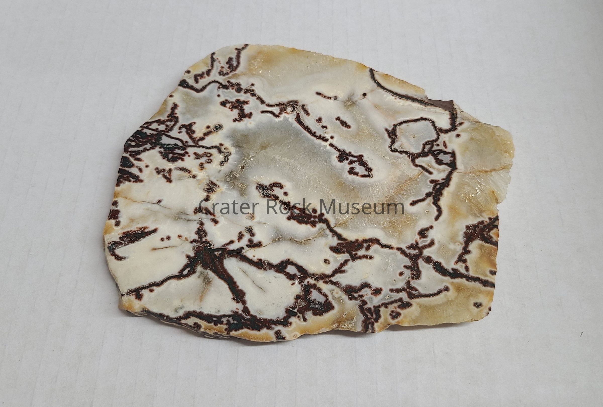 Description: Thin slab with polished face. Creamy white, tan and greenish-gray infused with brown dendritic spotting throughout.