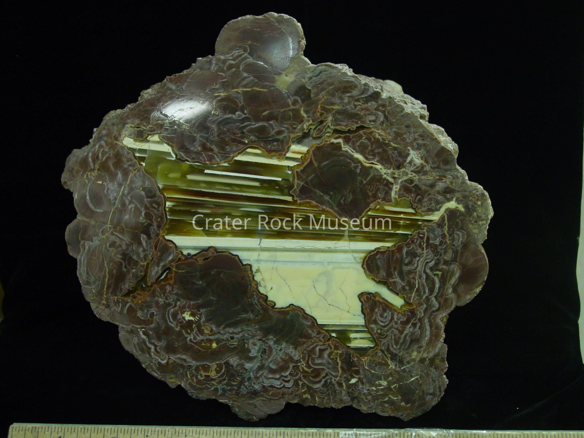 Description: Matrix of this piece is a purplish Rhyolite and center is agate with bedding lines that show movement of the earth over time. Lines are a cream color to browns and grey. Outer rock has many nodules of tan ,purplish and cream colors.Collection