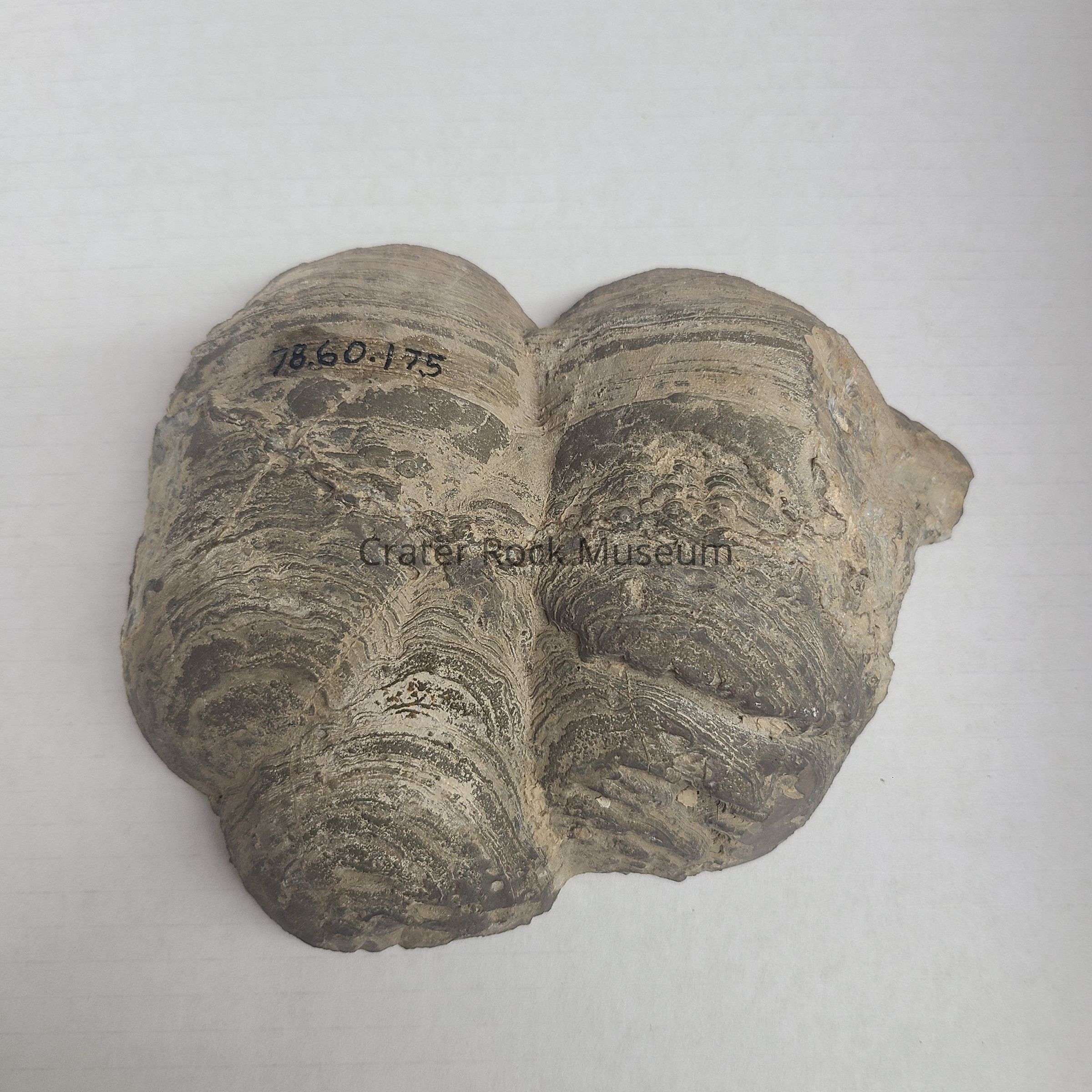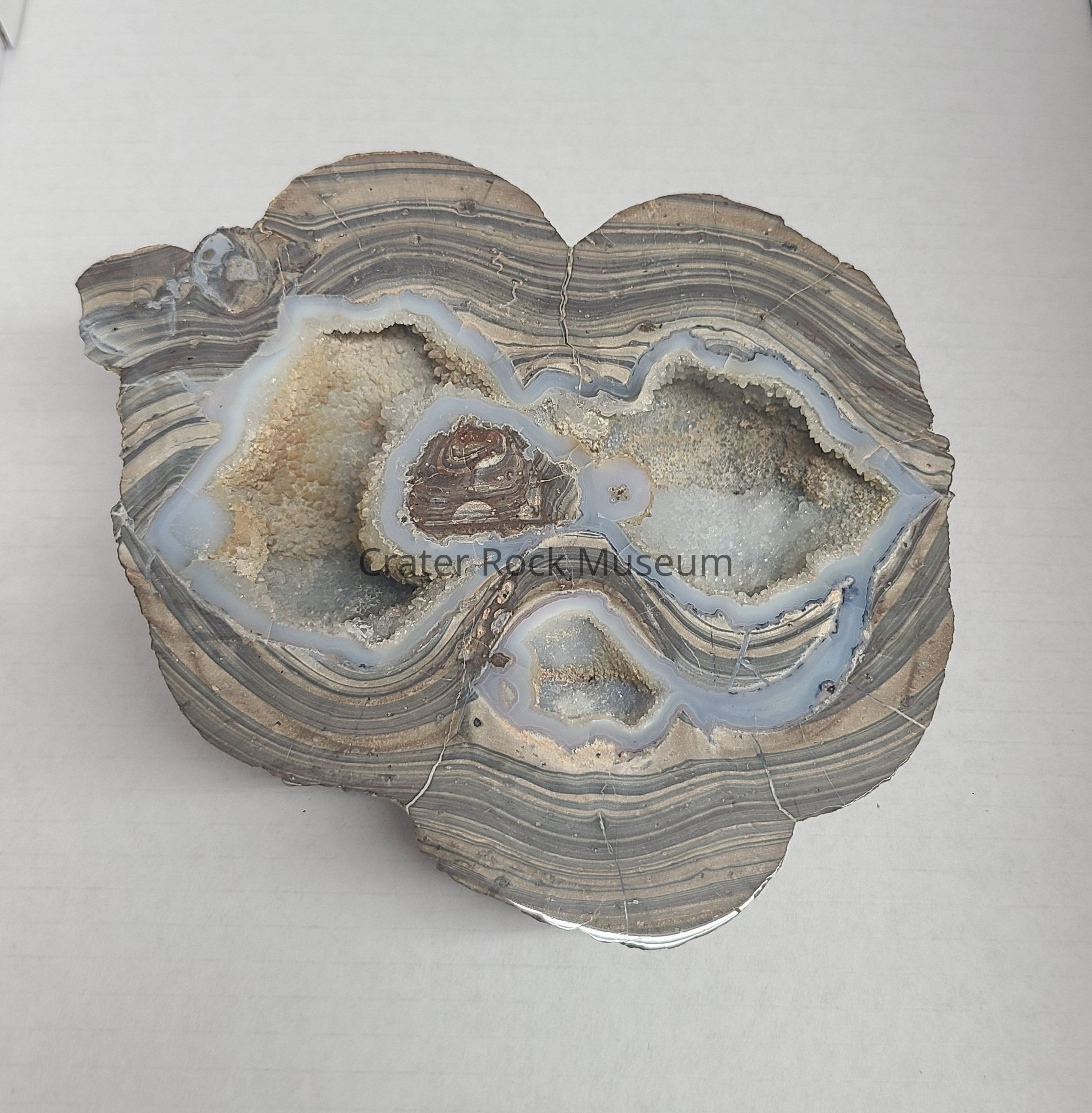 Two Thundereggs one large and one small from Dougway, UT. Cut side shows Crystalline interiors in White and Light Grey, some Tan surrounded by fortified Agate in Light Blue Greys and Red (on smaller). Surrounding rock is in striped Beige, Greys, Reds and Brown. Large egg is a triple chamber. Some surface cracks visible.Dimensions