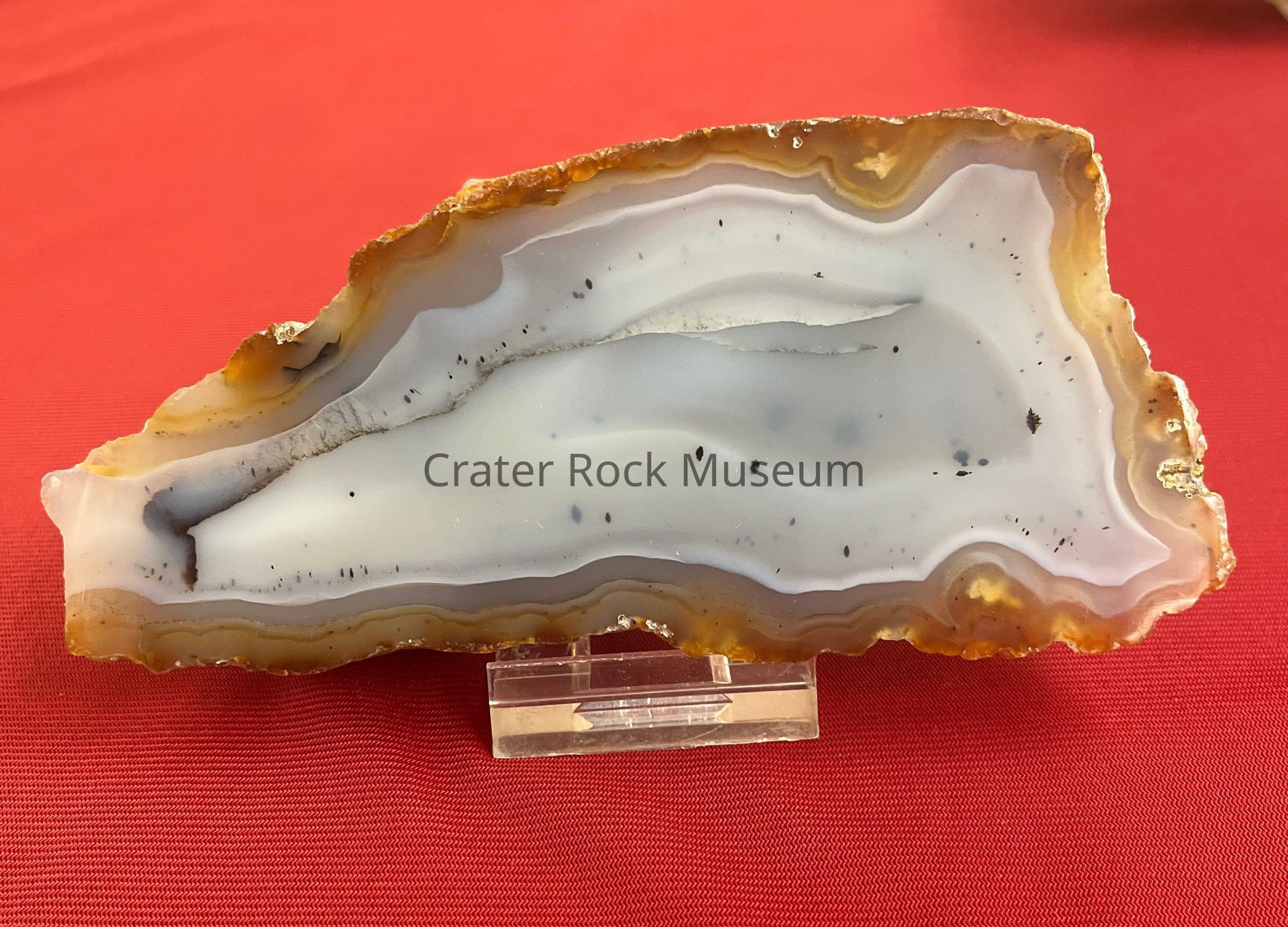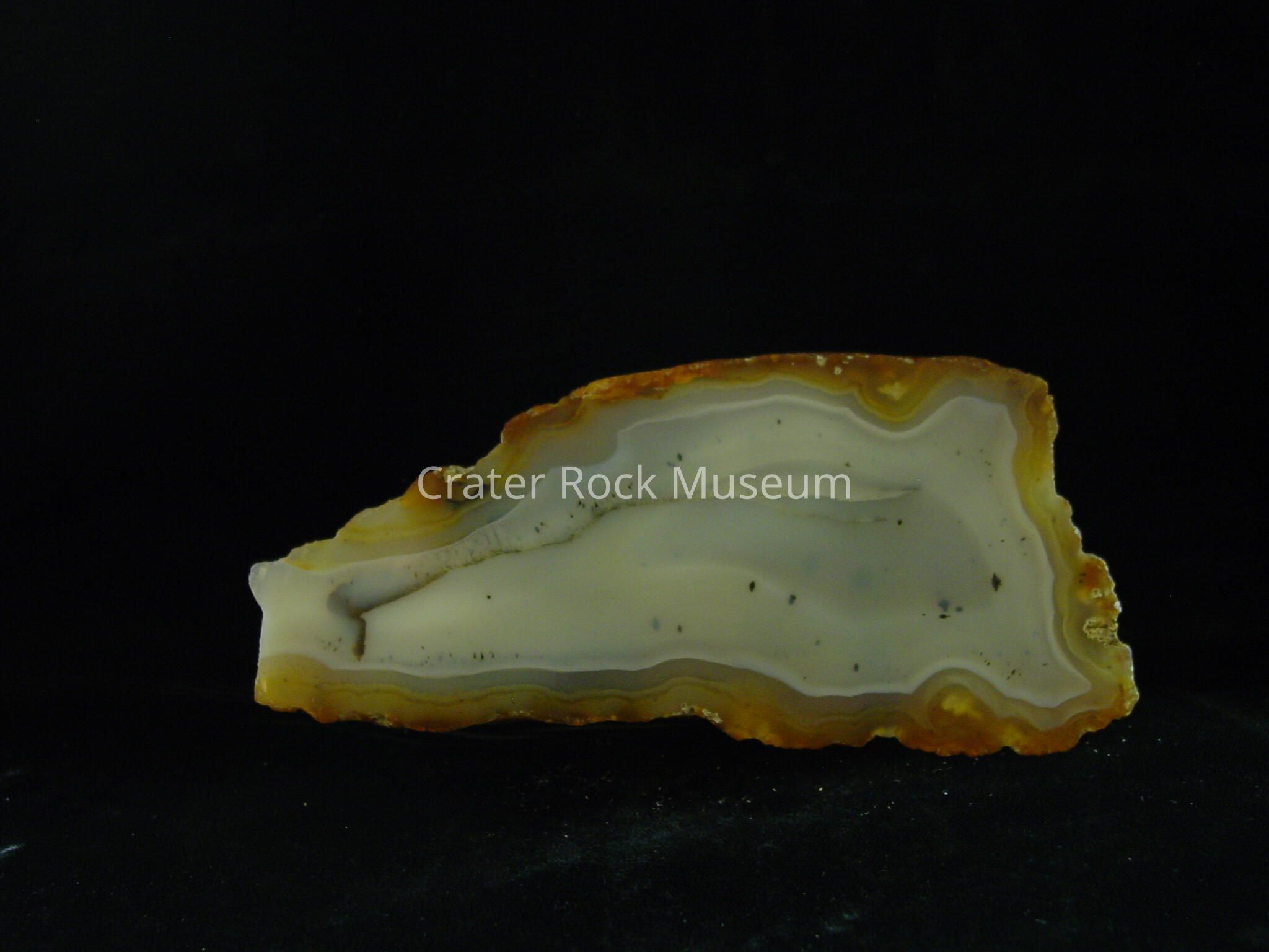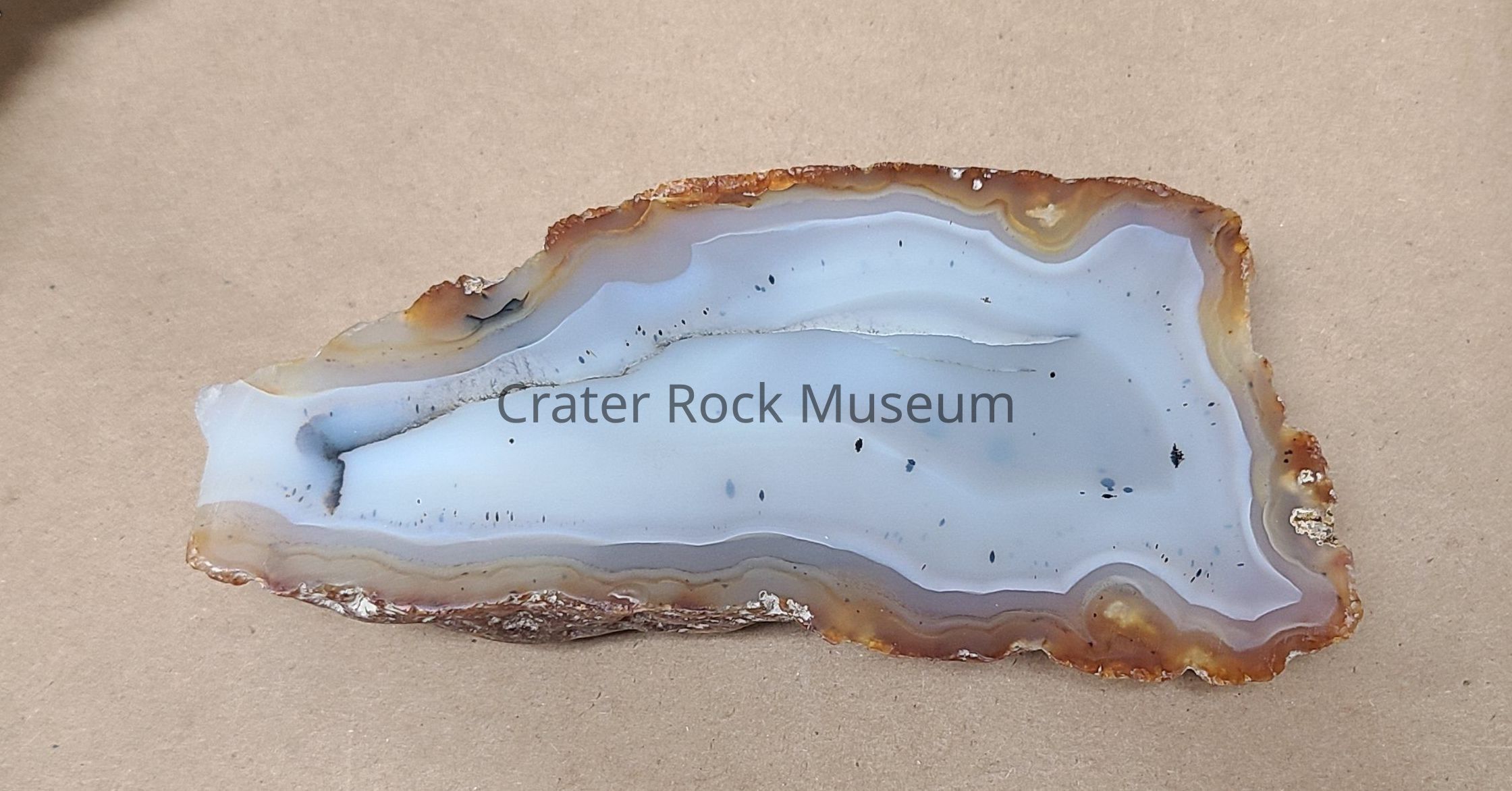 Description: Rounded back with polished face. Reddish-brown outside edges with bluish-gray to creamy white single band and a few black specks throughout inner section.Collection