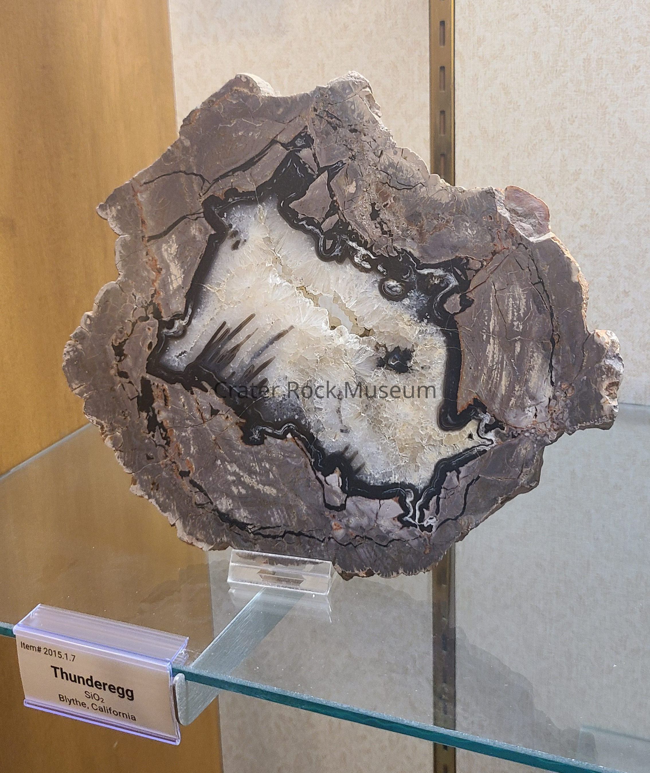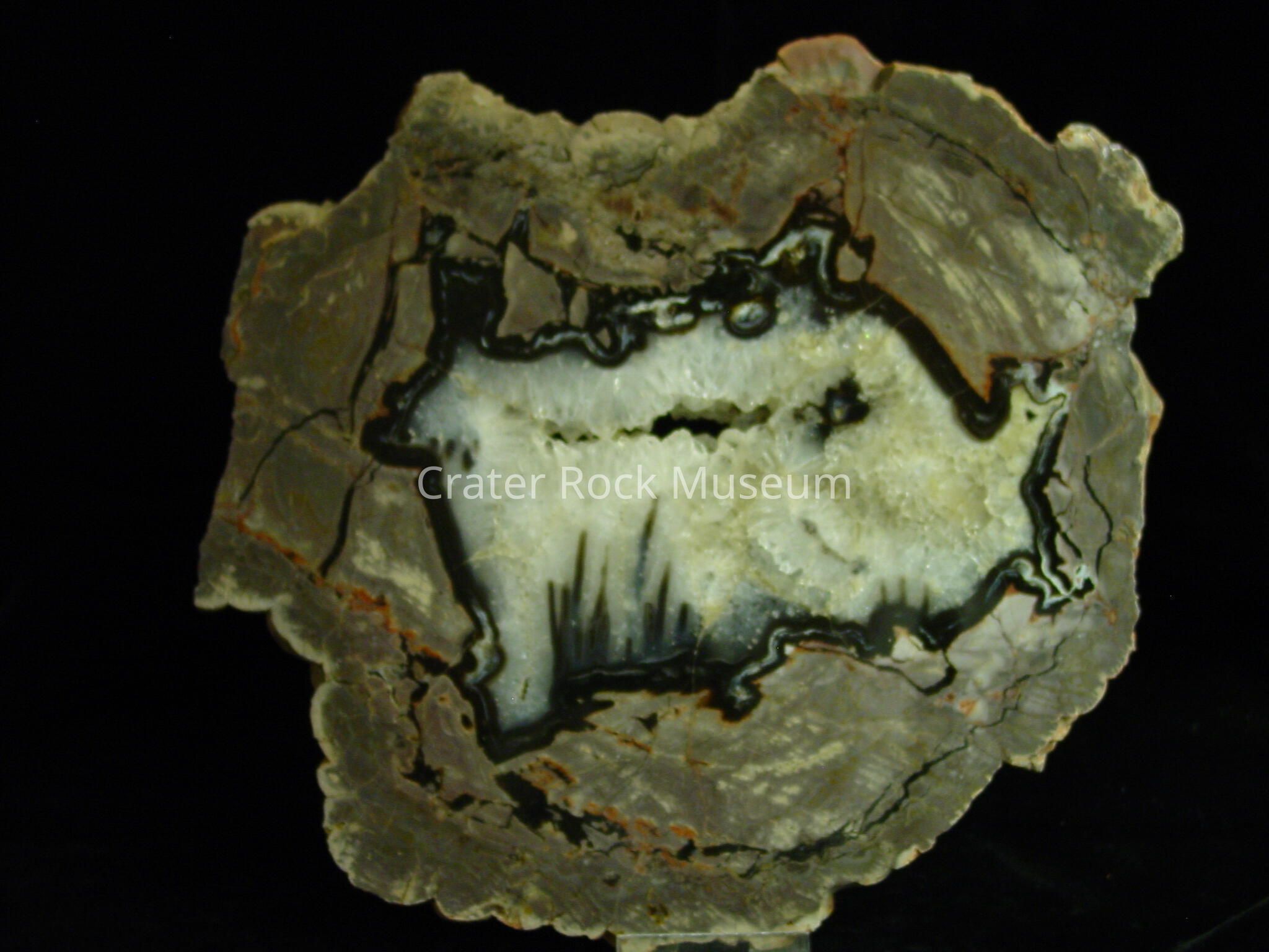 Description: A thin slab with a center of quartz surrounded by a blagk agate outline. Outer agate is a mix of greys, black, red and tans.Collection