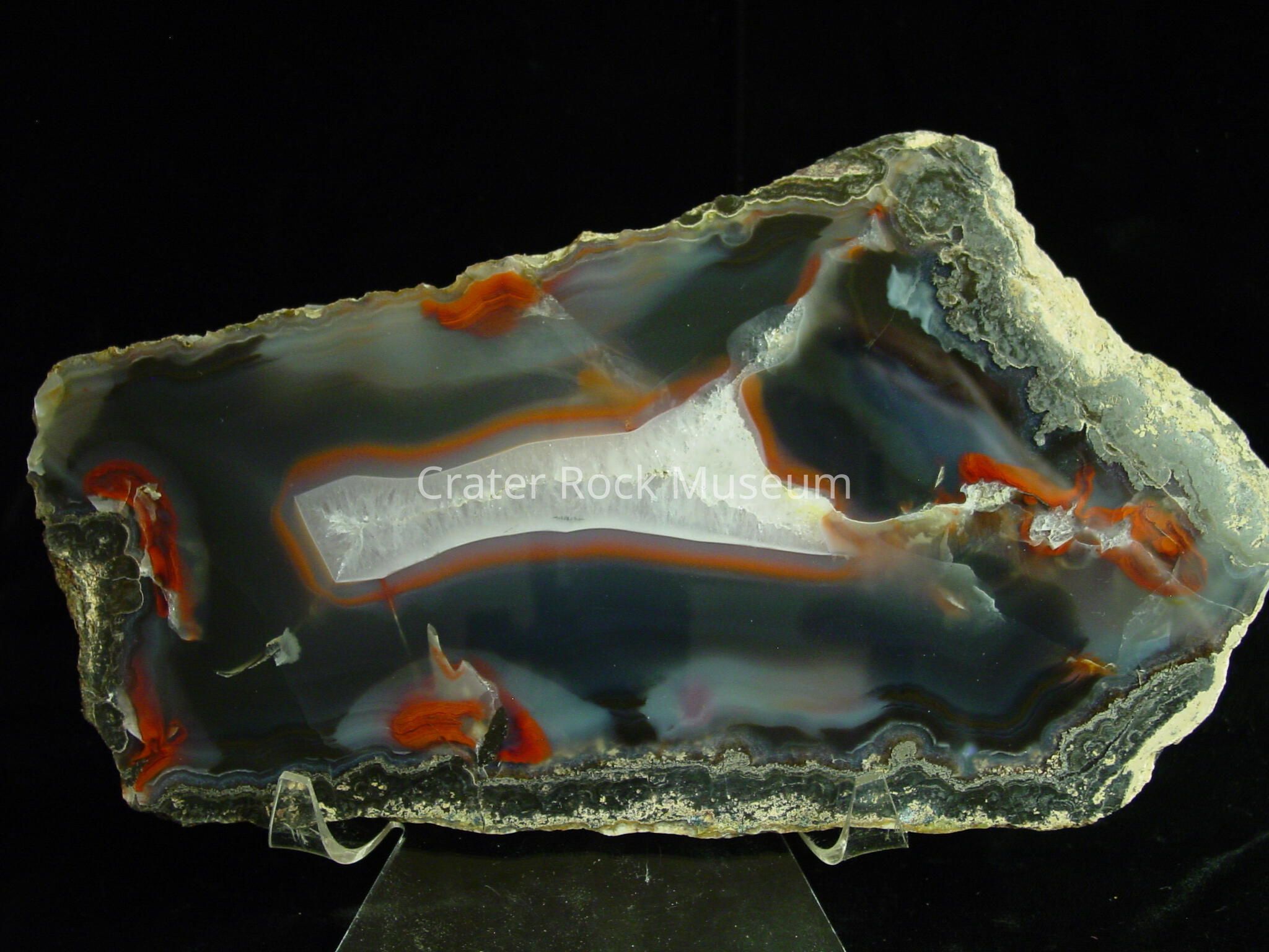 Description: A 1/2" slice of agate from New Mexico. Polished side shows white crystalline center surrounded by fortified agate in greys, red and black. Several red areas seen. Outer rock is an opaque grey and pink. Piece has a brecciated interior.Collection