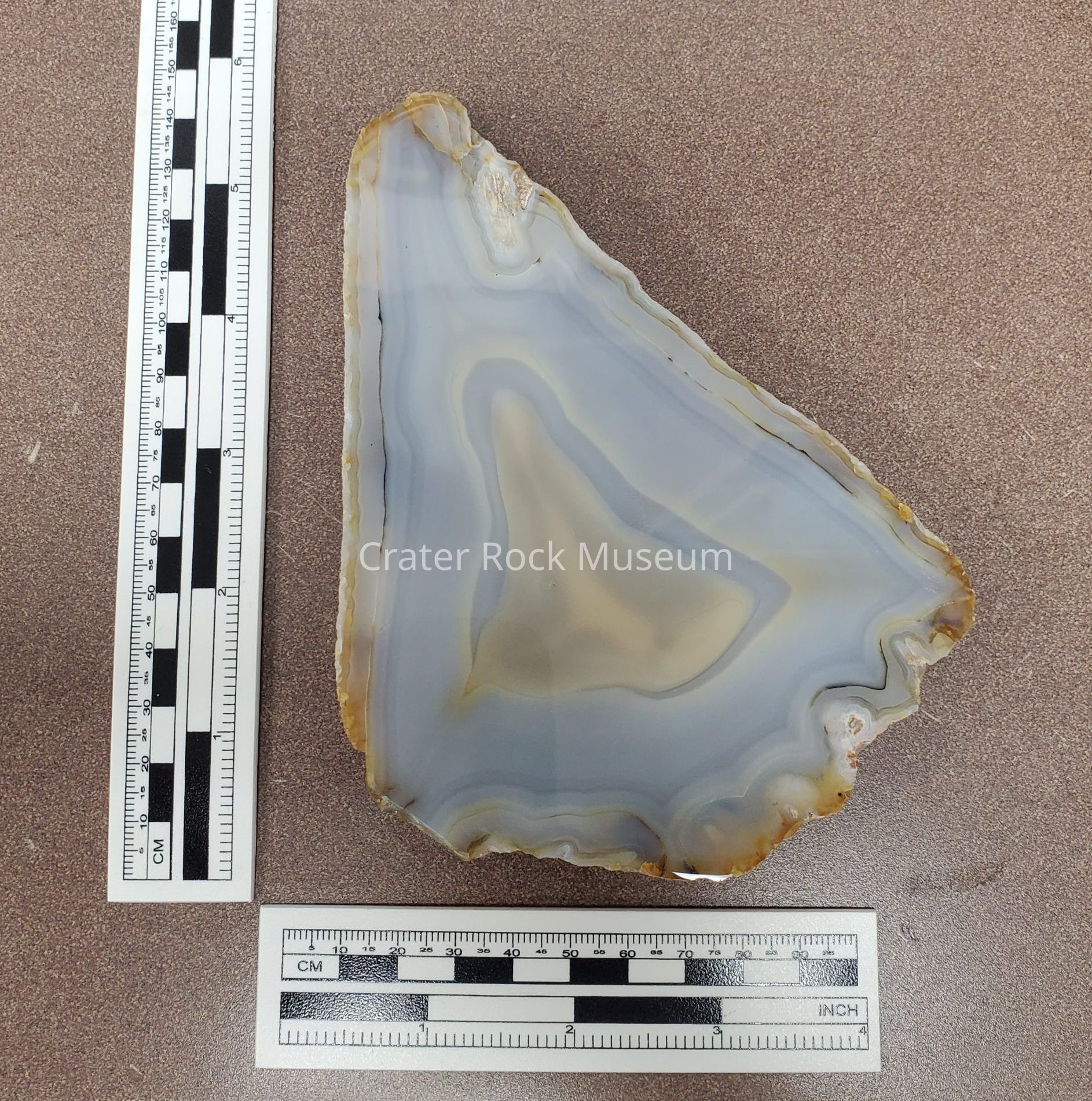 Description: Thin slab with polished face. Burnt yellow on outer edges with some grayish-blue banding and a creamy yellow center.
