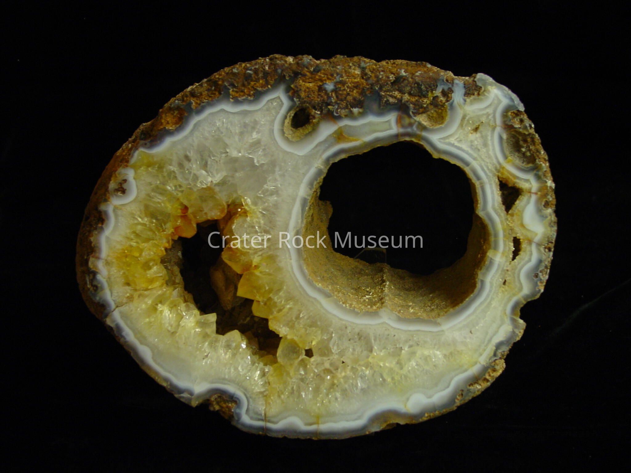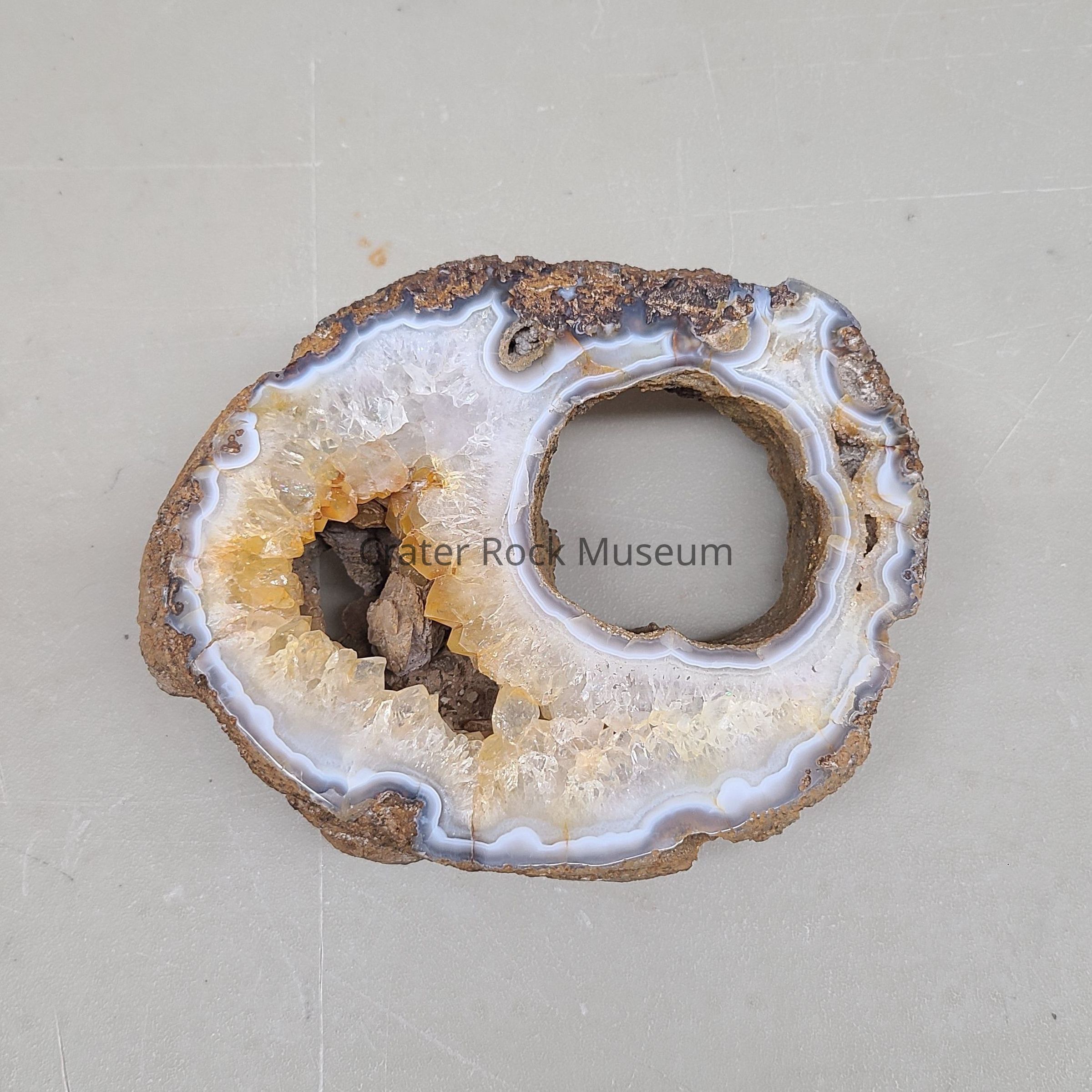 Description: This geode has a 2" hole where the calcite has worn away. There are white fortification bands around one hollow and one quartz filled center. Within the center is a calcite formation. Colors are a honey to white and the rock is a reddish brown.Collection