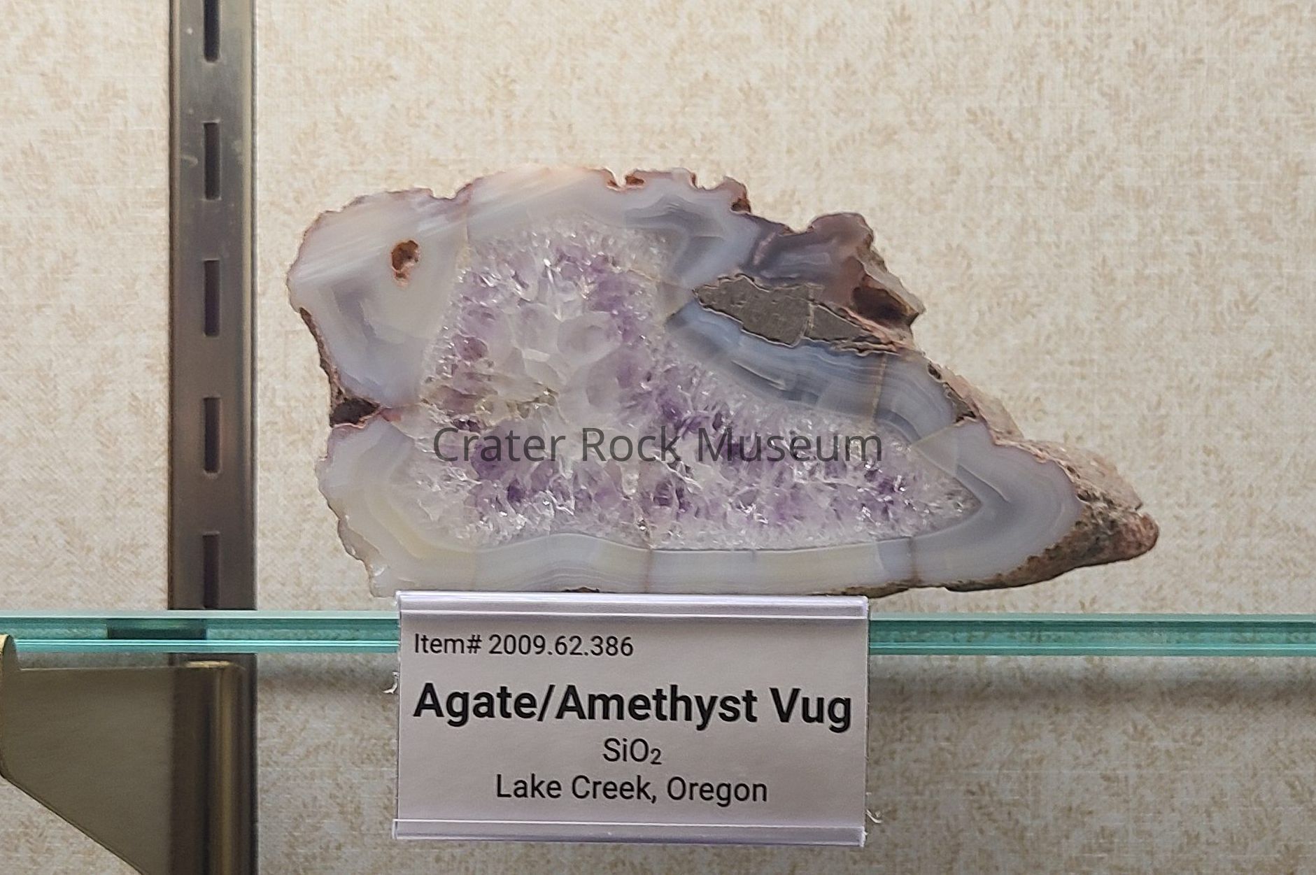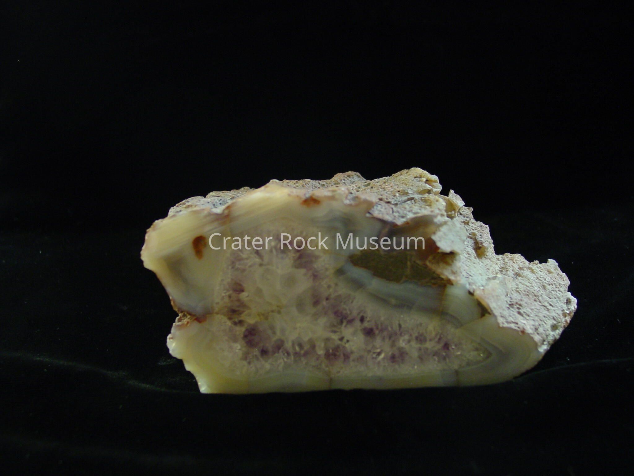 Description: Thick, irregularly shaped specimen with one end cut and polished face. Blue-gray to creamy yellow banding on outside edges with a transparent white and violet crystalline center.Collection