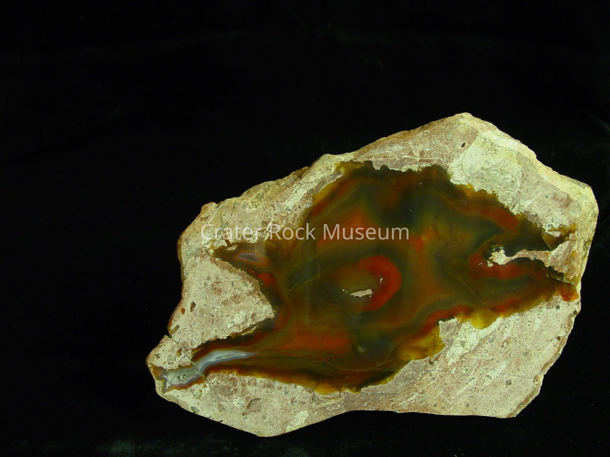 Description: This piece has a brecciated, pinkish rock surrounding an agate that is various shades of red and black. It has the appearance of a nebula.Collection