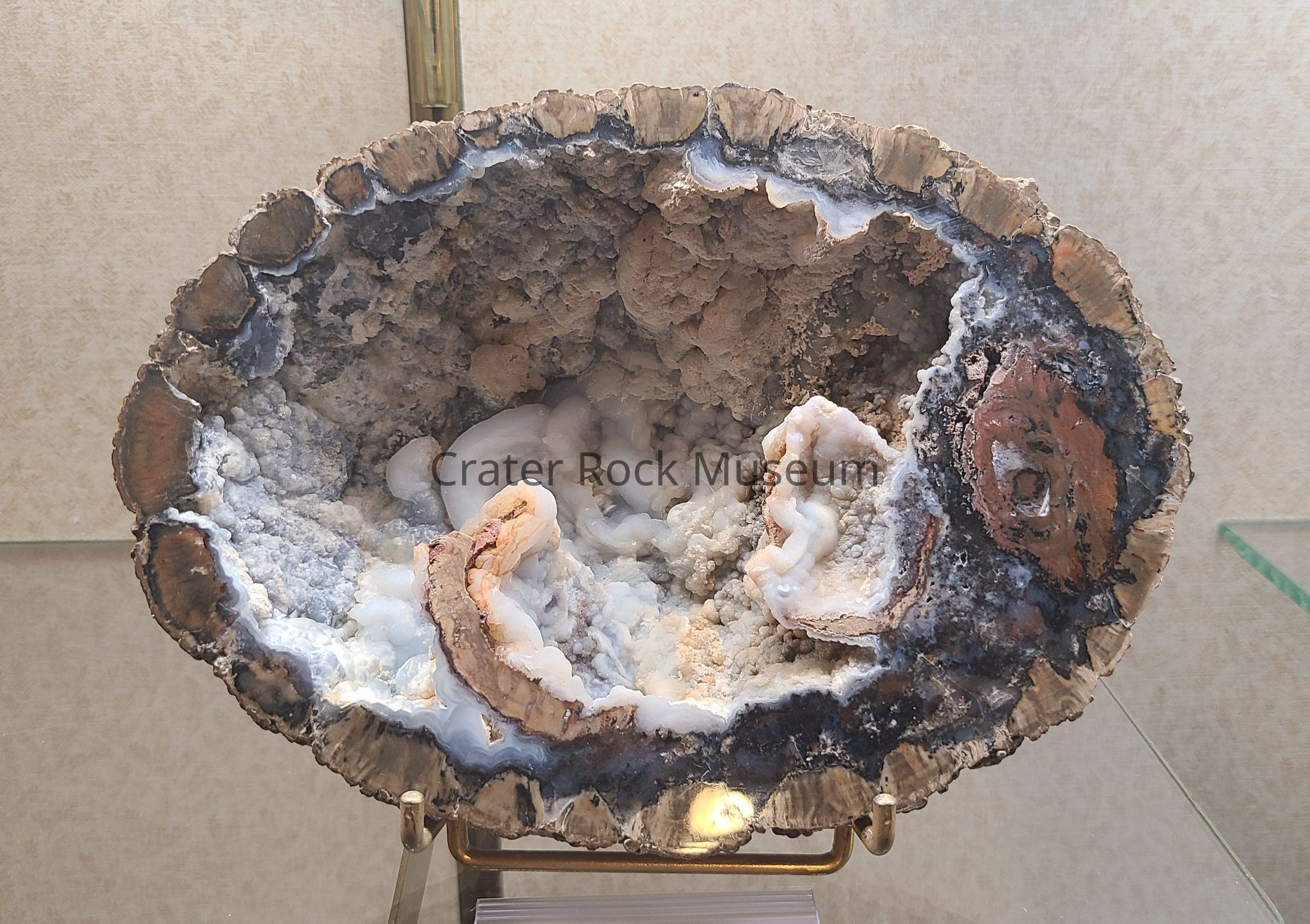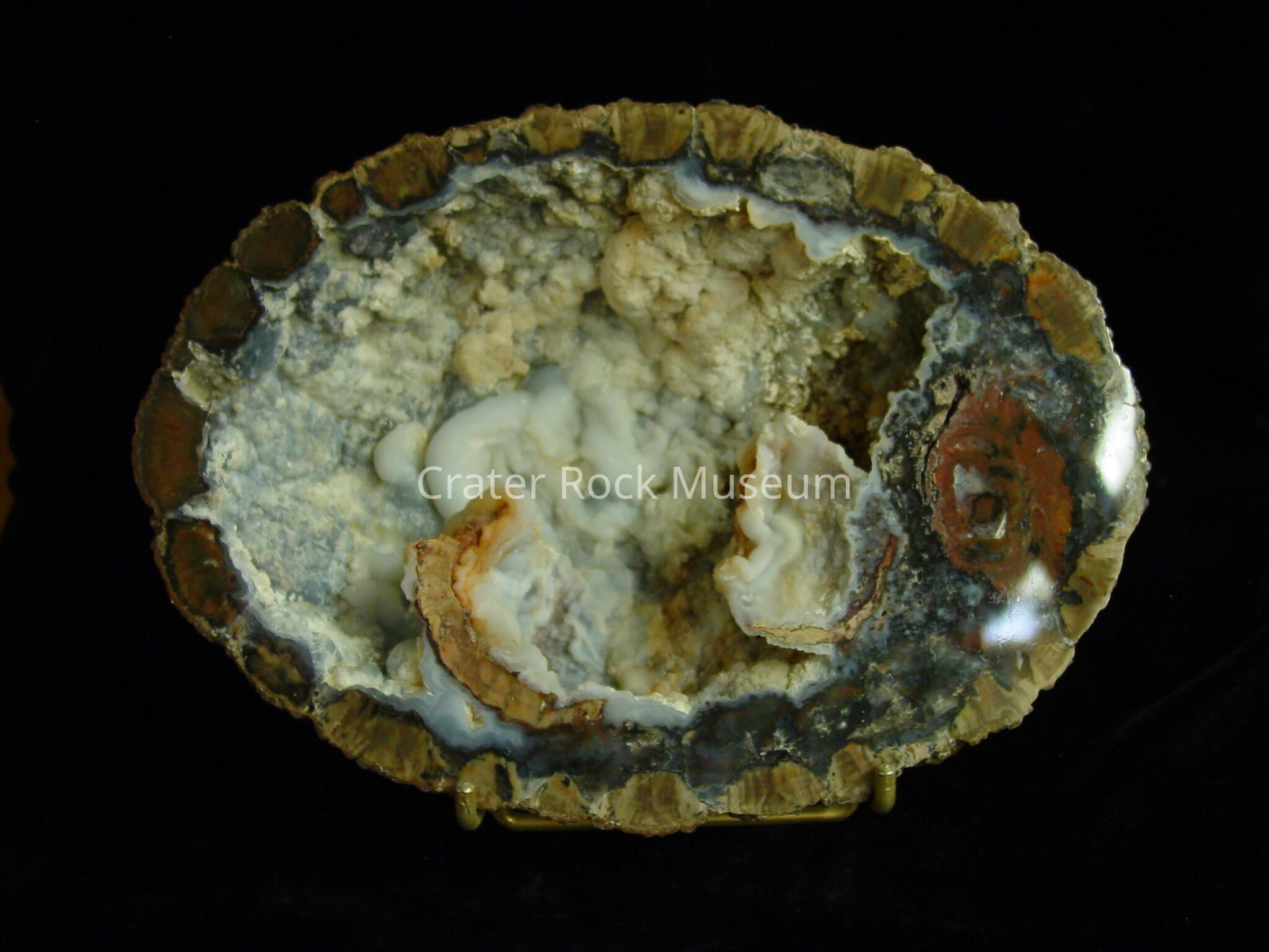 Description: This geode has a large cavity lined with chalcedony in colors from white to light blues to cream and rust. One side has fortified agate that is a reddish brown, black and grey. Surrounding rock is very bumpy and is various shades of brown in color.Collection
