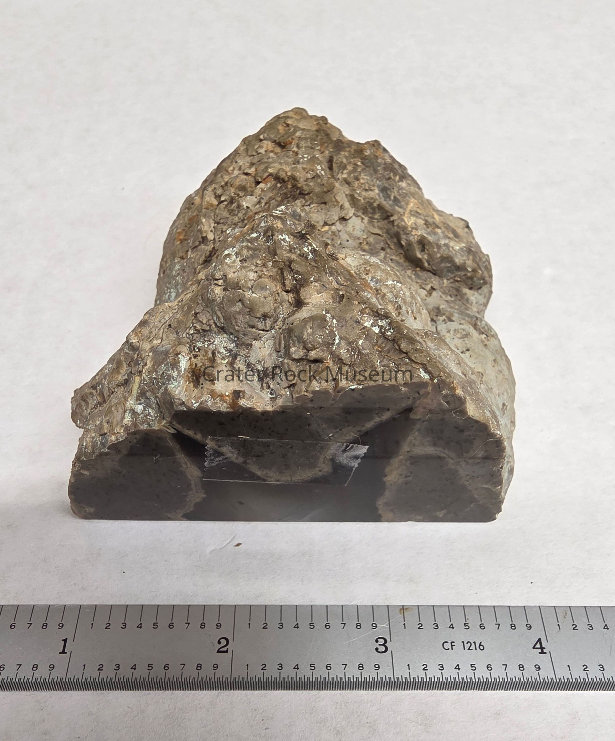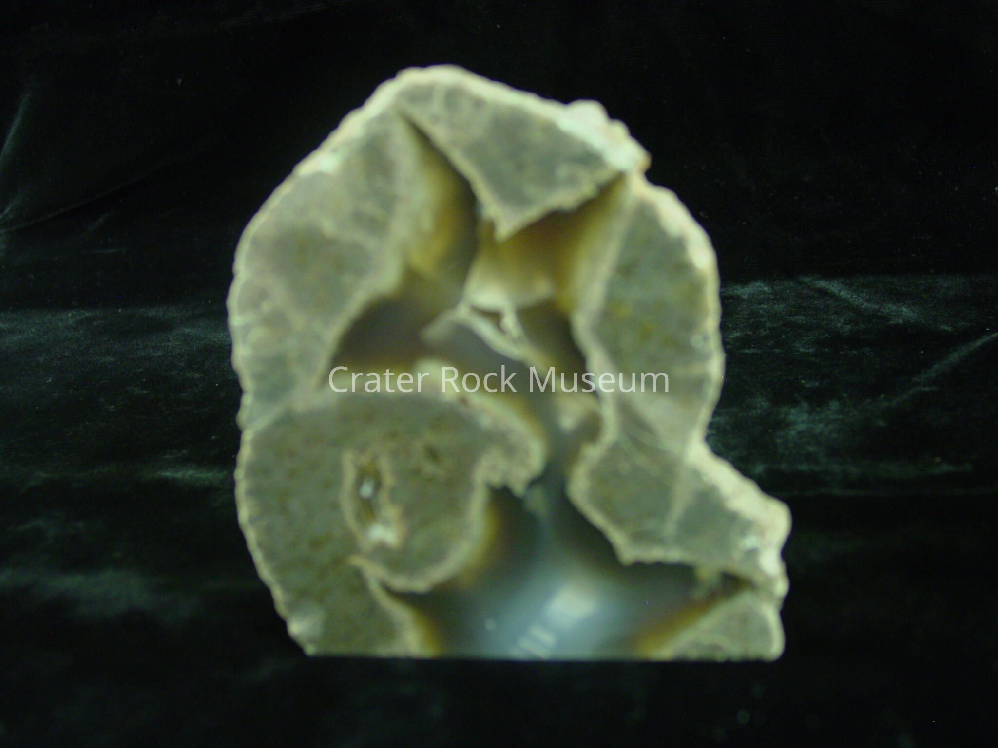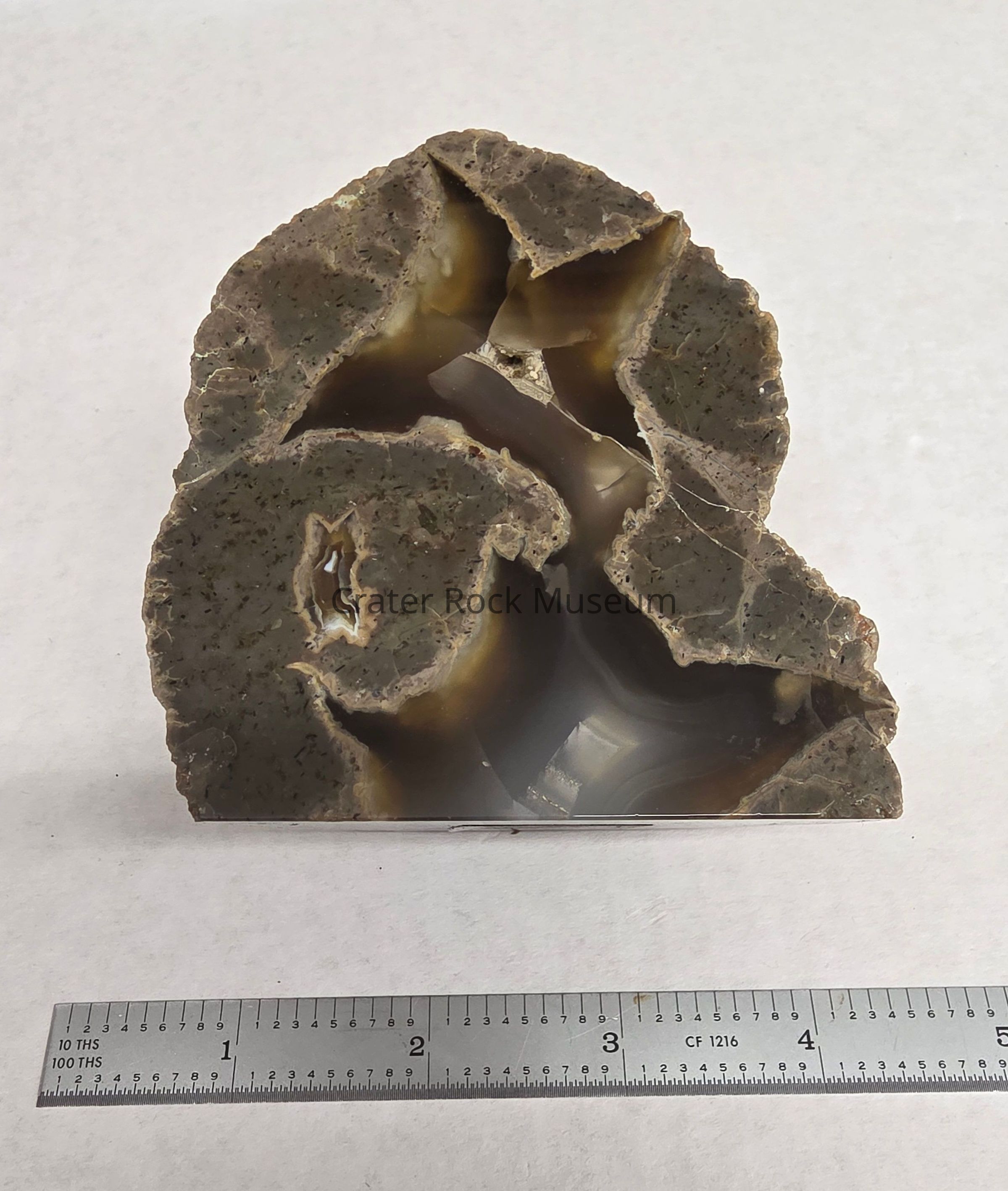 Description: Thick slab with coarse rounded back and polished face. Spotted olive green and gray outer edges, with translucent brown and smokey white centers in a star-like pattern.Collection