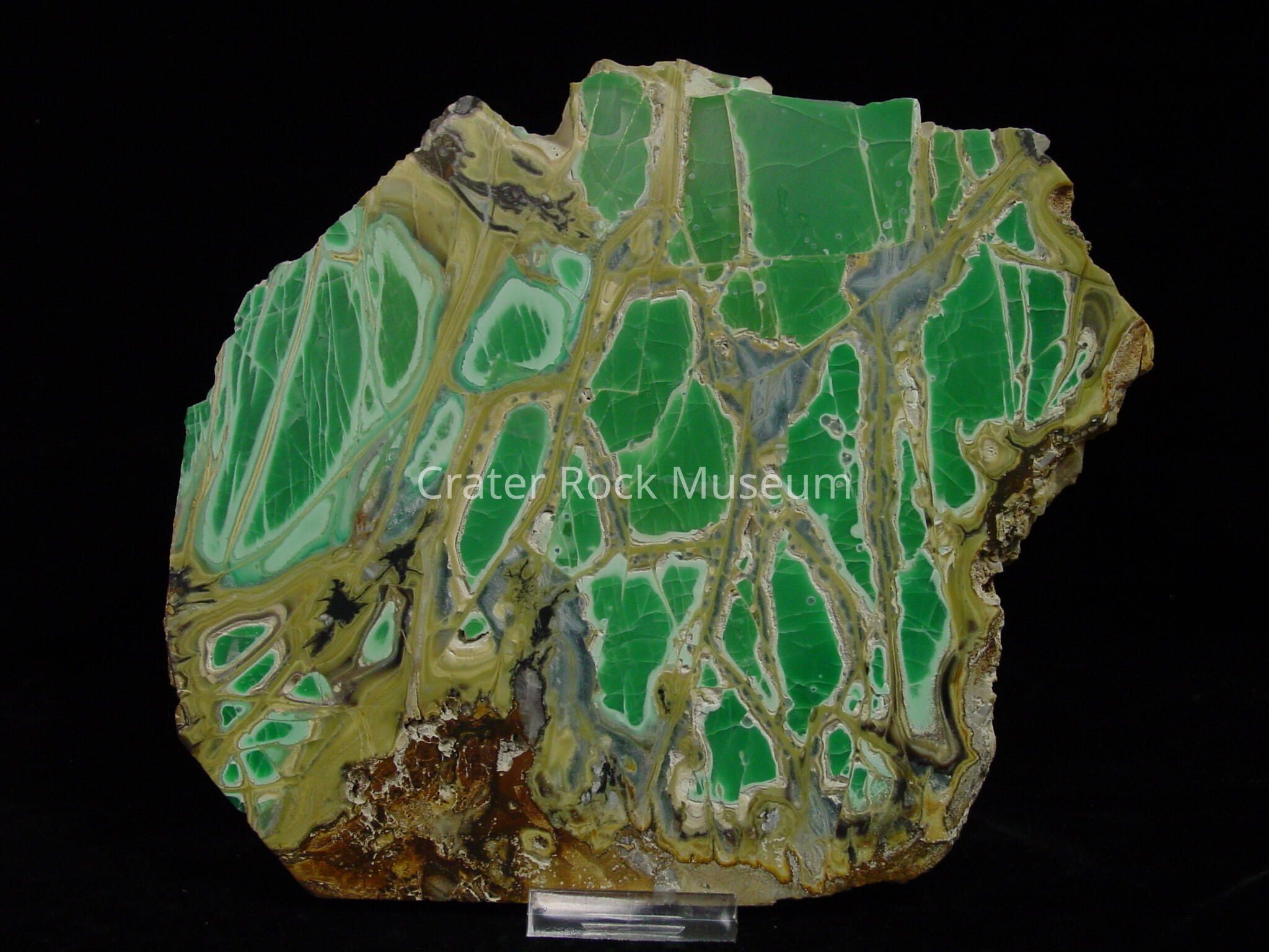 Description: Brecciated chunks of green Variscite in an olive,black and brown rock with grey silicate filler.