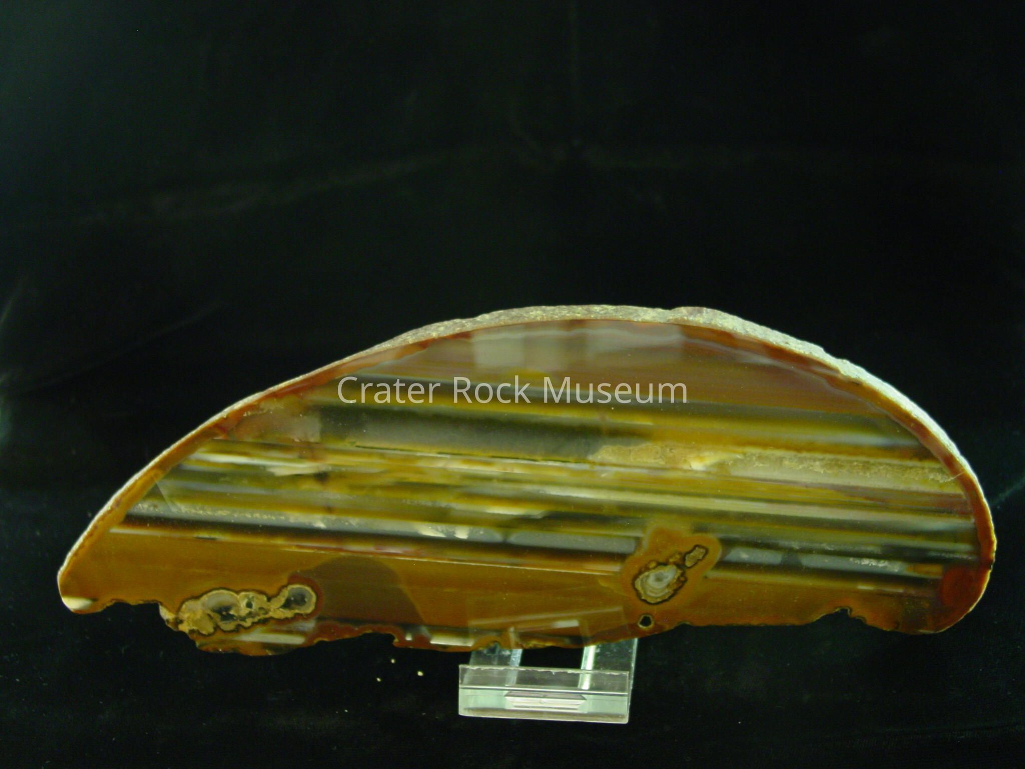 Description: A slice of agate nodule with the polished side showing bedding lines in browns, blues, yellows, reds and white. Some are crystalline. Two circular areas interrupt the thickest brown bedding line. A narrow red band surrounds the edges.Collection