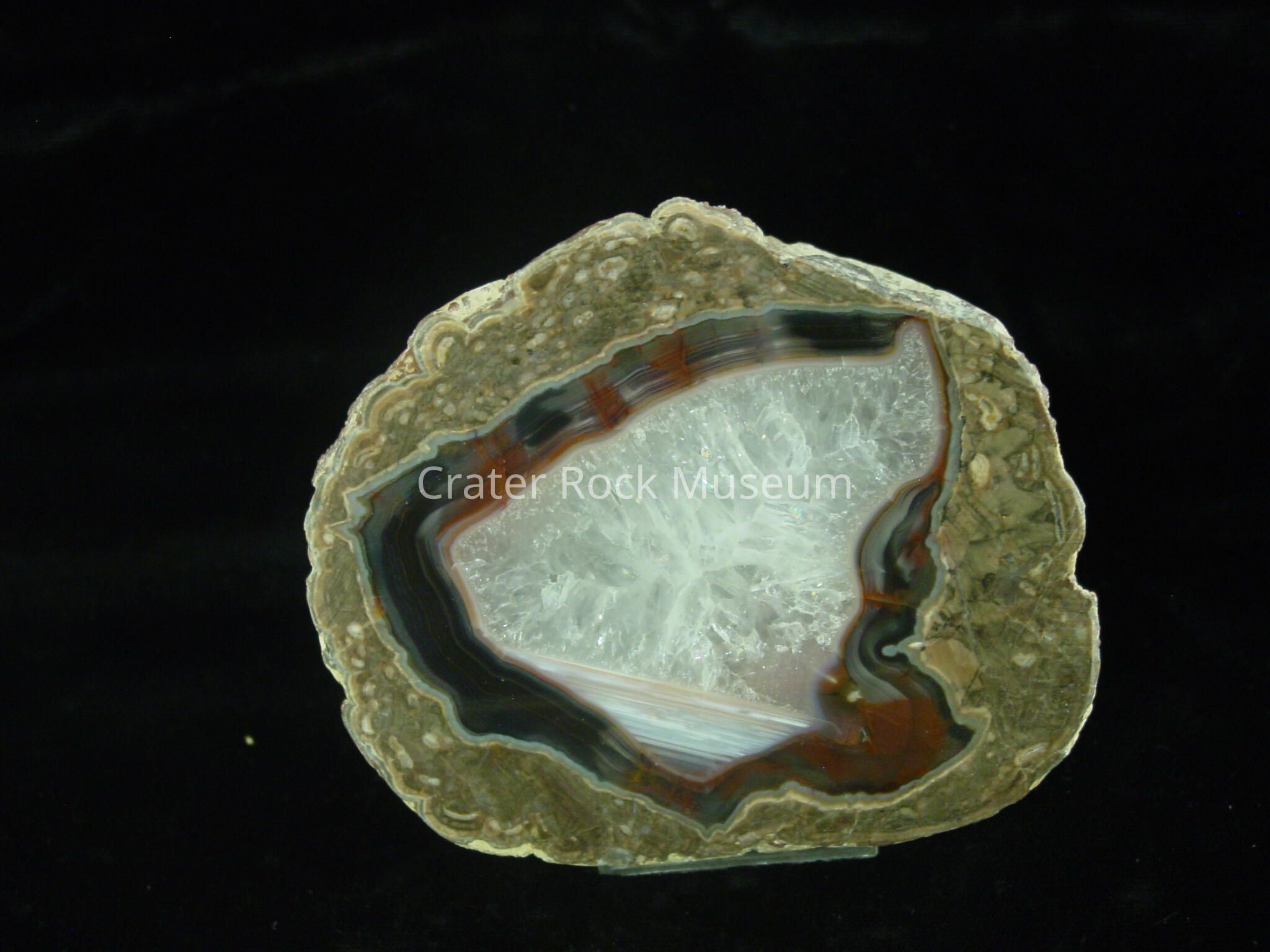 Description: Thick slab with rough, rounded back and polished face. Tan to light brown edges, with an inner area consisting of a pinkish and white outer ring and a translucent smokey green and gray center.Collection
