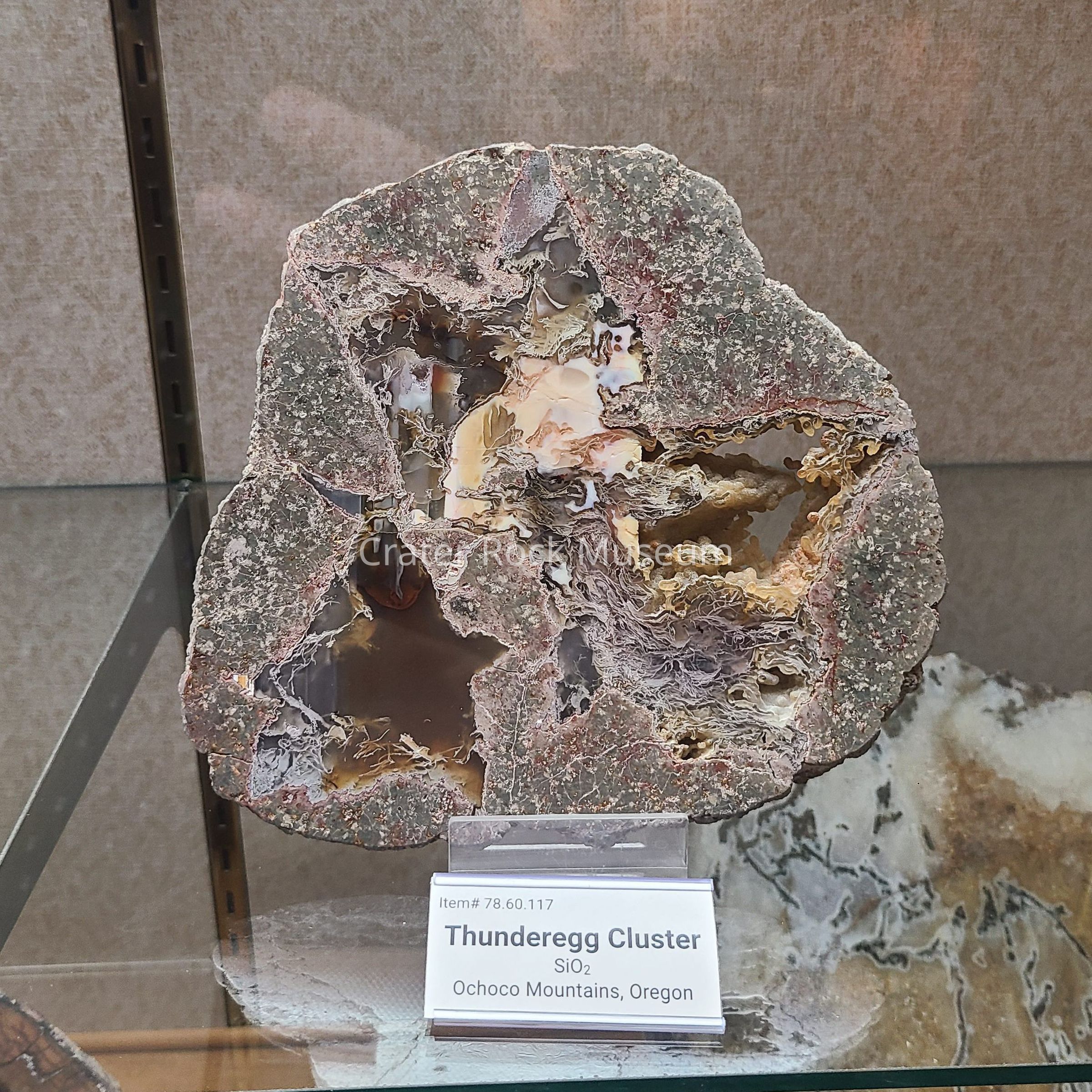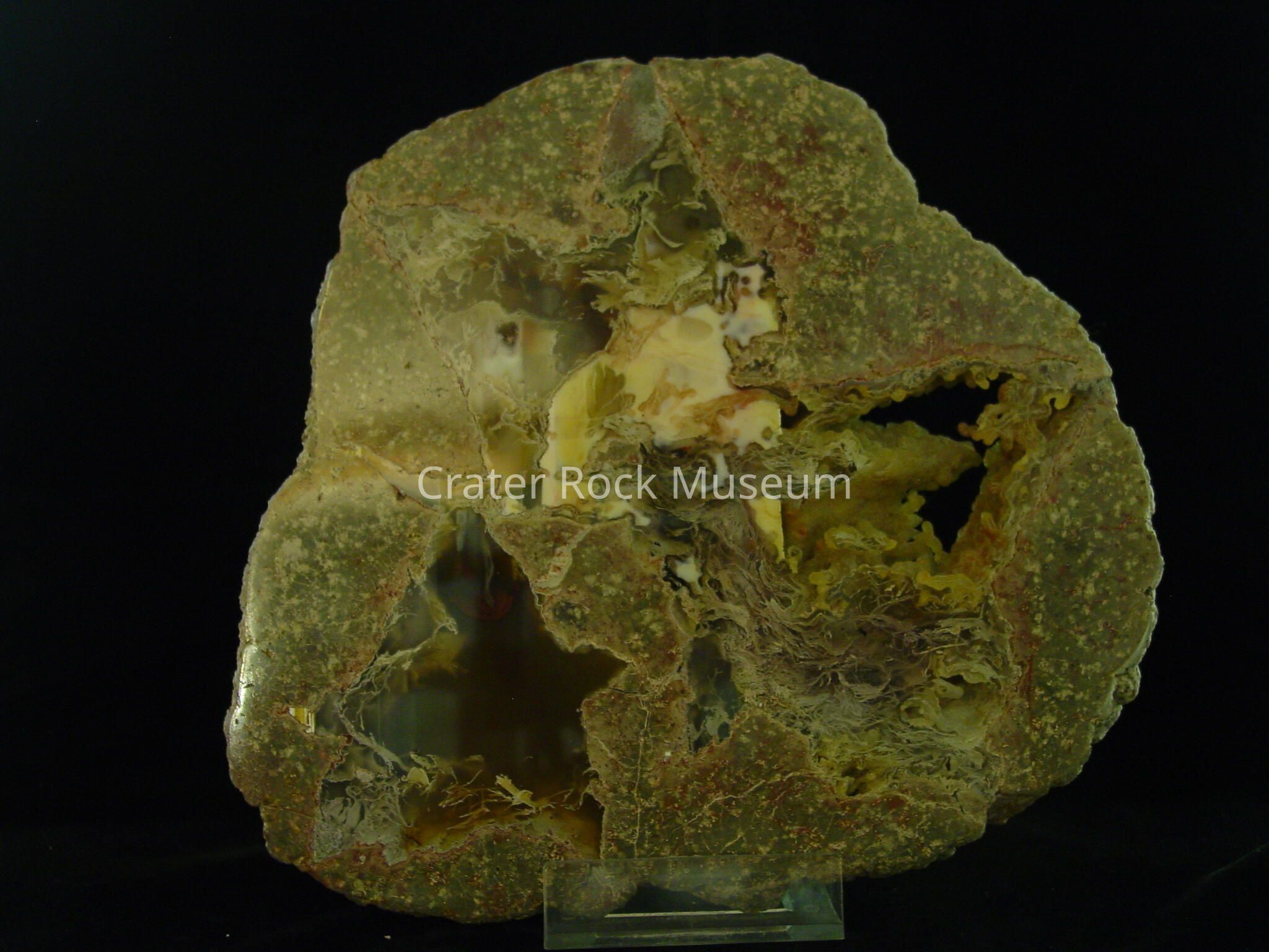 Description: The polished side of this slice shows two areas of agate in brown, yellow, white, cream, and grey. Moss is visible in grey, pink, and white. There is one open hole which has some yellow stalactites. Rock is pink, green, and grey.Collection