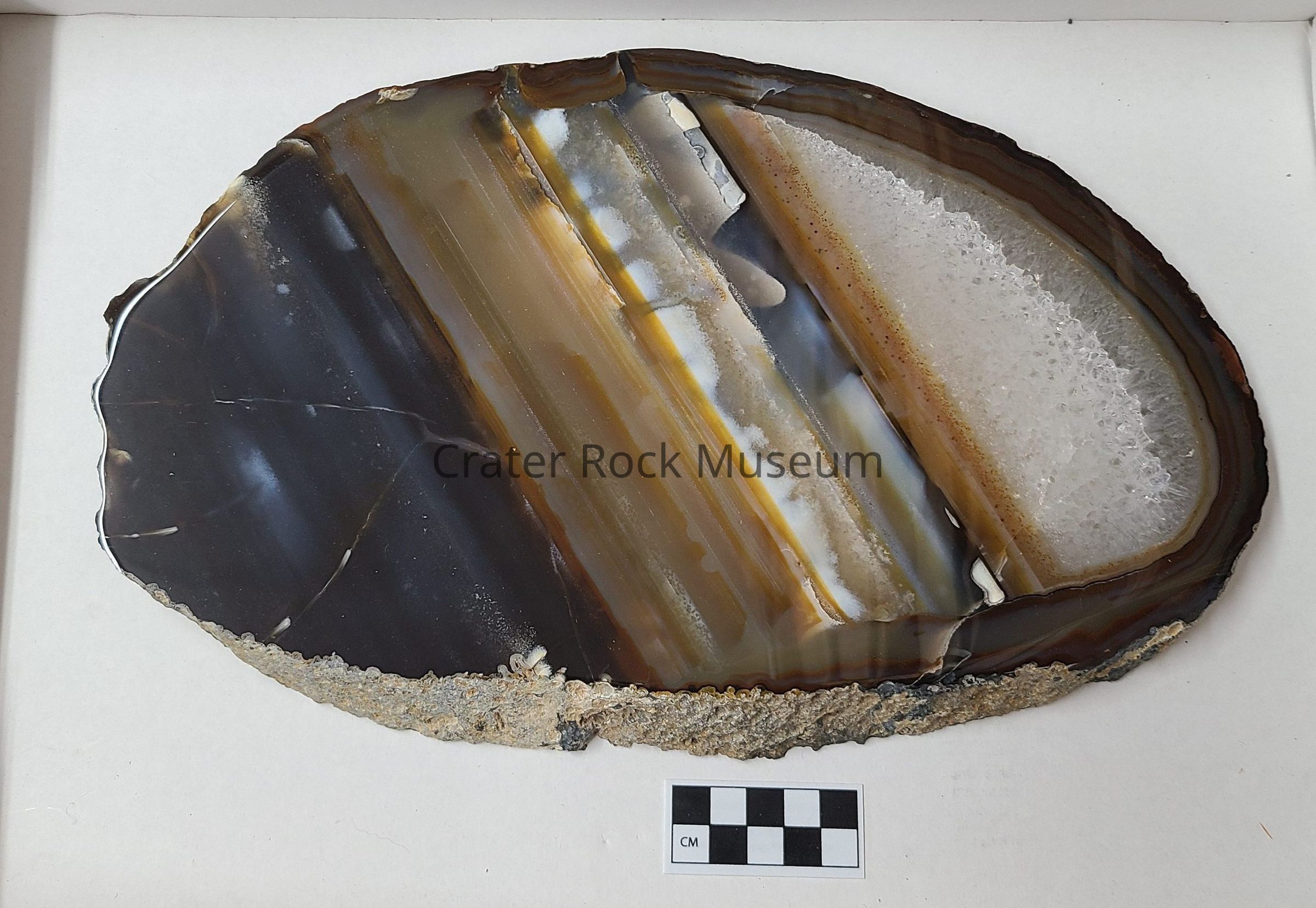 A 7/8" (2.2 cm) thick slice of a Brazilian Agate. Polished side shows a Crystalline and Cream, Orange and Grey Agate center in Curled design. Surrounding the center is a thick Crystalline band (with some Cream Spottings), then a Red Crust or outer band, containing some Grey and Cream (one Crystalline hole). Center is open on unpolished side.Dimensions