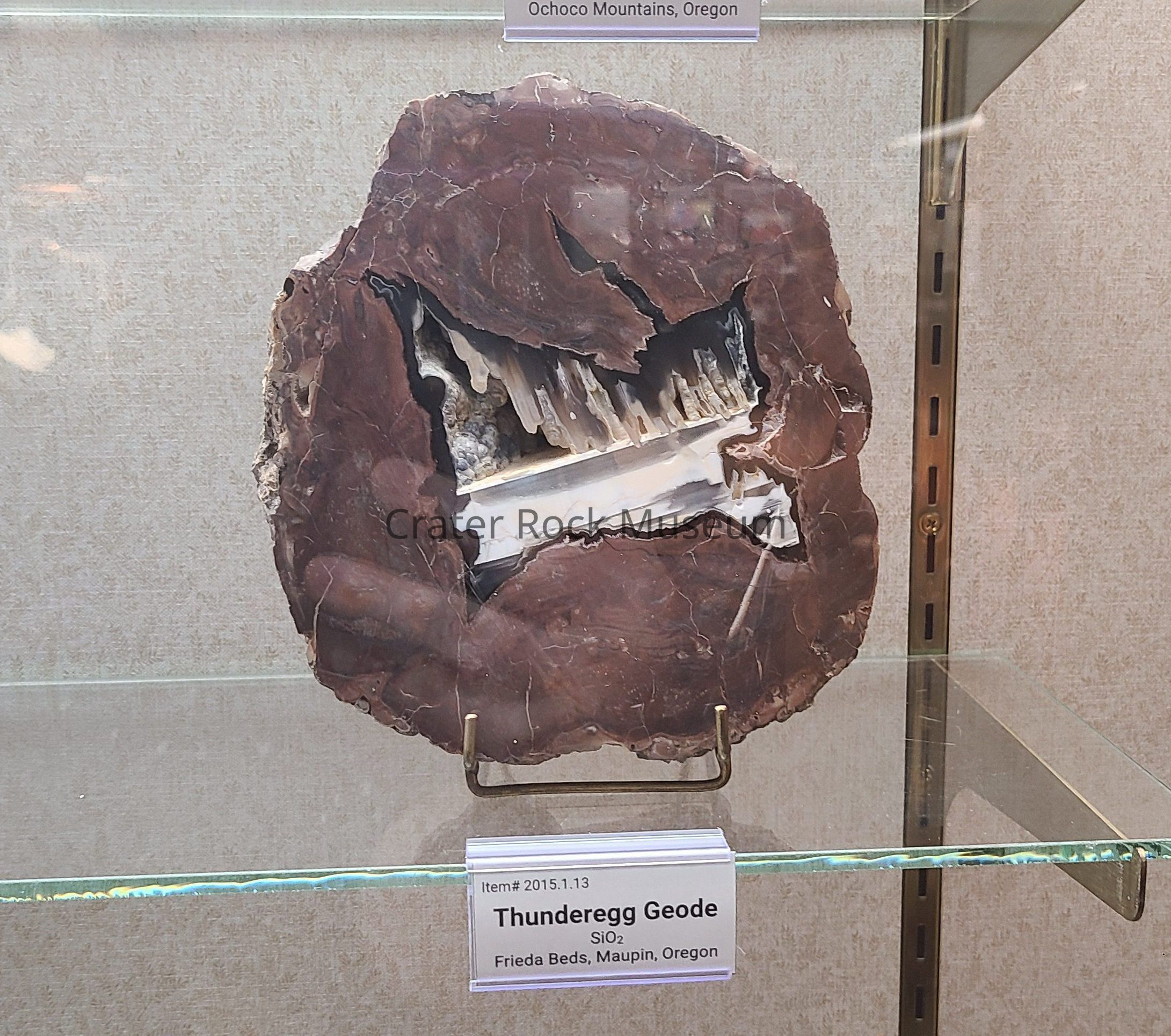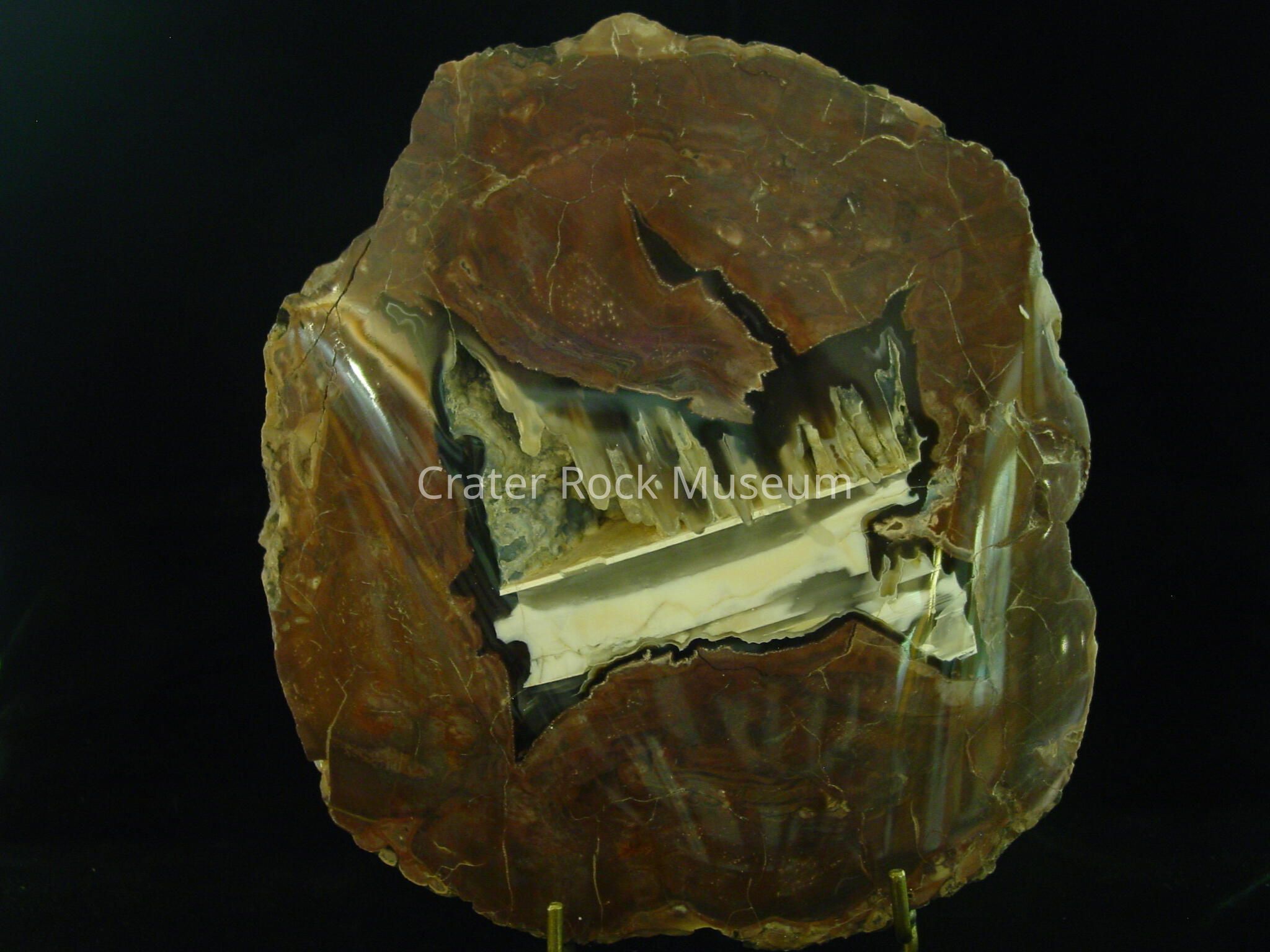Description: The cut face has been shaped to convex and been polished. Center shows an opening with white stalactites, black fortified agate and, in the hollow, some pale blue and white bumpy crystal. There is an area of bedding lines that are white and translucent agate. Rock is a purplish-brown. Black outline surrounds the center agate.Collection