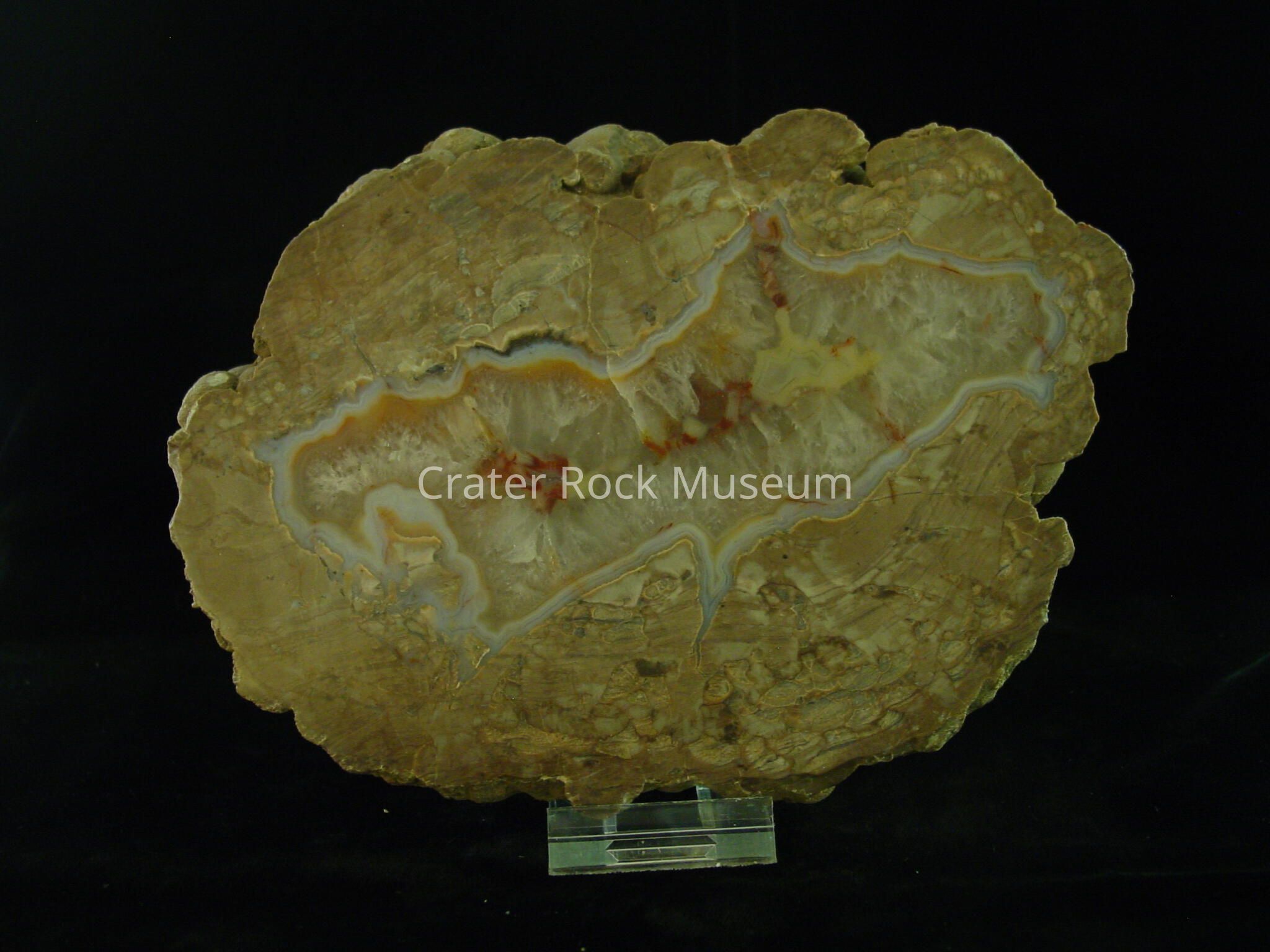 Description: This slice has a pale brown-pink matrix with blue-white fortification lines around a white solid crystal center. There is a little reddish-brown in the crystal center.Collection