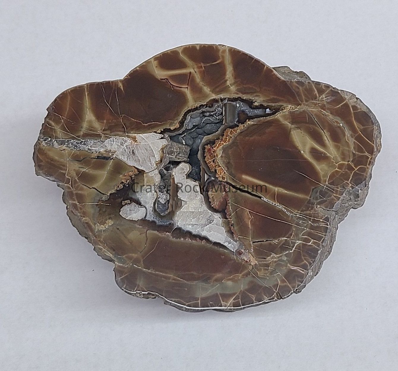 Description: The cut face of this piece shows a reddish brown fortified agate with opaque tan colored veins. The cavity has a grey botryoidal interior and is surrounded on one side by solid, white quartz crystals and greyish bedding lines on the other. Rock is light tan and grey and botryoidal.Collection