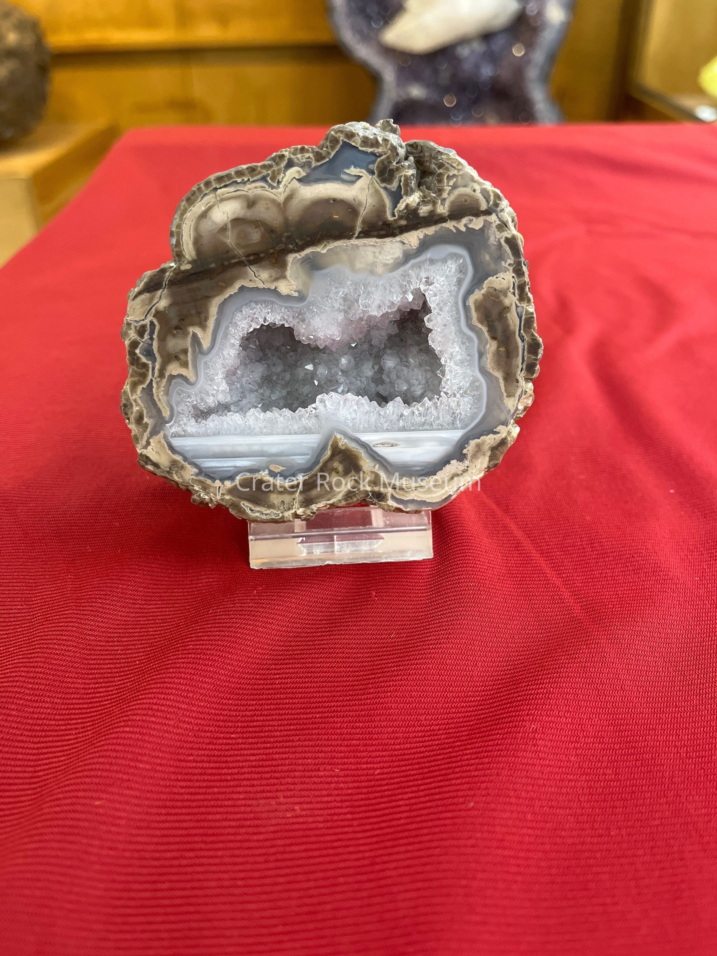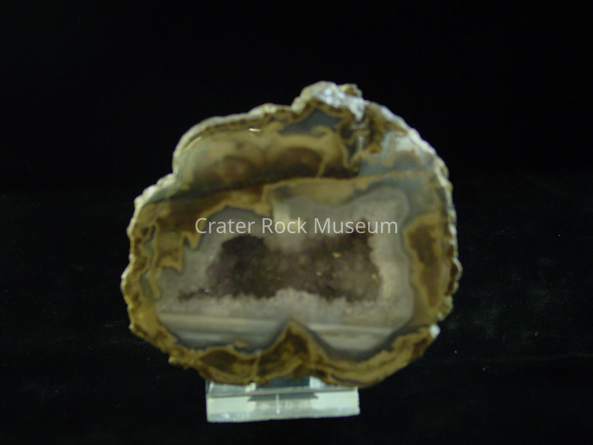 Description: The cut face of this piece shows a hollow lined with light Amethyst colored crystals. This is surrounded by clear fortified agate with white and grey bedding lines on one side. Matrix is in tan and brown agate. Outer surface is a greyish brown.Collection