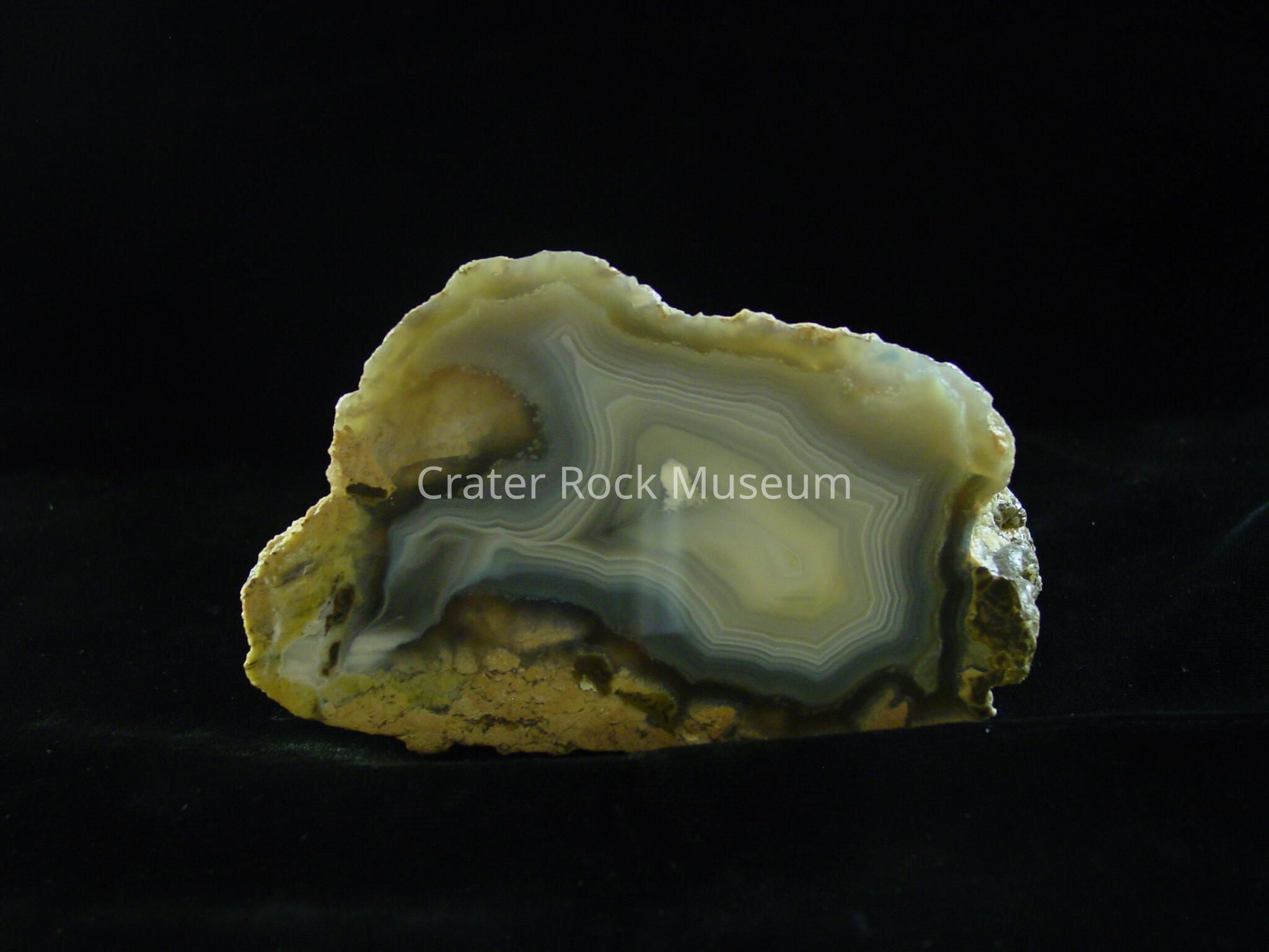 Description: The cut face of this piece shows a small area of white moss and agate. This is ringed by a yellowish fortified agate which in turn is ringed by lines in greys, whites and clear agate. Perimeter and outer surface are in tans black and grey.Collection
