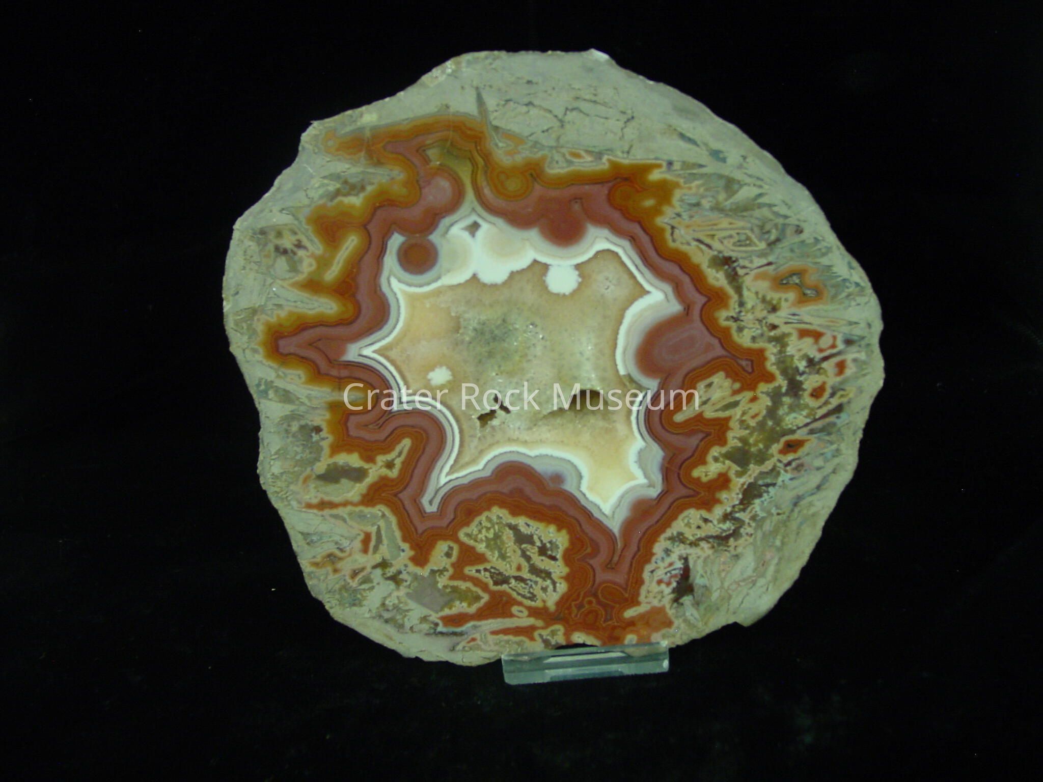 Description: Thick slab with rounded back. Reddish-brown outer region with dark to light blue inner section which has irregular creamy-white crystalline 'fans'. Single small hollow off-center of the specimen.Collection
