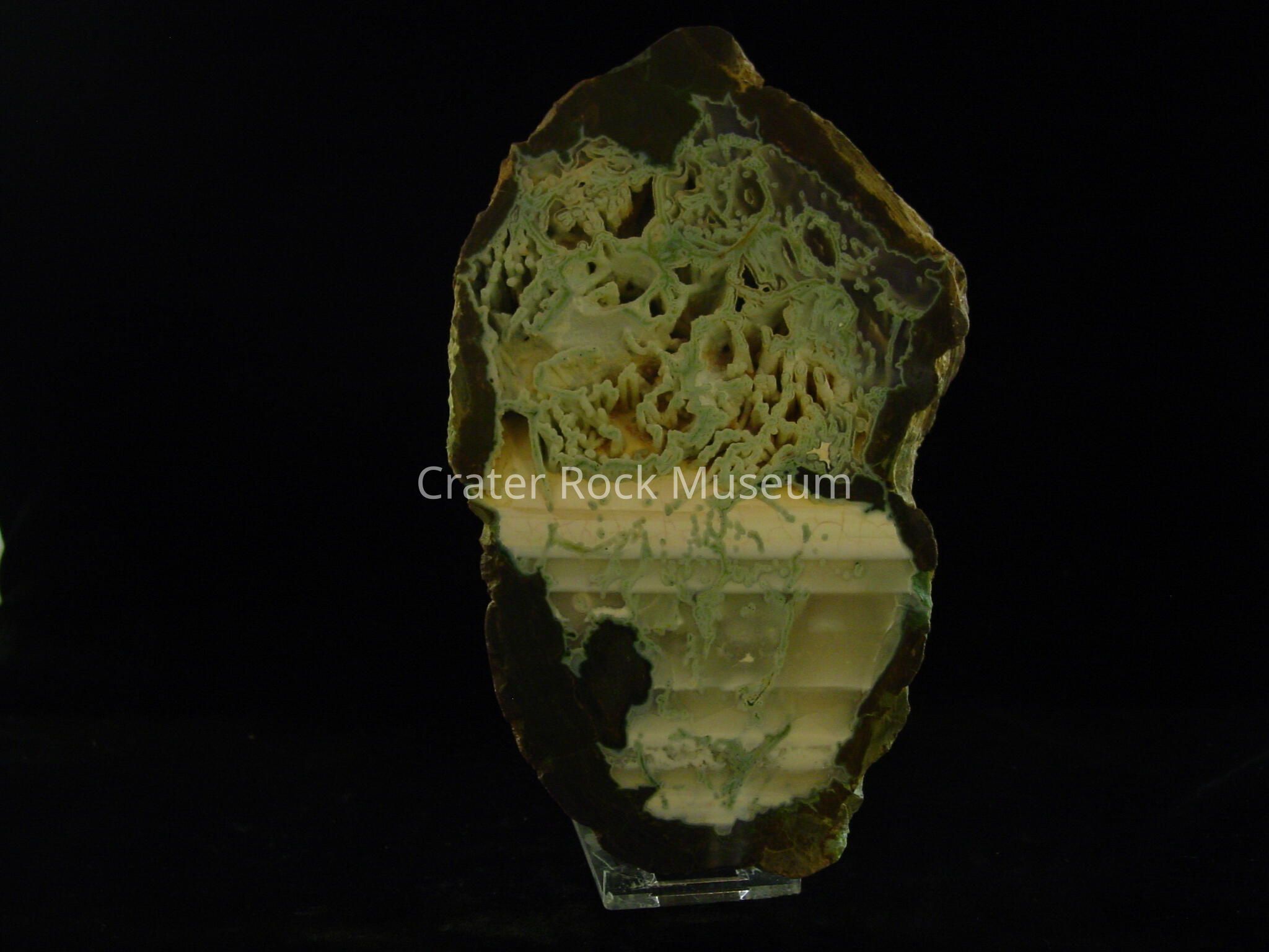 Description: One half of this piece shows clear to creamy white bedding lines. The other half is a lacy, blue-green crystal with some solid clear agate. The lace is also visible within the bedding lines section. Outer rock is green, tan and brown. This piece was on the "Rock Tour" in Salem, OR at the Capital Bldg. from 11/08 to 6/09.Collection