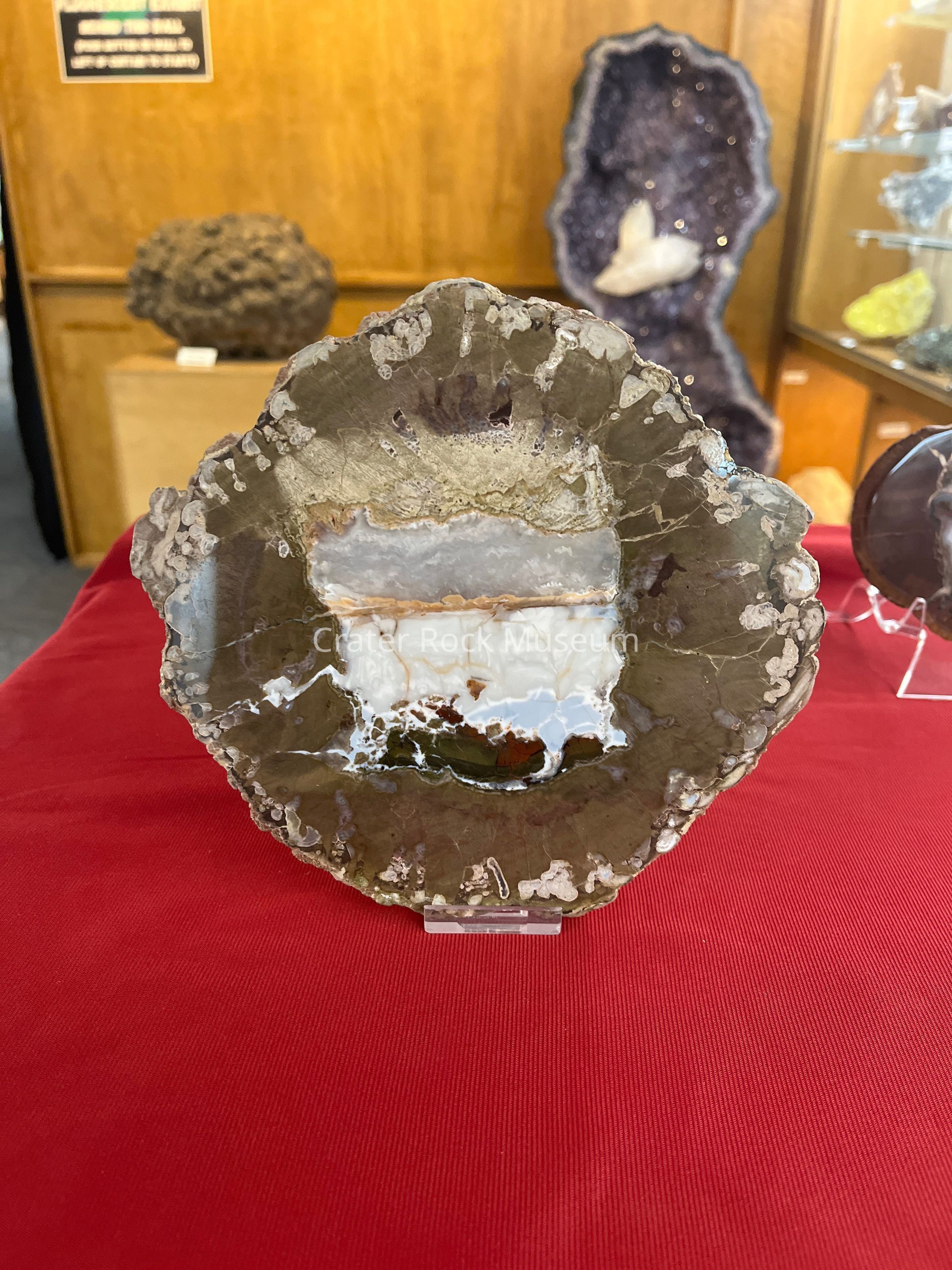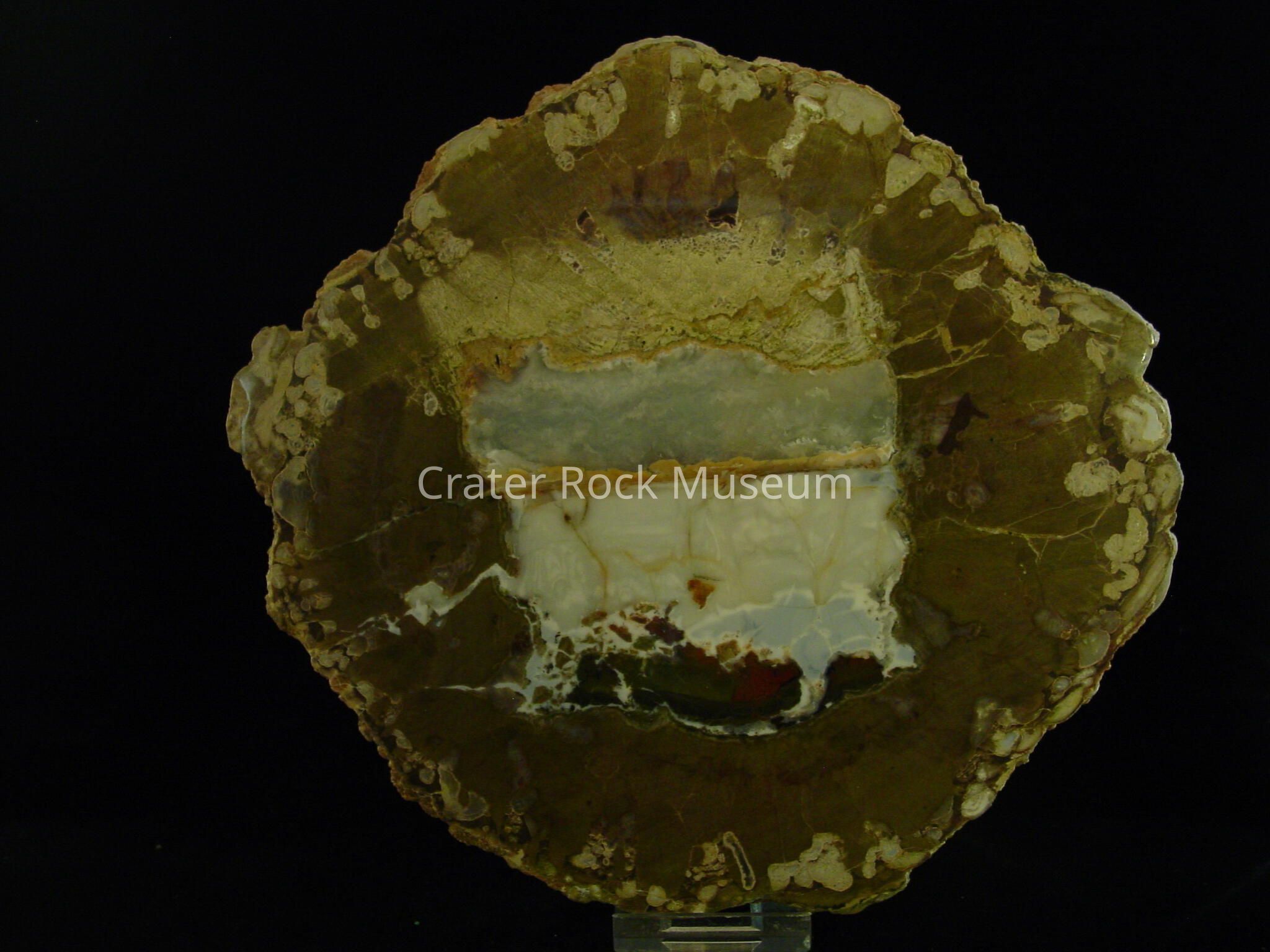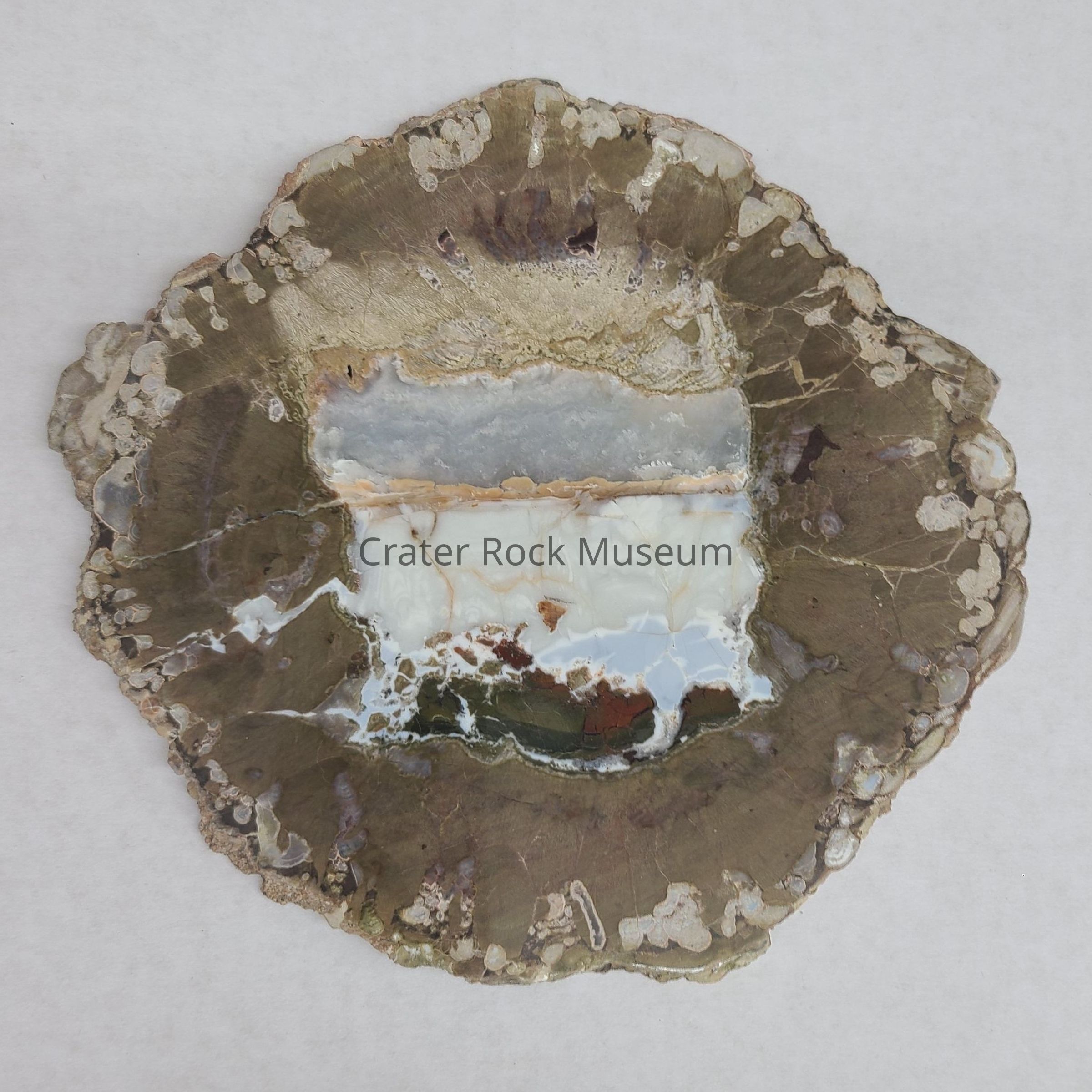 Description: A slice that shows a greenish brown matrix with small, dull white crystal inclusions. There are four distinct layers of fortified agate at the center. One layer is tan in color one is a greyish white to clear, one is white with faint bedding lines and another that is a conglomerate of reds, pale blue white and olive green.Collection