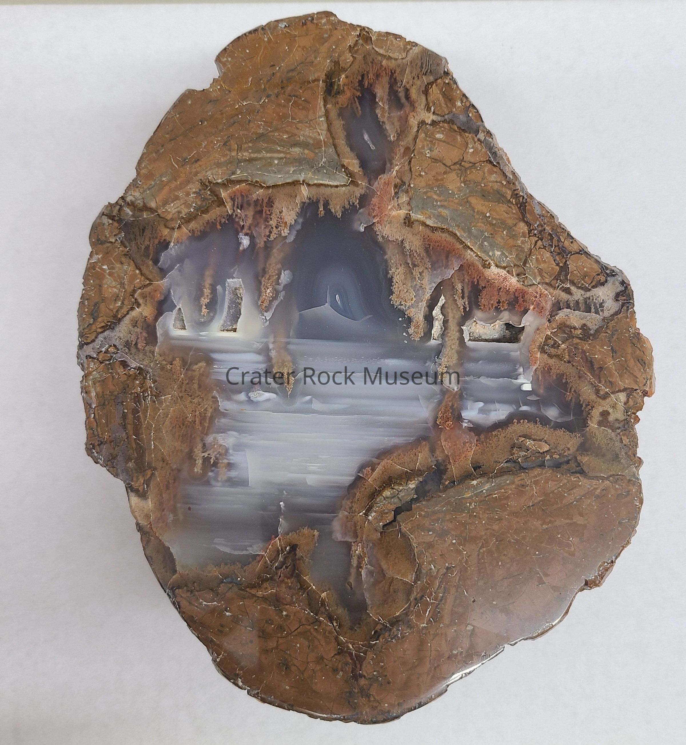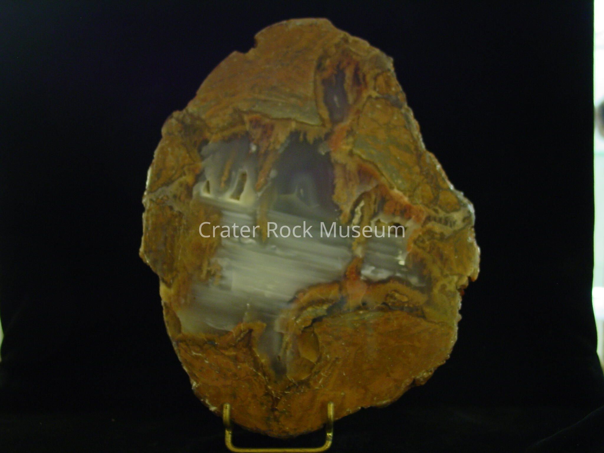 Description: A matrix of brown to greenish grey agate surrounds fortified agate in clear and dark grey. Bedding lines are seen in about half the agate center. There are also four small, agate lined openings. Some reddish brown to tan moss is seen along the perimeters. Rock is reddish brown.Collection