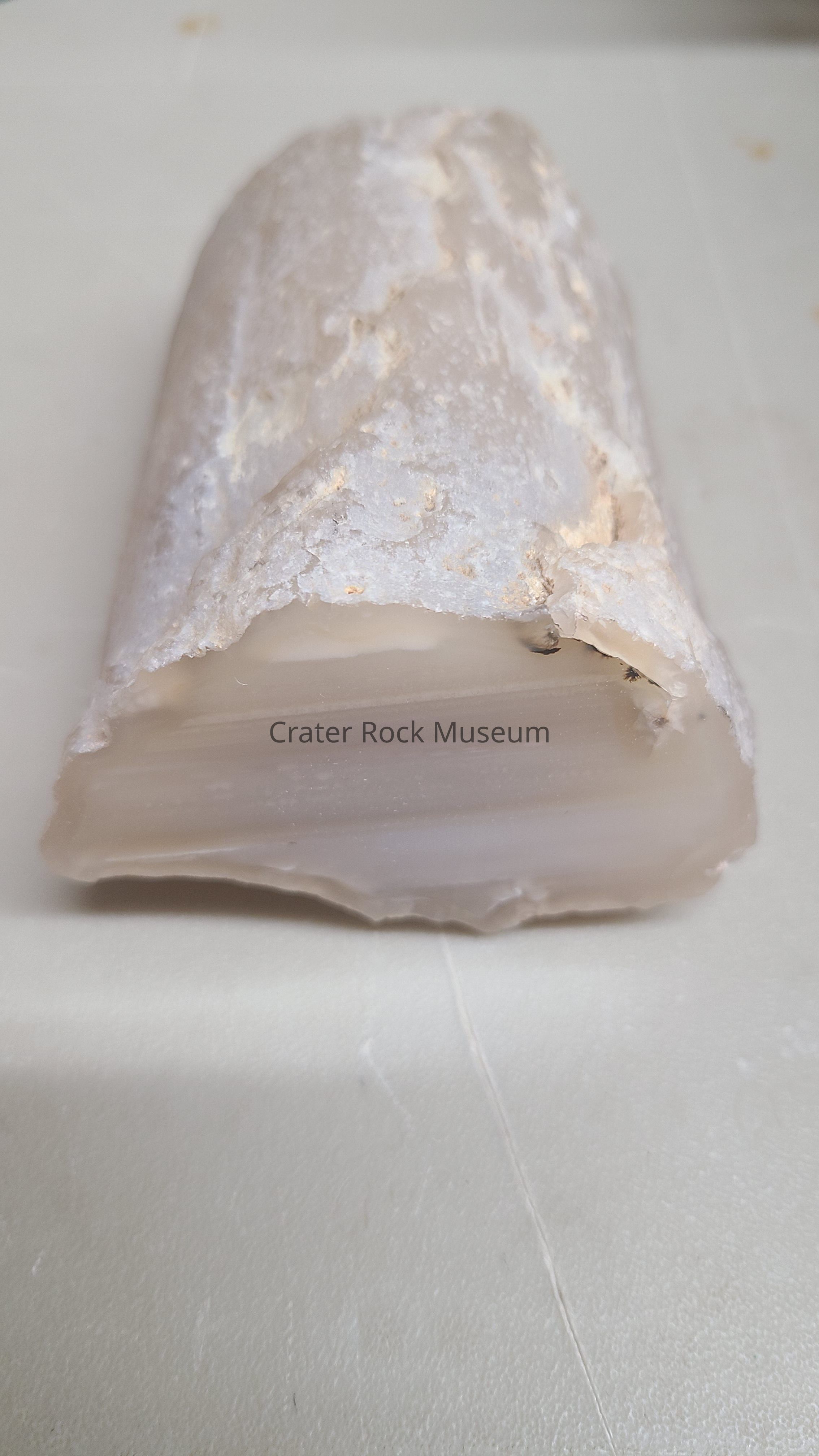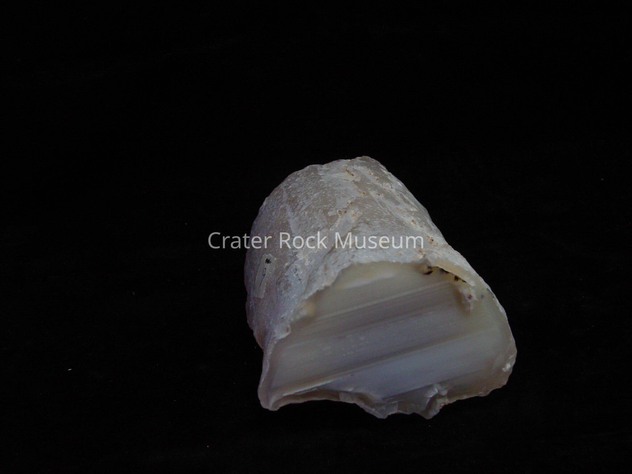 Description: A half round limb cast with clear and white bedding lines seen on cut end.