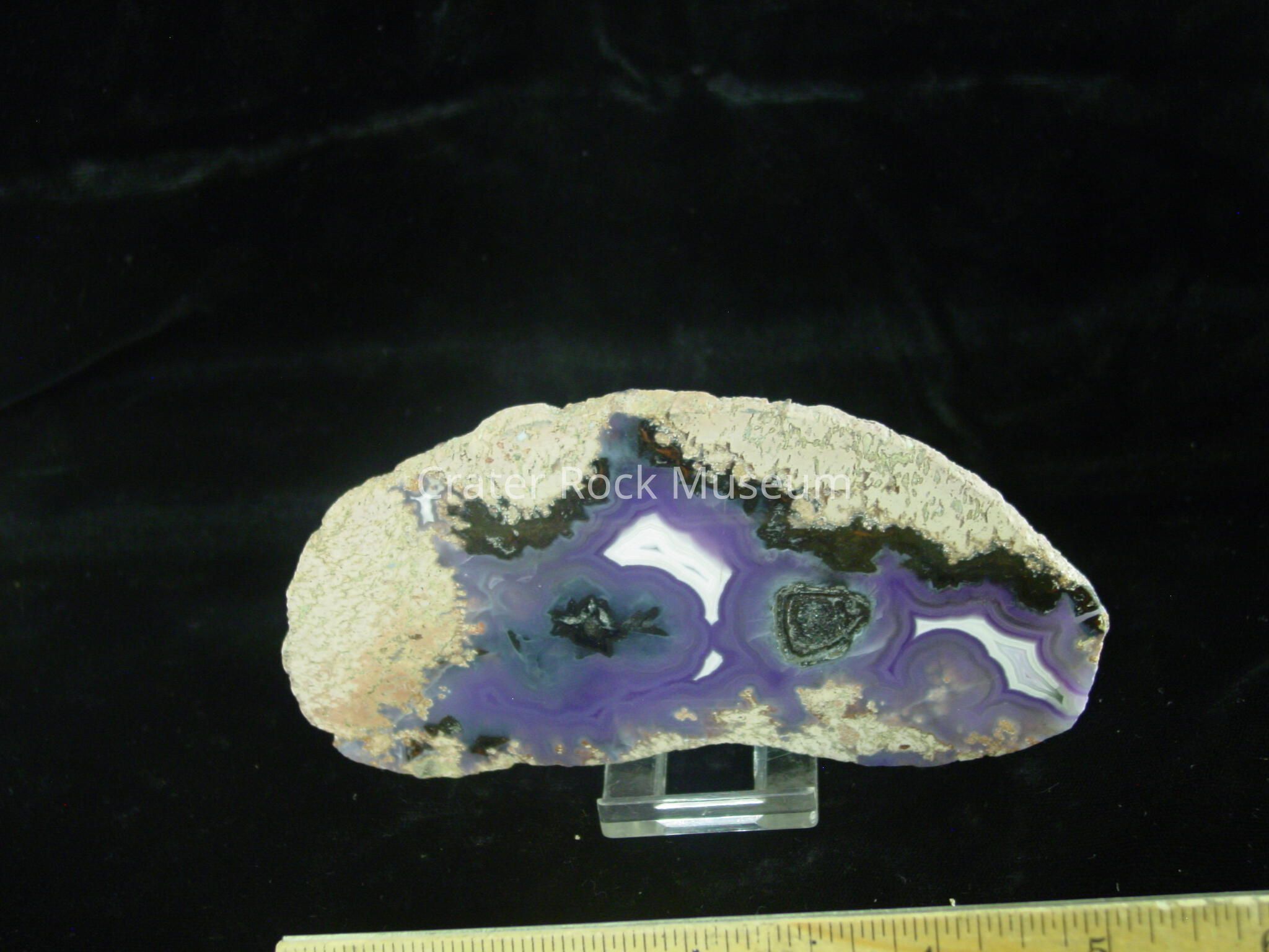 Description: Thin slab with polished face. Spotty beige, chambered outer areas with translucent violet, somewhat banded area, and two areas of white banded centers.