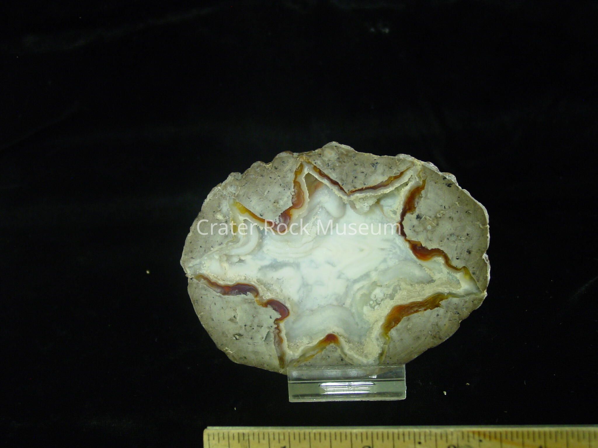 Description: Oval, rounded back with polished face. Gray, with black spots on outer areas, and burnt red border area surrounding star-shaped center, with a cotton-white hollow center.Collection
