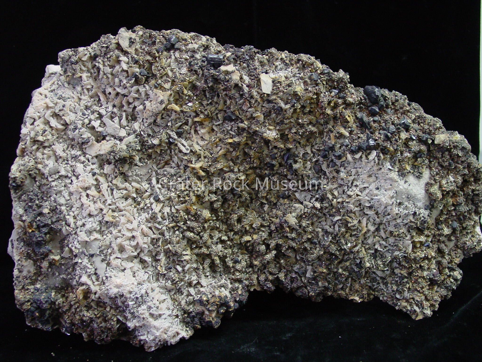 Description: (Delmar) This piece of ore is from Joplin,Missouri. It is a mix of Pyrite, Dolomite,Chalcopyrite,Copper and Lead on a Chert base.Colors: Grey and white Chert with some ochre stains, pink Dolomite, metalic gold Pyrite, metalic Chalcopyrite with rainbow sheen, some green copper and grey lead. Also some sphalerite is seen.