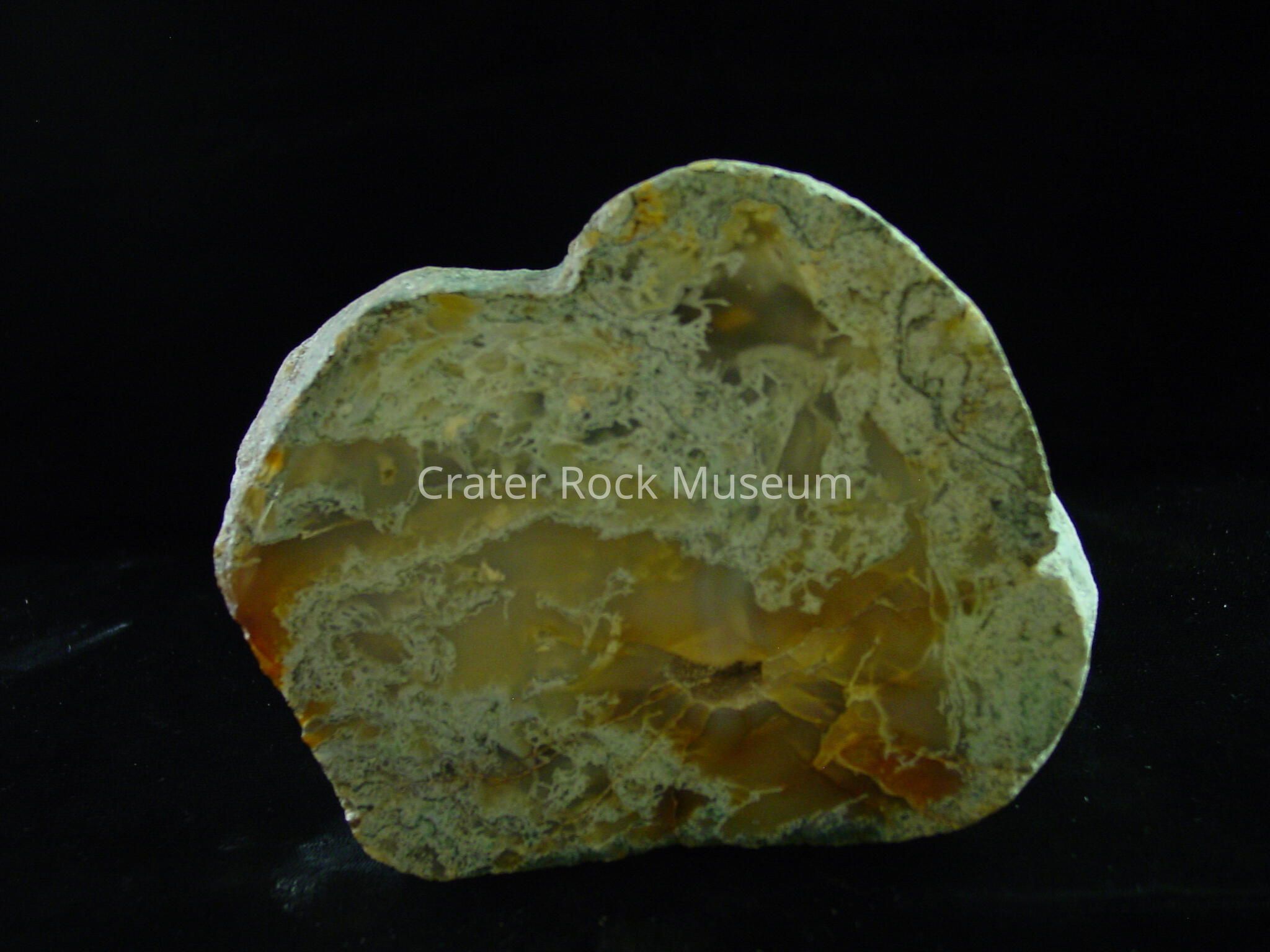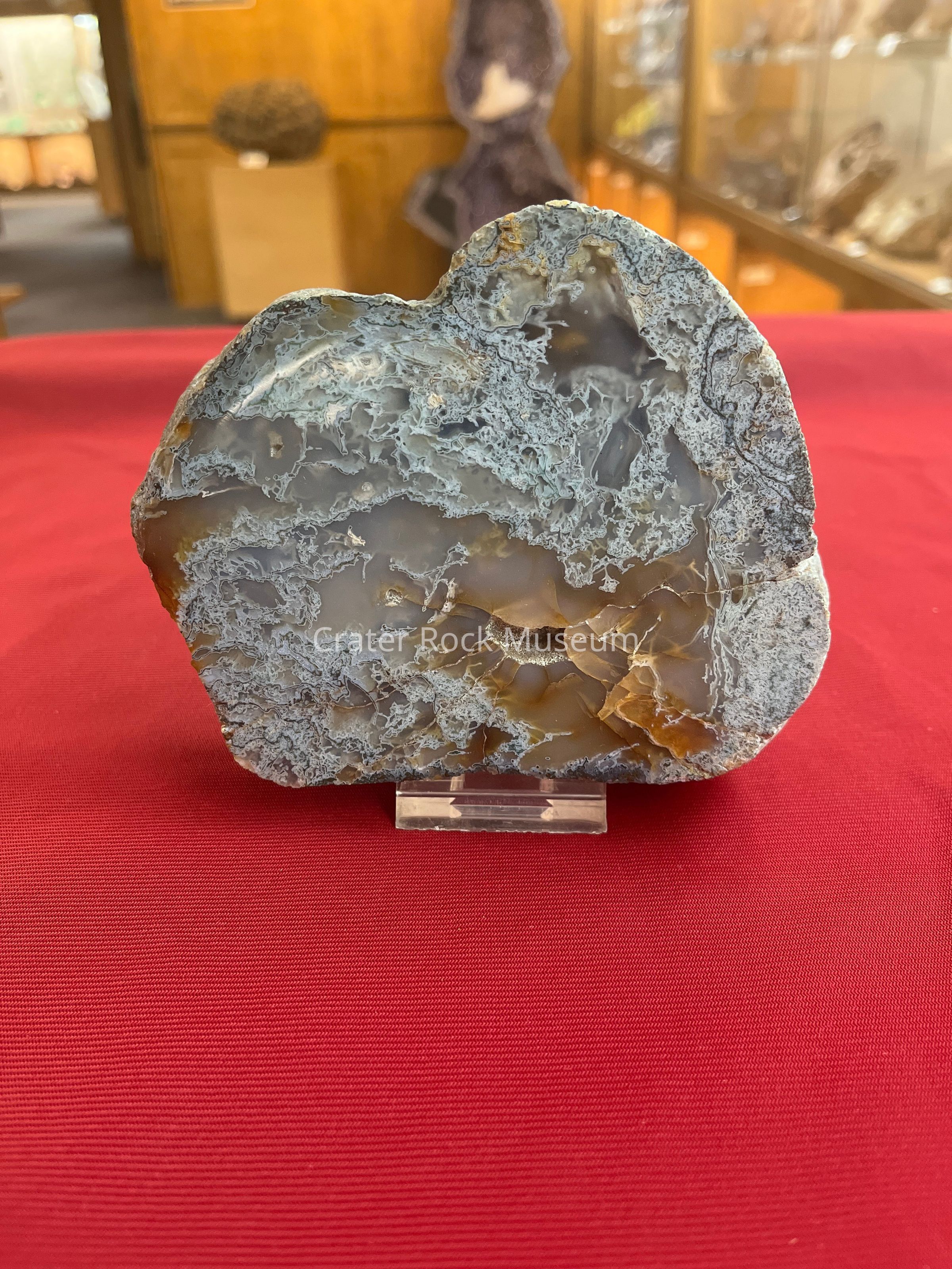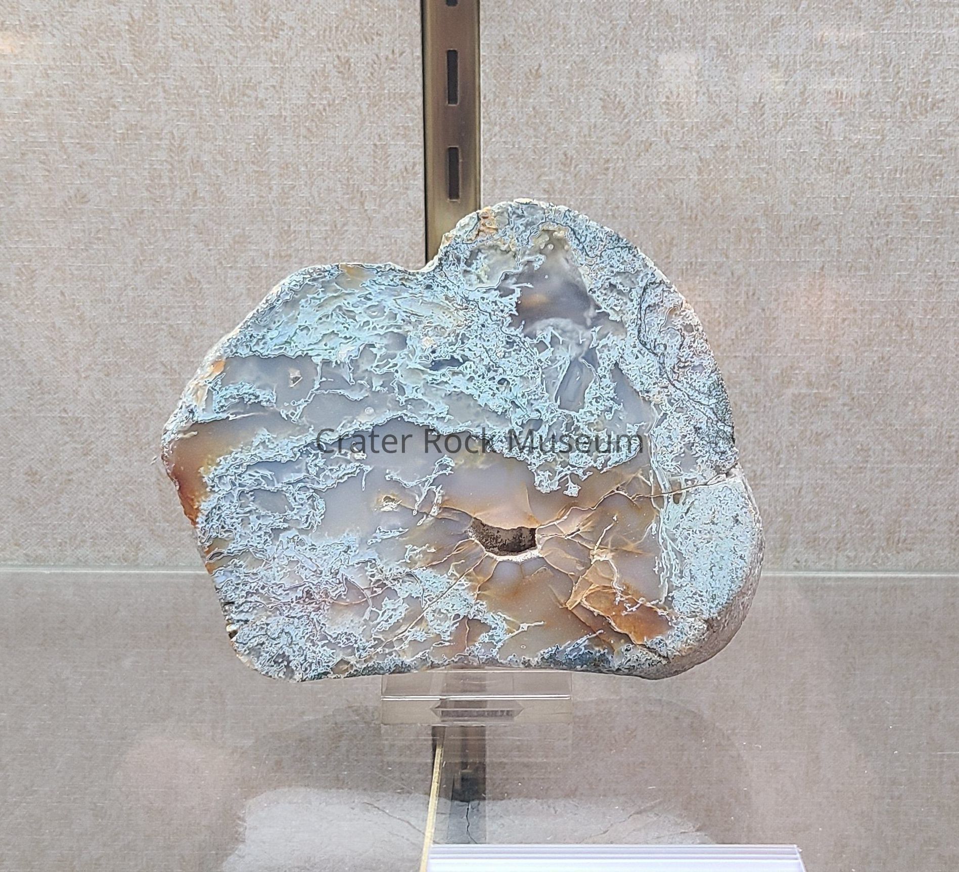 Description: A thick slice of polished moss agate showing translucent greys and oranges with light blue moss seen throughout. A small opening with cracks radiating out from it is also seen.Collection