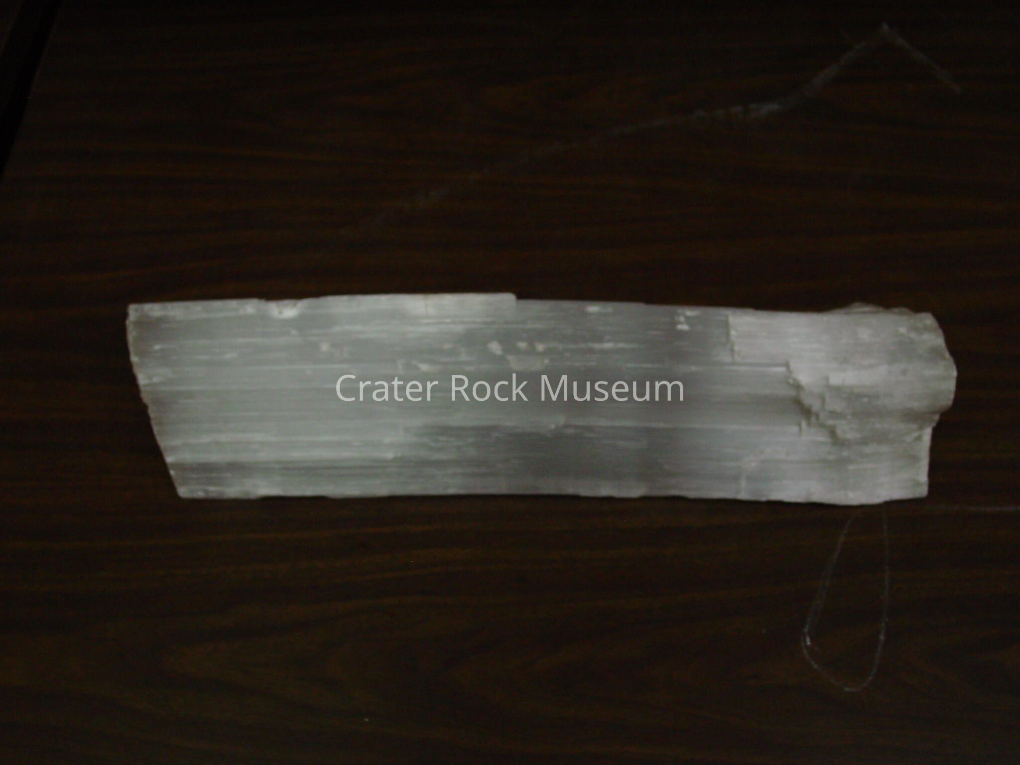 Description: A translucent white "satin spar" variety of Selenite. Piece is a triangular shaped column with long, fiberous and compact crystals. Donated by the Rosas Family of Medford.