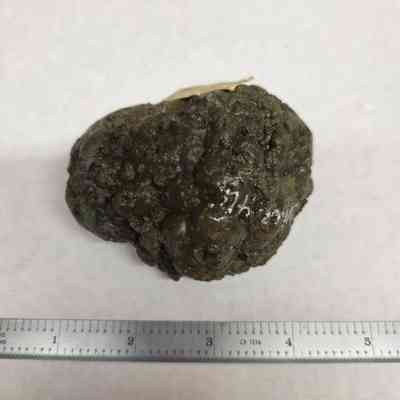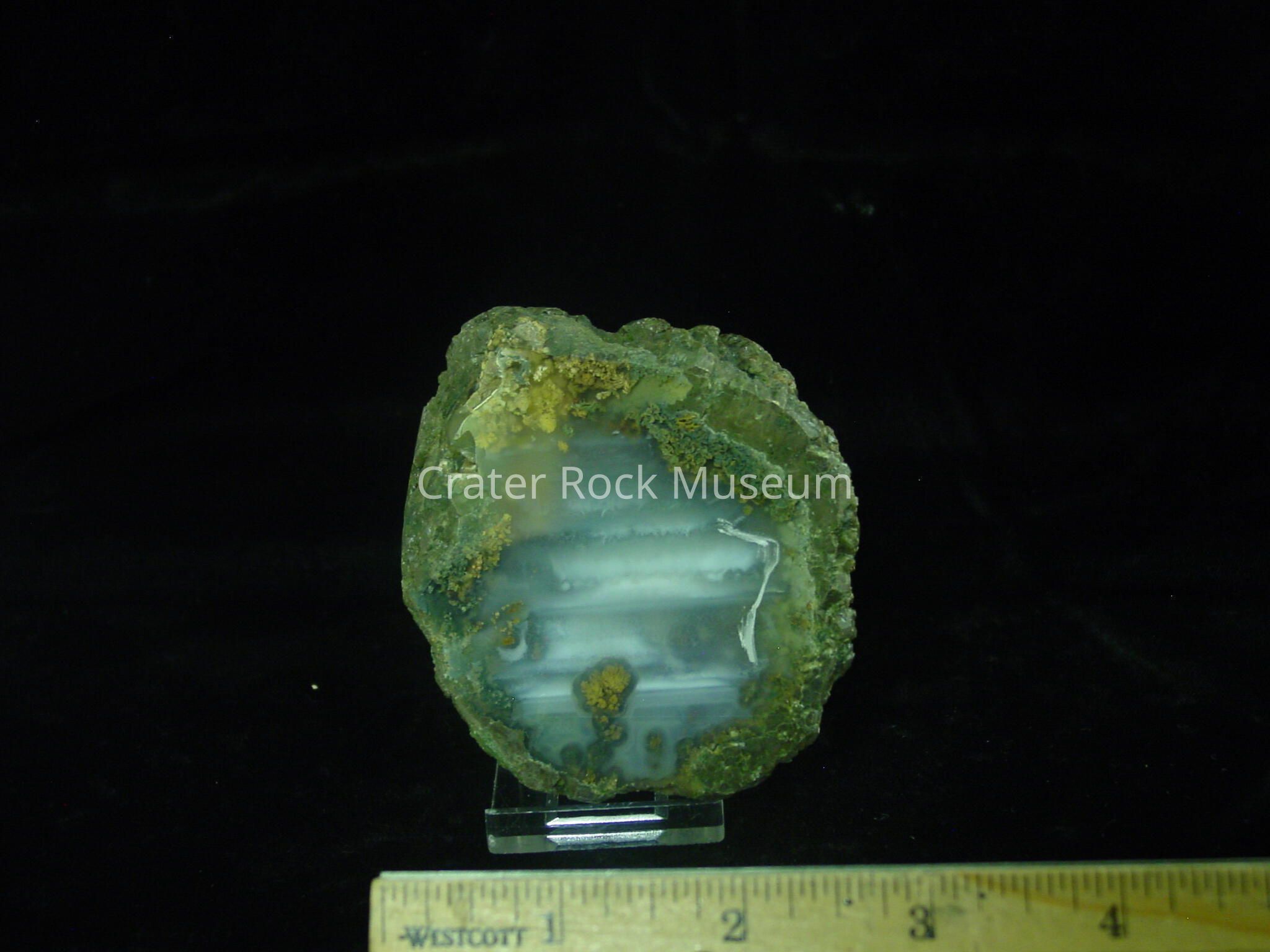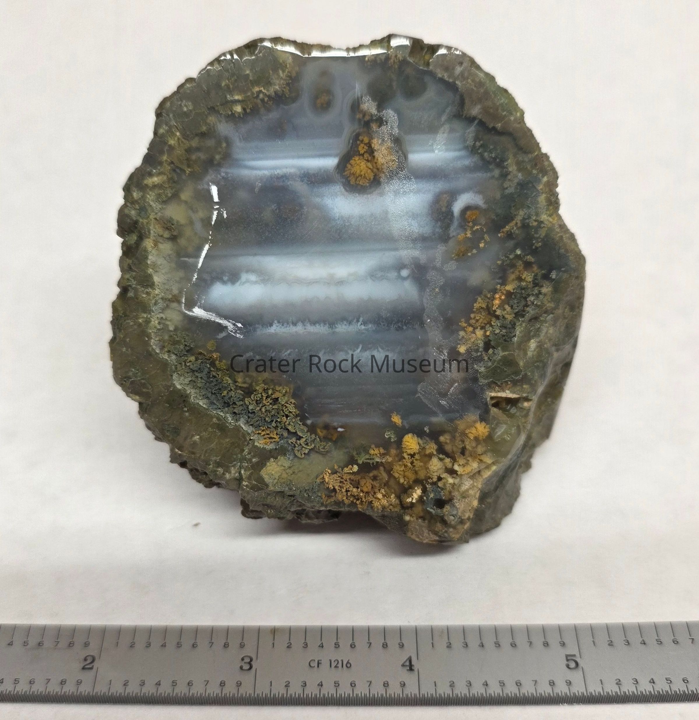Description: Small rounded back with polished face. Rough, coarse olive-green outer area, with transparent, light blue-gray, and white linear center.