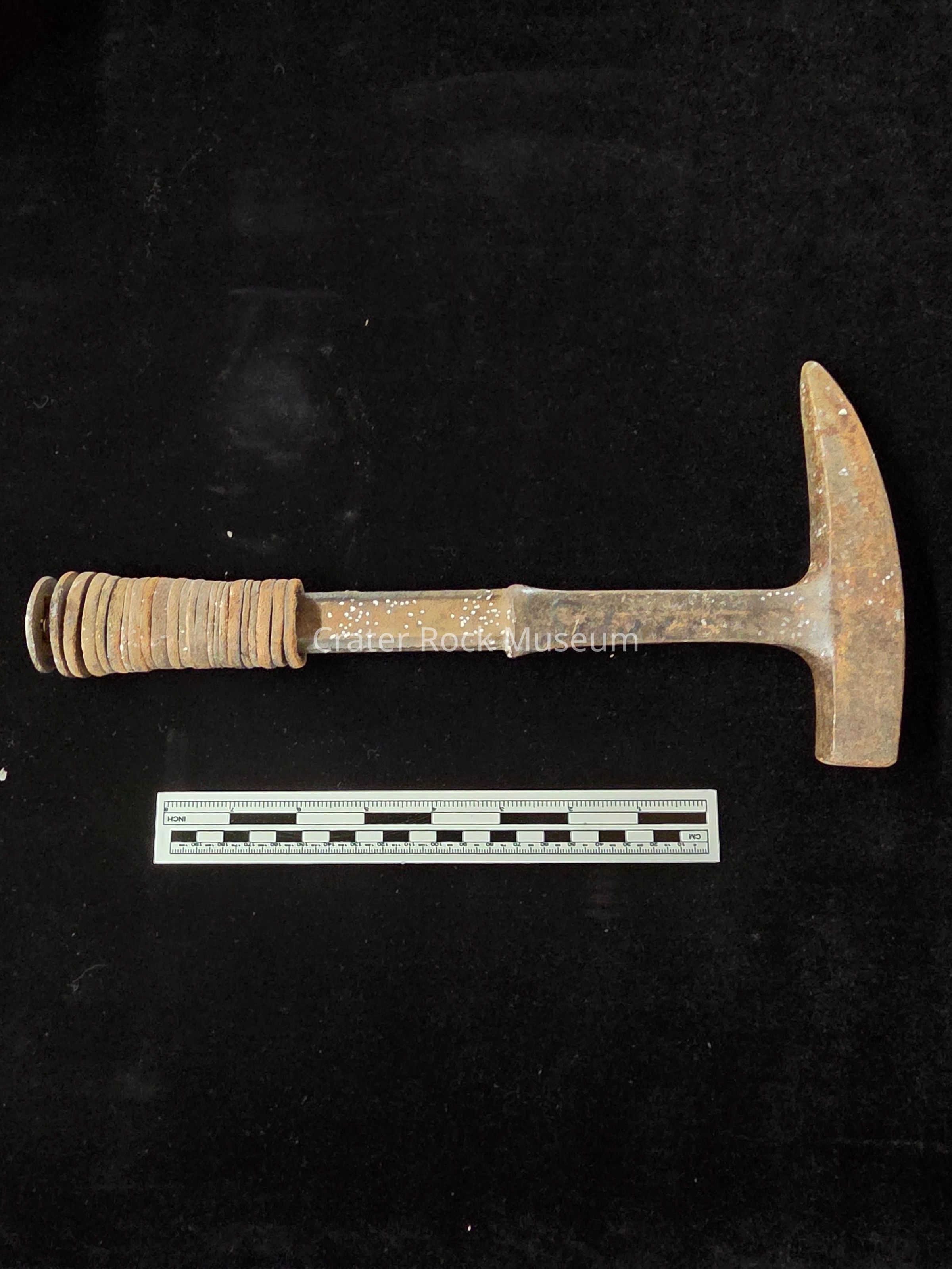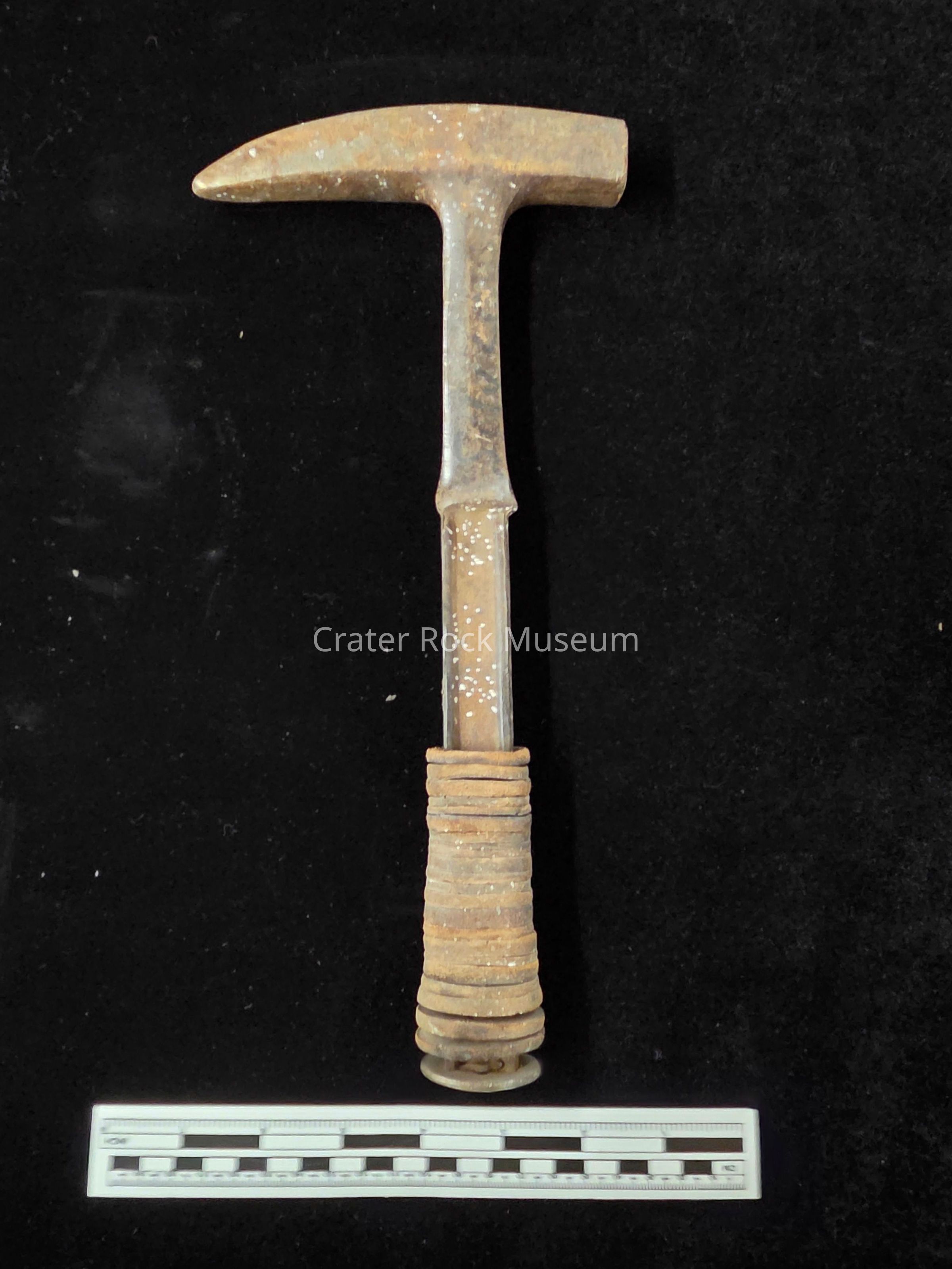 Steel rock pick with a stacked leather grip made by Estwing Manufacturing Company.