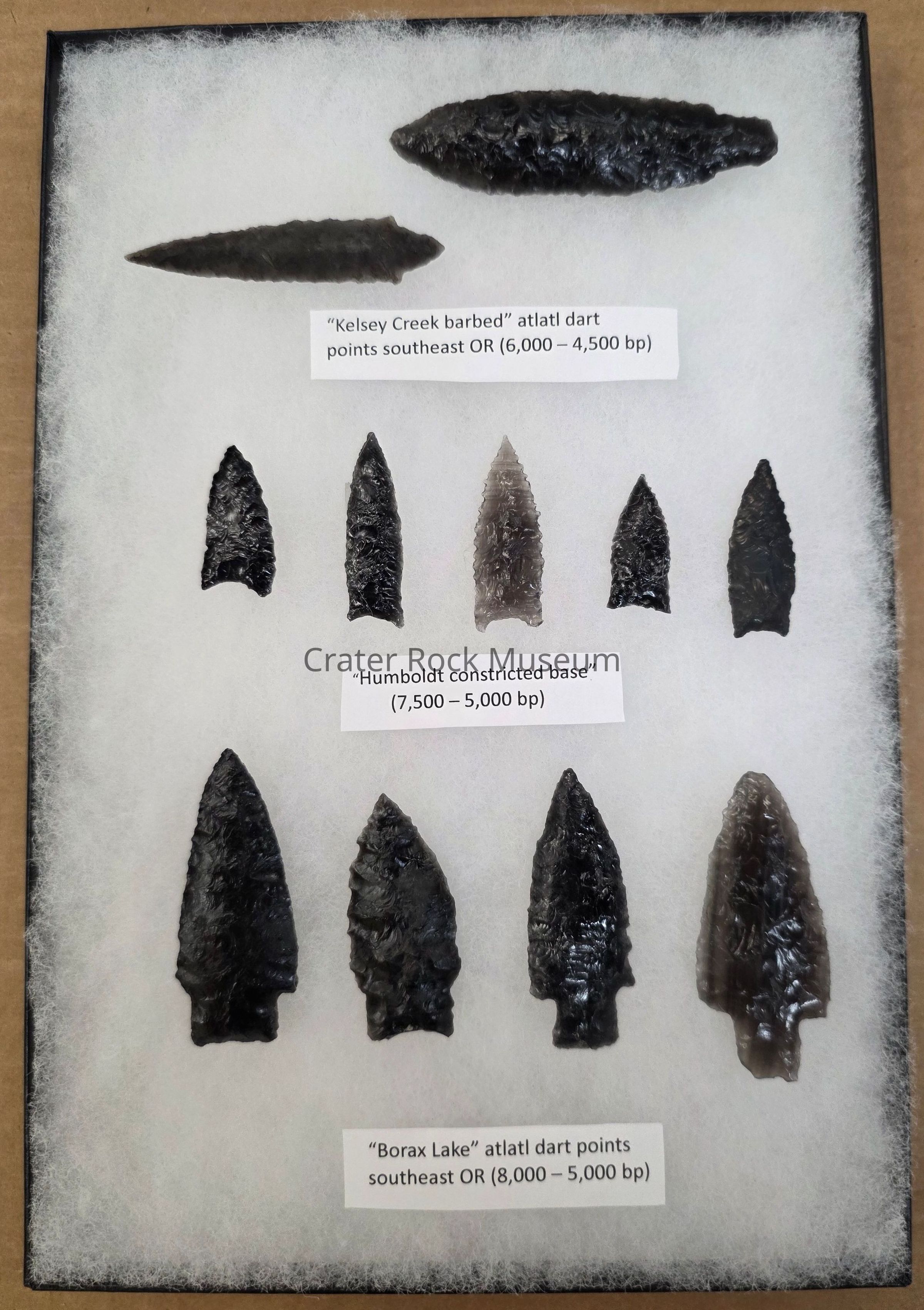 11 obsidian and flint projectile points- 2 Kelsey Creek, 5 Humbolt constricted base, and 4 Borax Lake forms- in an 8"x12" Riker frameCollection