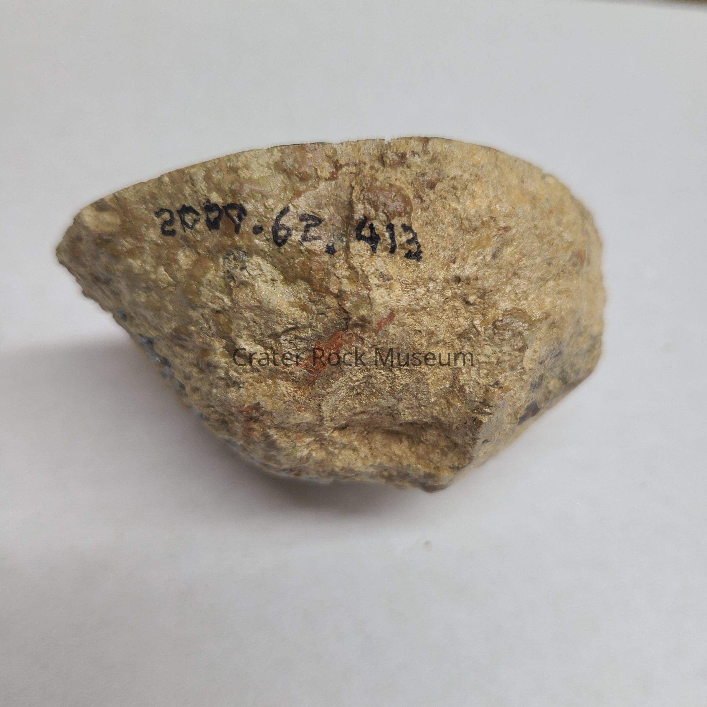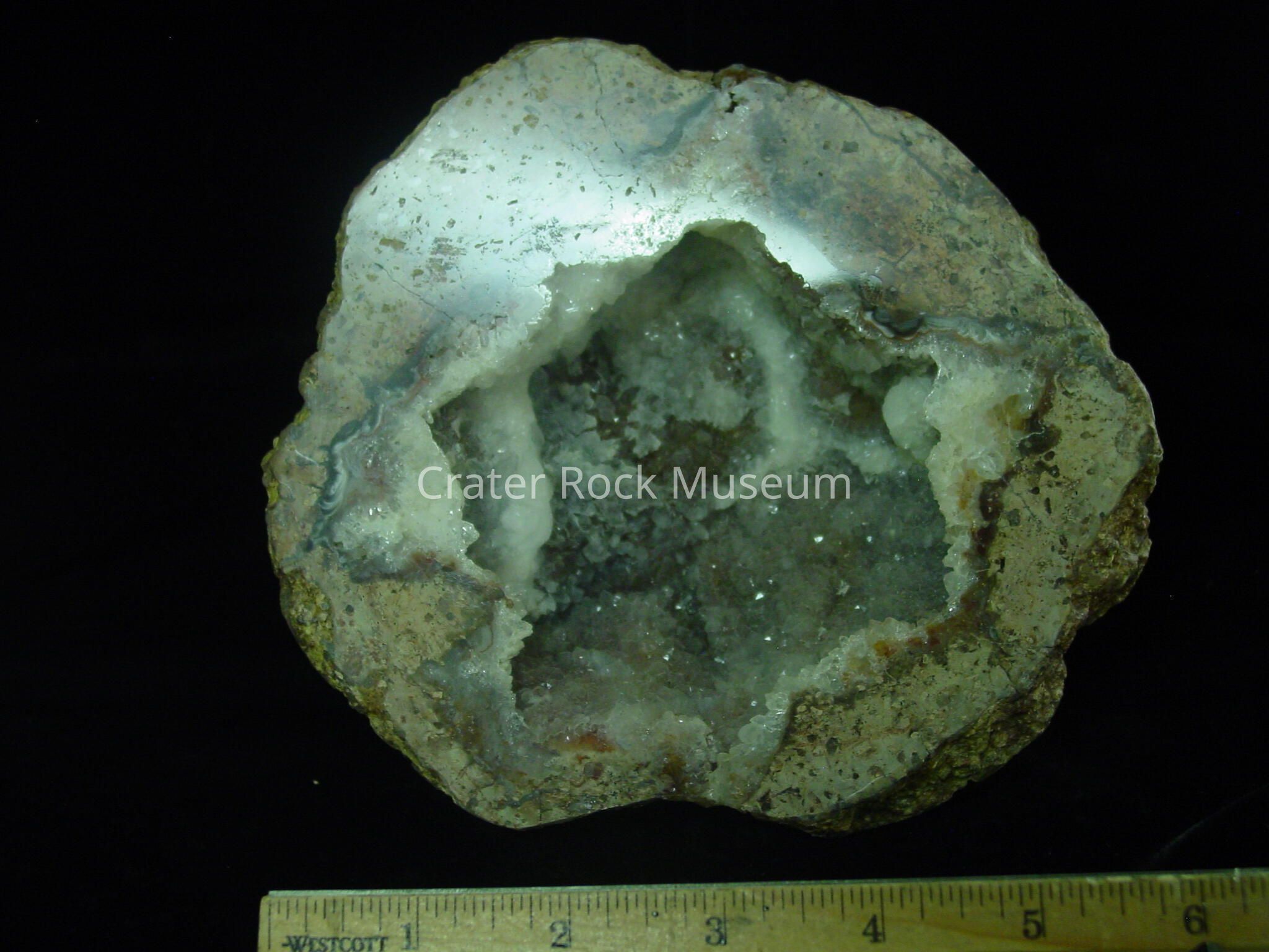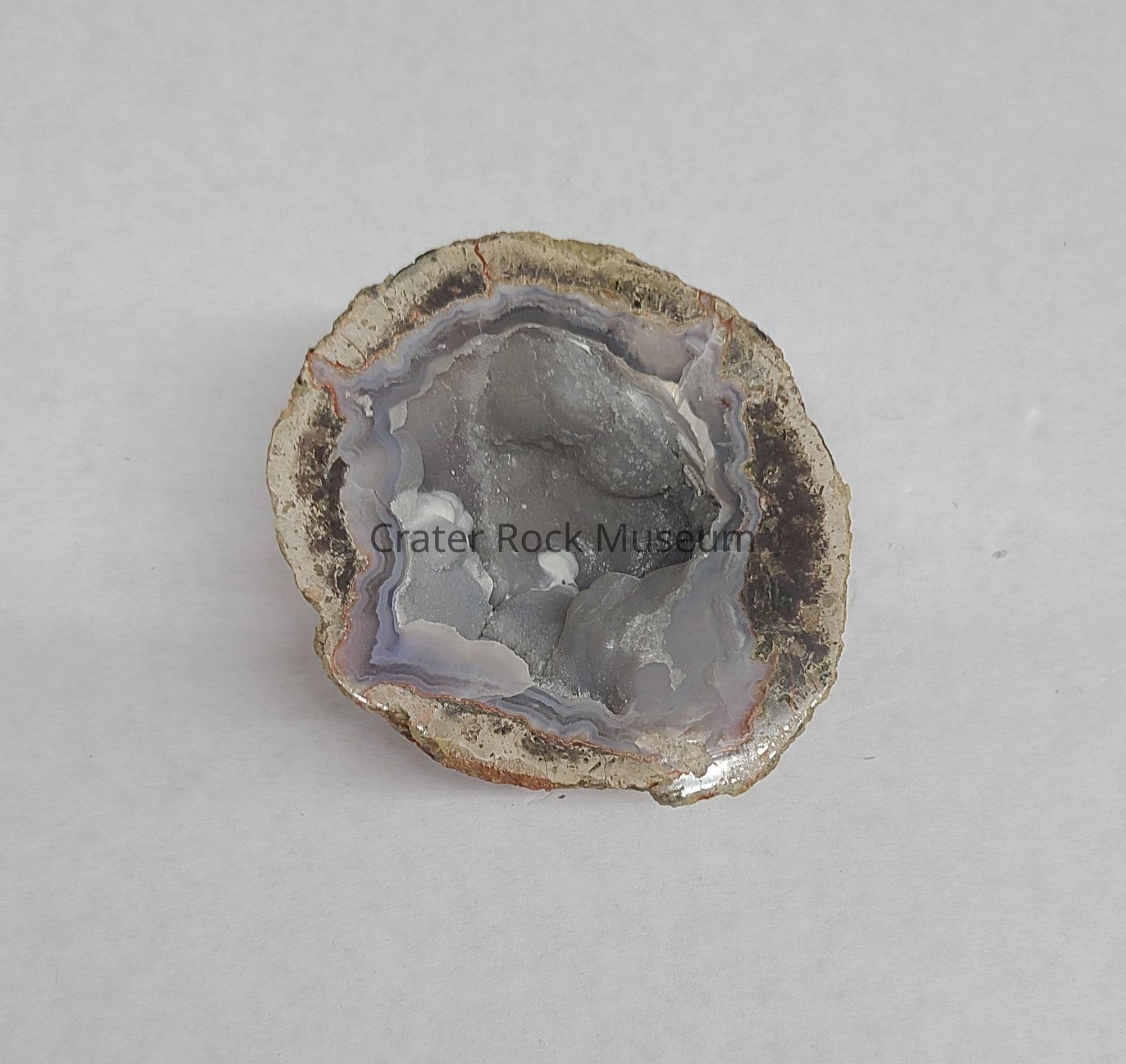 Description: Small rounded back with polished face. Tan and brown outer area with translucent blue-gray and white inner area, surrounding a hollow, white and blue-gray nodular center.Collection