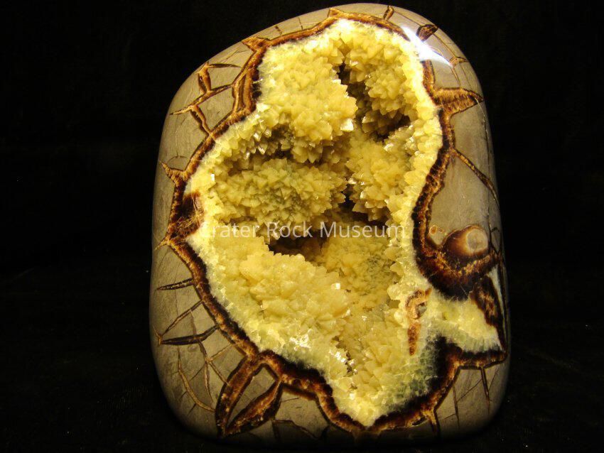 Septarian Nodule: Geode with high quality cut and polish, honey golden colored calcite crystals, Cut base.