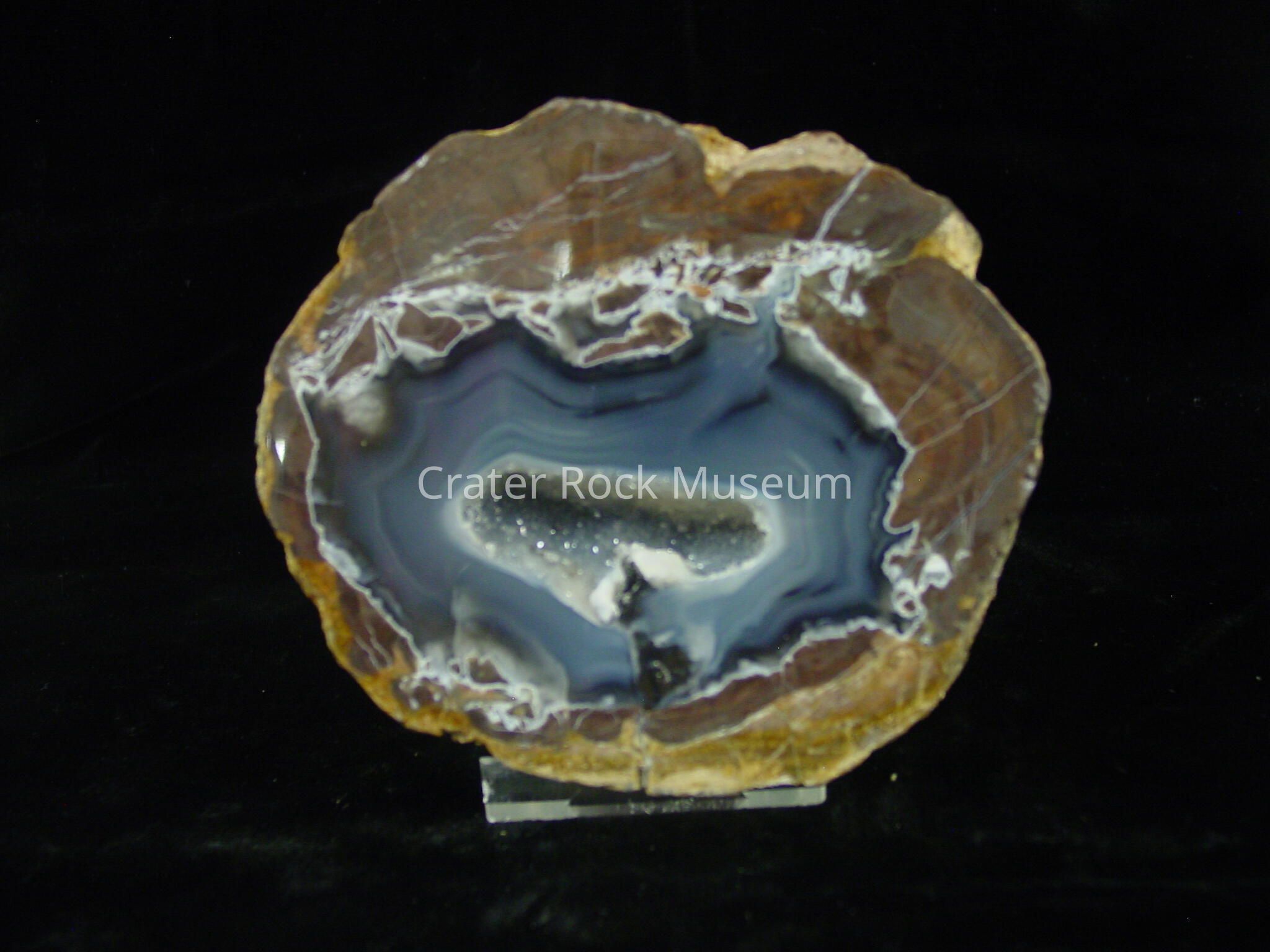 Description: Thick rounded back with polished face. Light and dark brown outer edges with a thin, white inner area, surrounding a banded blue-gray and black center having a hollow cavity in the center with a blue-white crystalline structure.