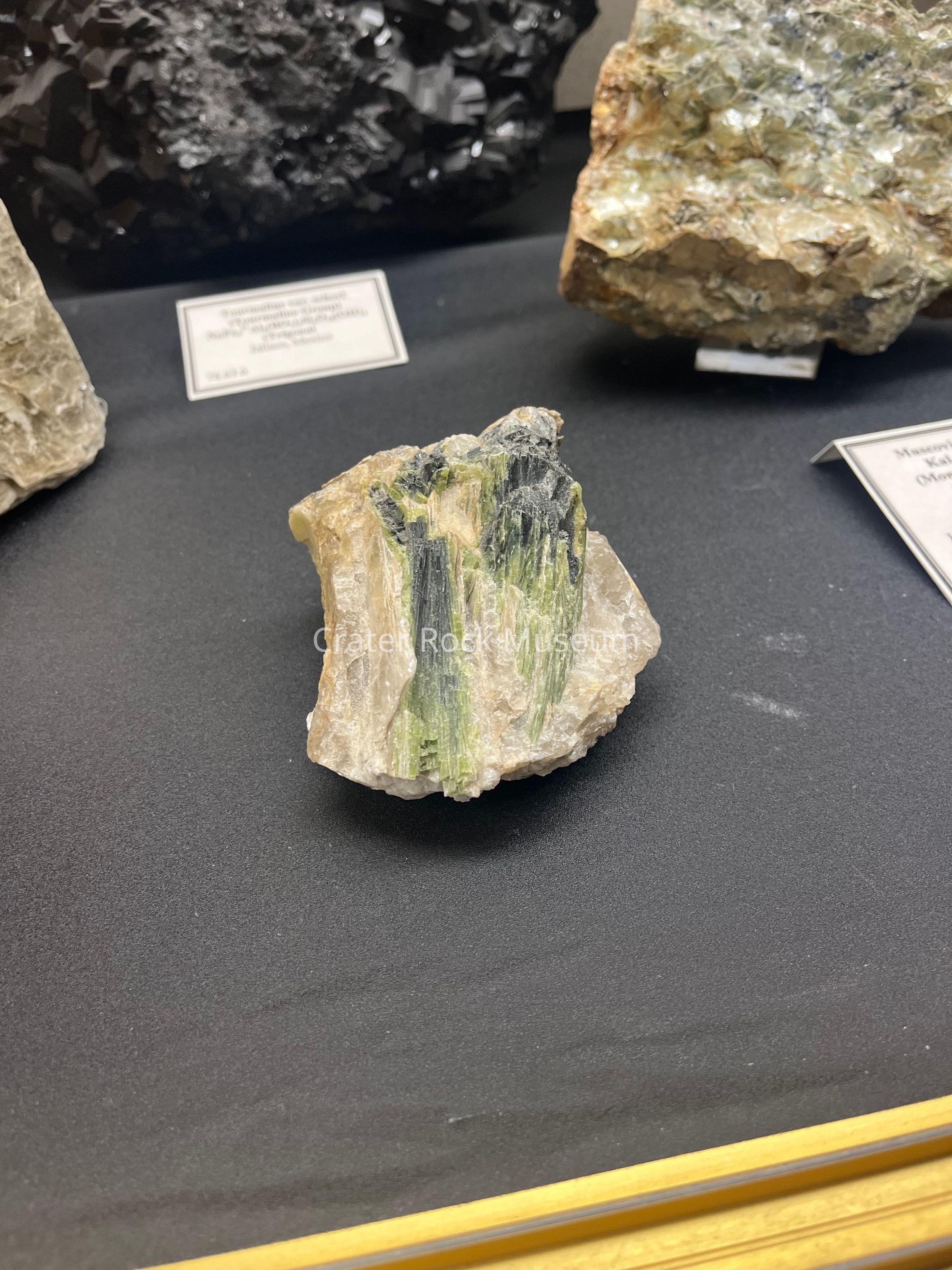 Description: Mica crystals, white to silver, called book mica because of its thin sheet effect, some tourmaline crystals, black and green, on it. From Maine.