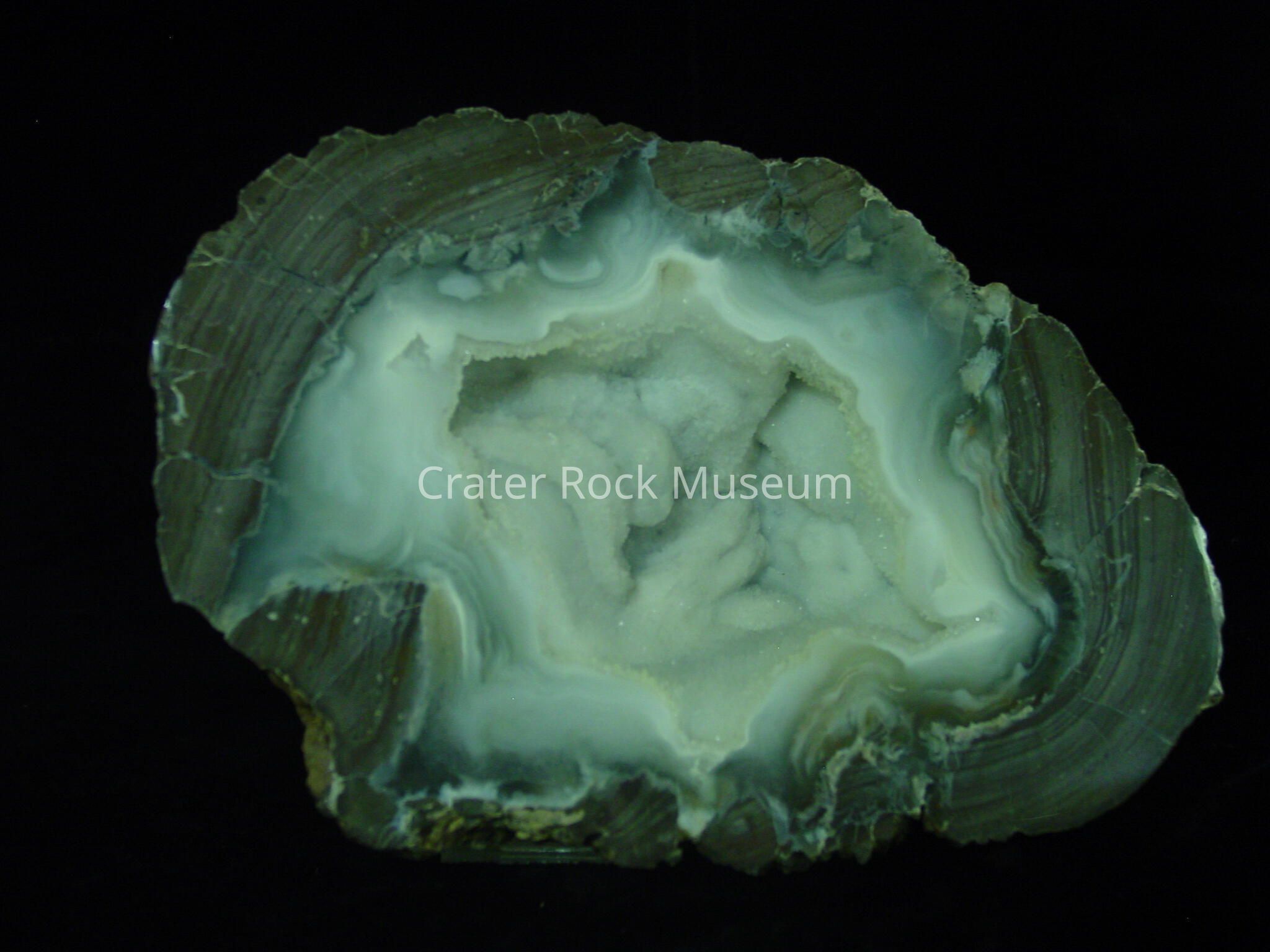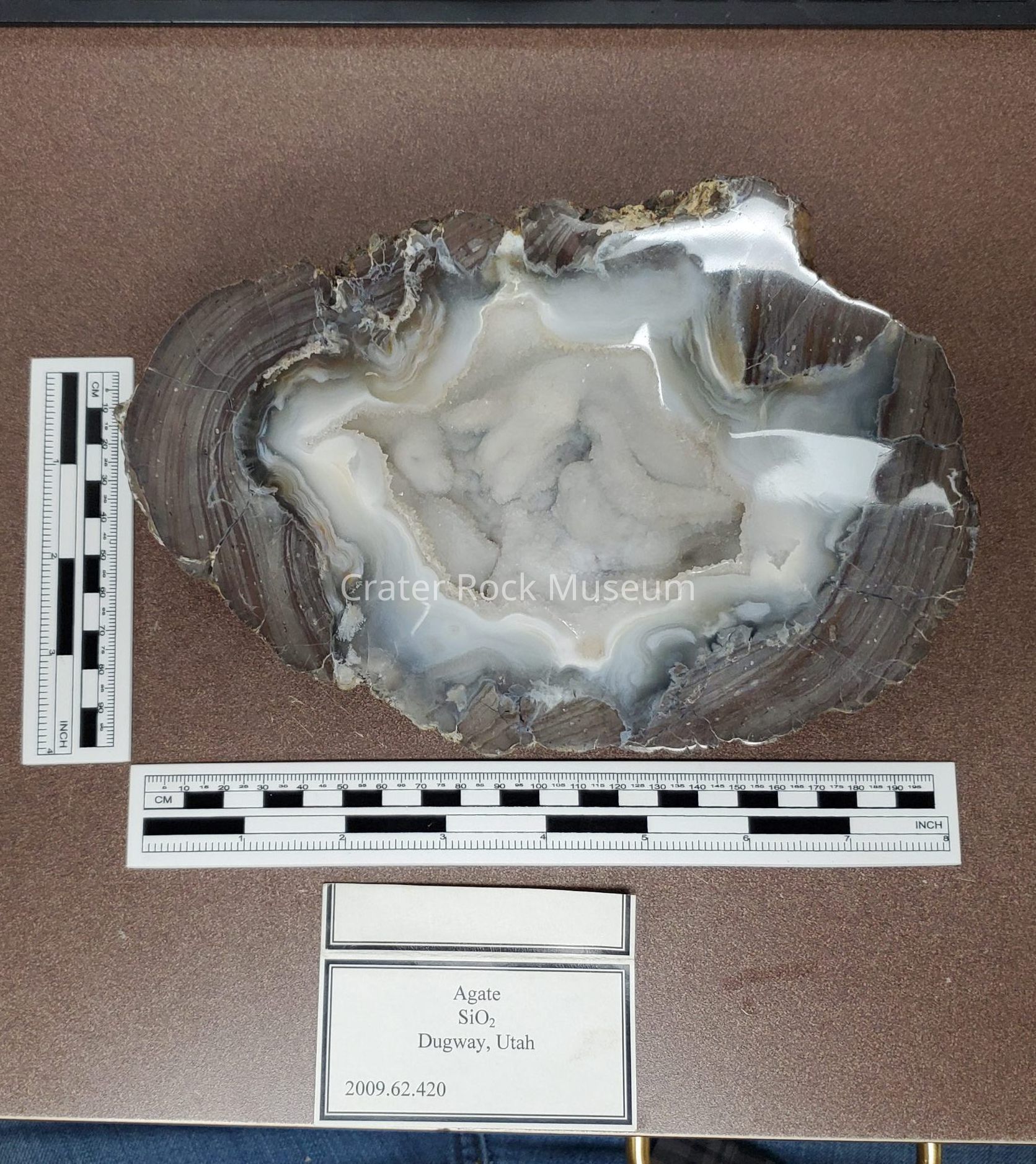 Description: Thick rounded back with polished face. Banded dark to light gray-brown outer area with blue-gray inner area, surrounding a hollow cavity with a druzy white crystalline center.