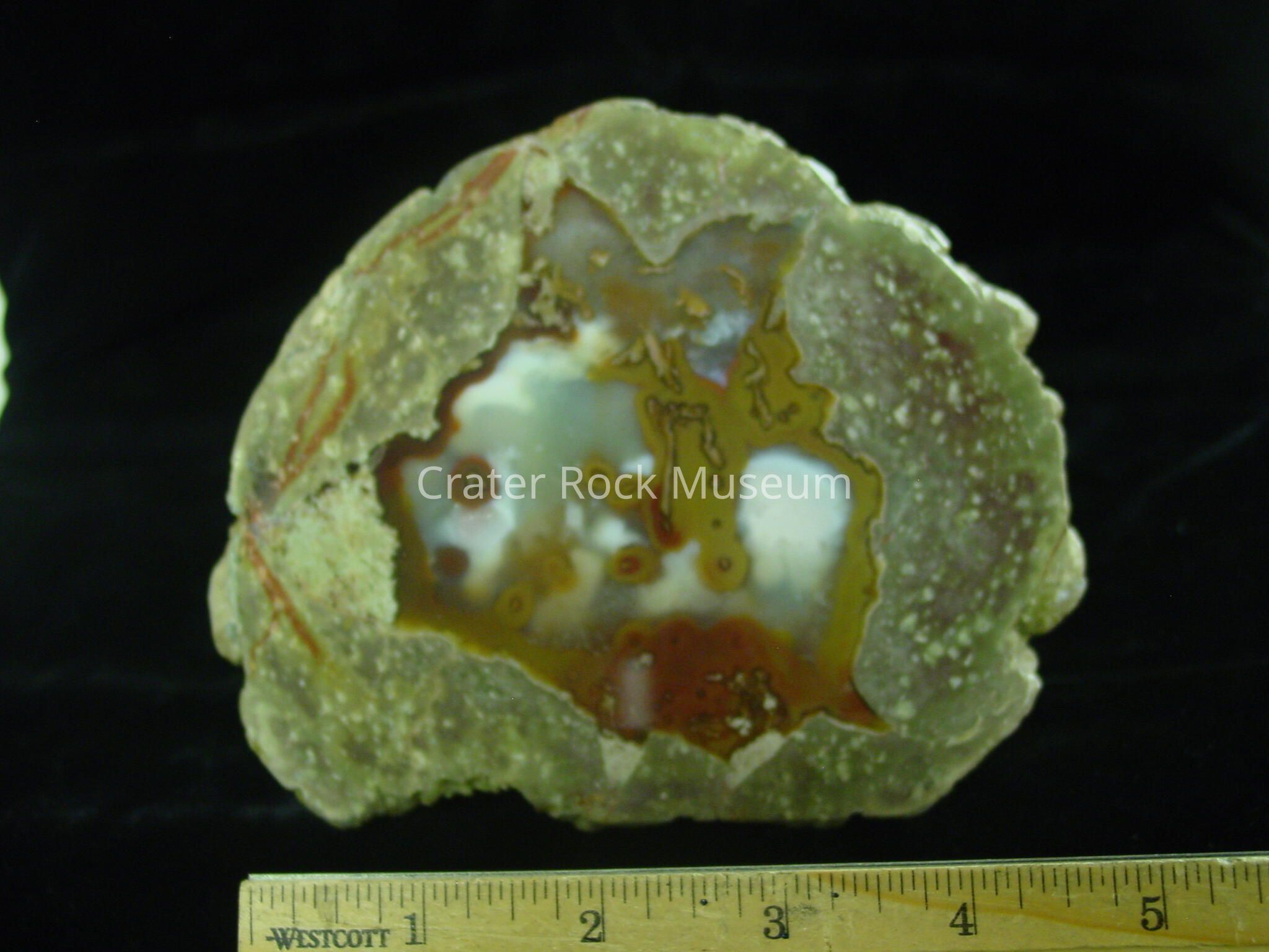Description: Thick, rough, rounded back with polished face. Light olive green with light tan spots on outer area, with a translucent, red brown, white, and blue-gray center.Collection