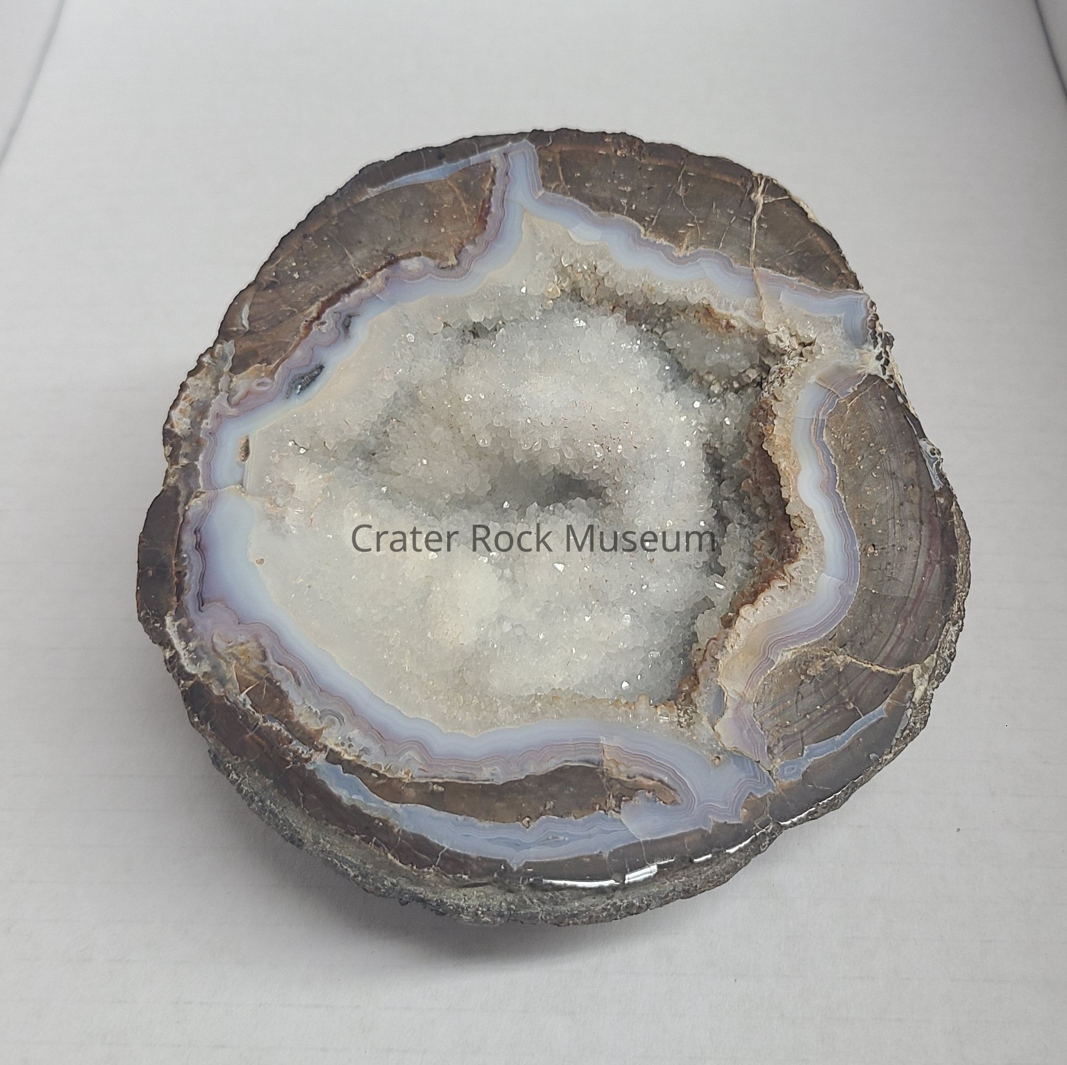 A Thunderegg from Dougway, UT. Cut side shows White Crystalline center surrounded by Red, White and Blue Agate. Surrounding rock is in Brown, Red and Grey.Dimensions