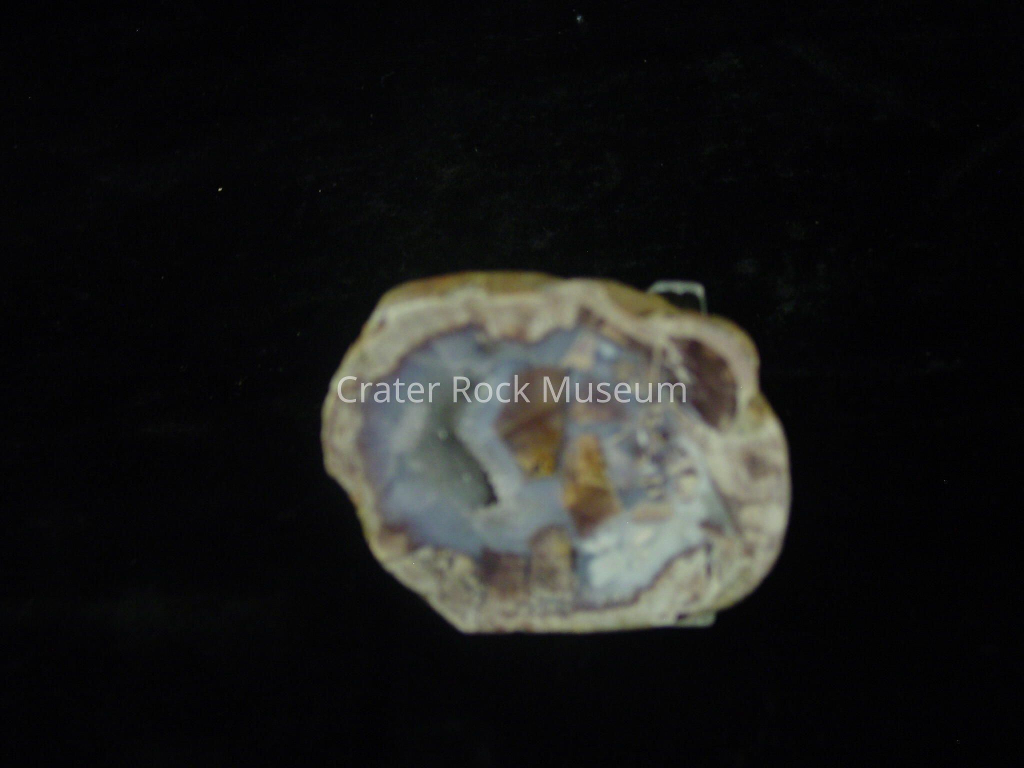 Description: Small, rounded back with polished face. Spotted beige on outer area with dark gray mixed with other shades of gray mixed in with various shades of magenta.