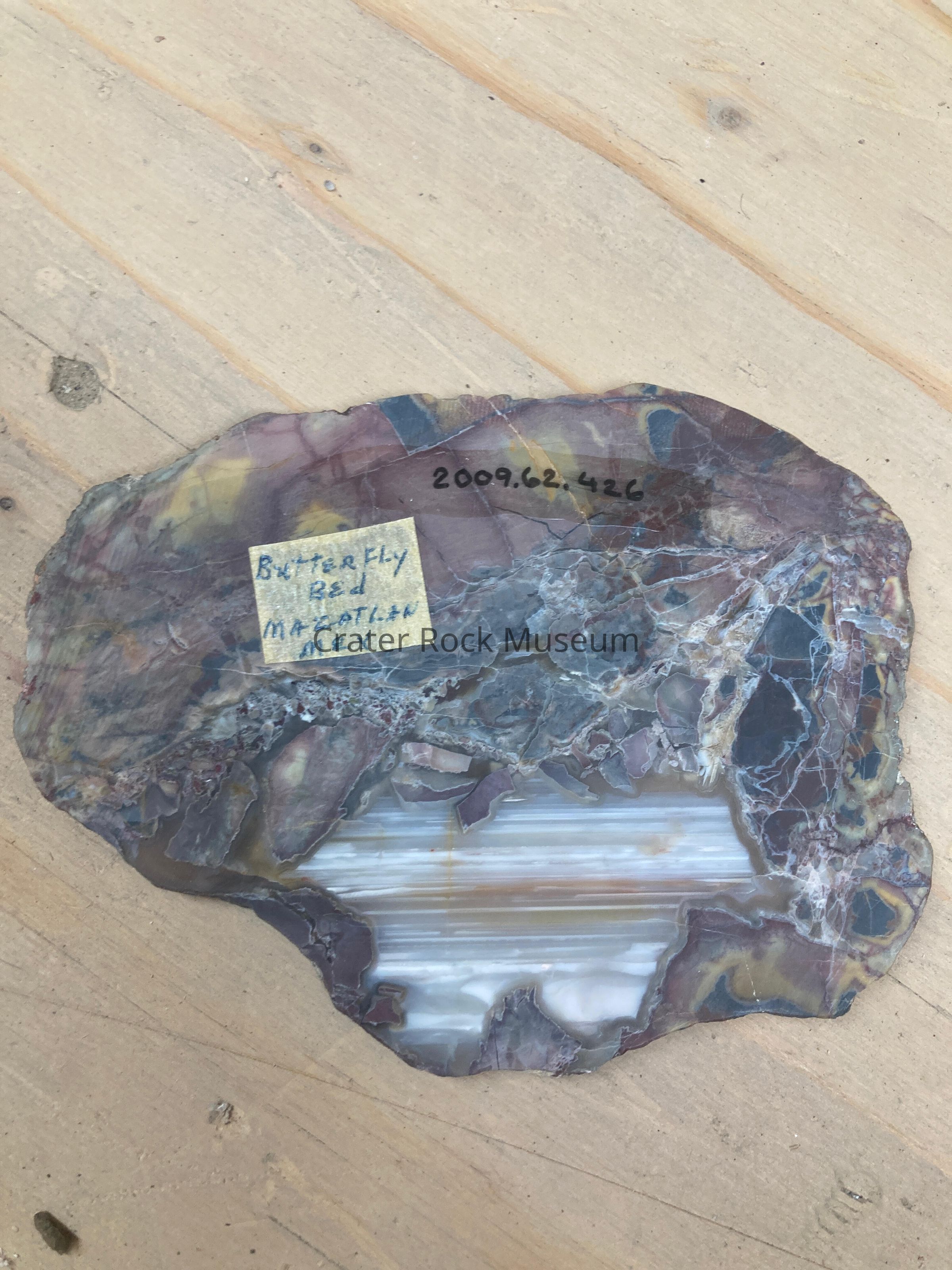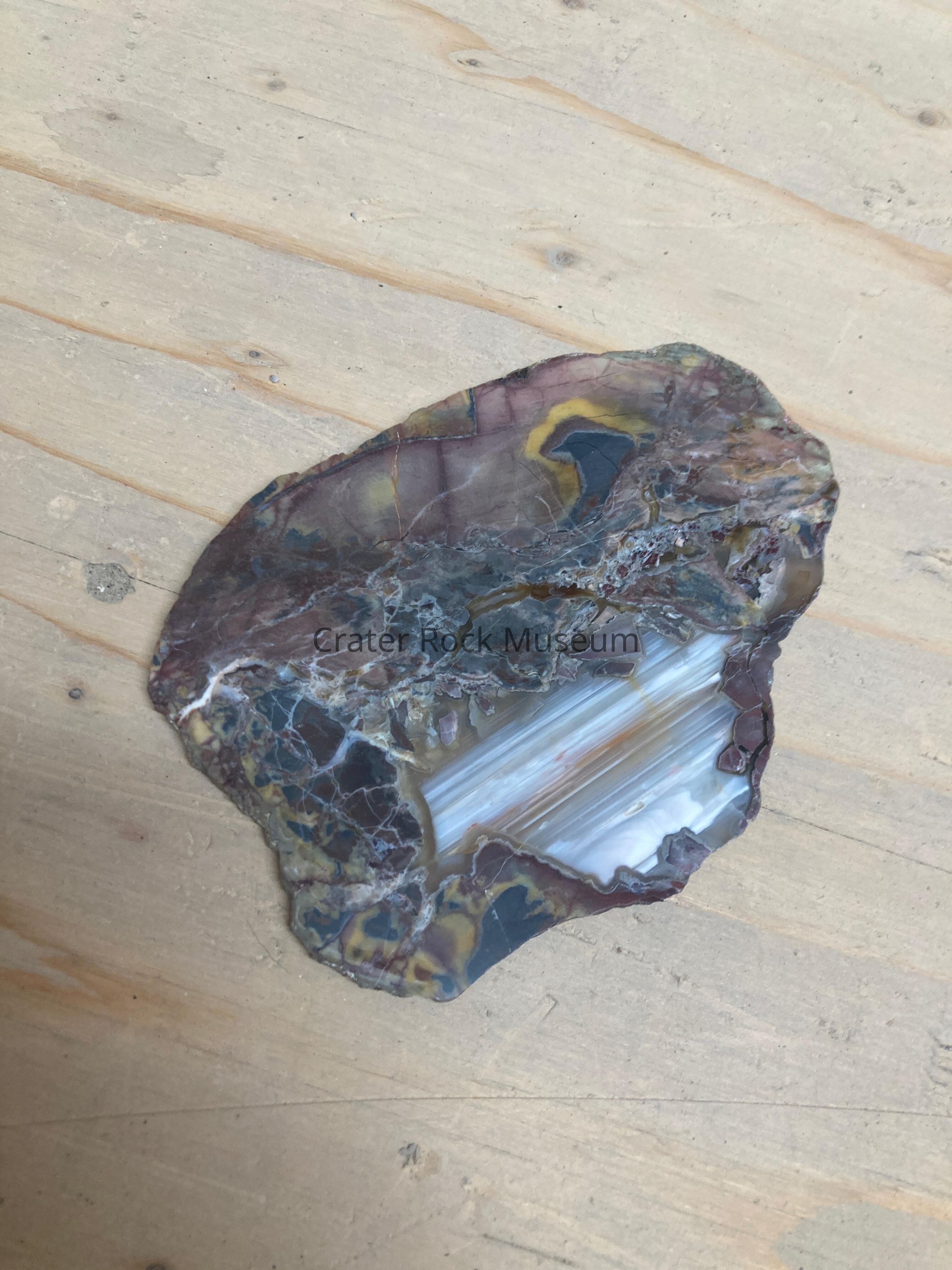 Description: Thin slice with polished face. Non-uniform cells with pinkish brown, dark browns, blue-grays, and yellow, with one area of banded white, grays, and burnt yellow.