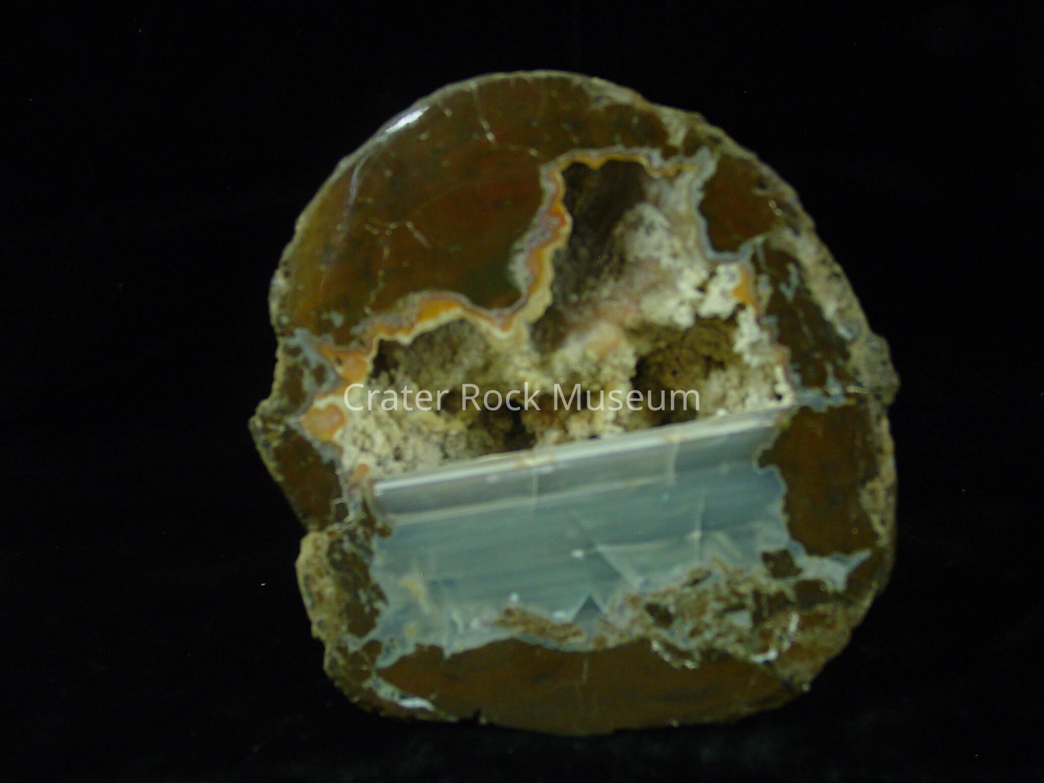 Description: Thick slab with polished face. Solid brown outer areas with hemispheres in the center, one with banded translucent blue-green and white and the other half a hollow cavity with a coarse-grained, beige interior with an orange band surrounding the cavity.