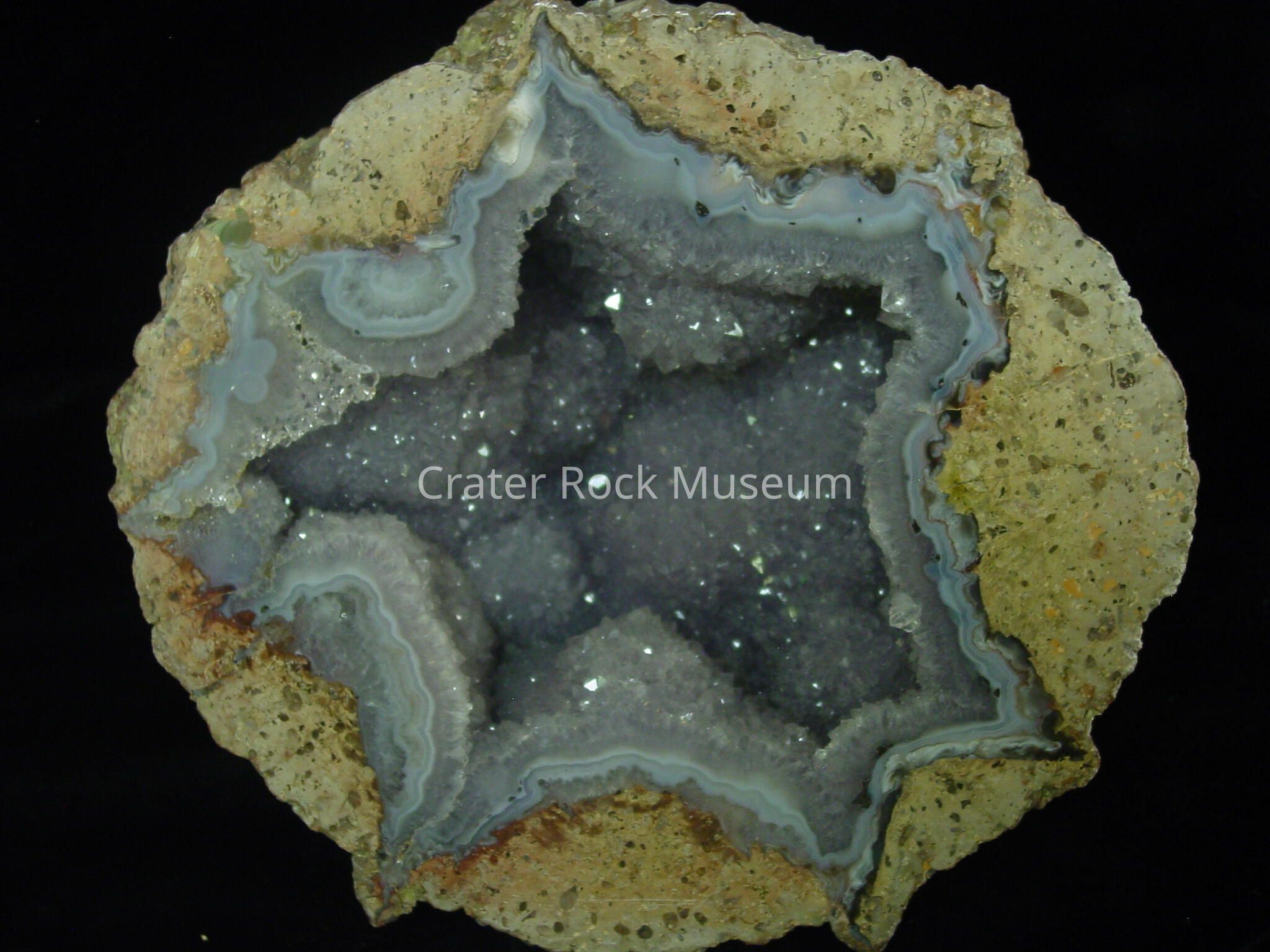 Description: Very thick rounded back with polished face. Brownish-red outer area with some burnt yellow. A black band surrounds a smokey-gray inner band with some streaking, and a large, deep, hollow cavity with dull-white flat plane and druzy blue-gray crystalline structure with some stalagmites present.Collection