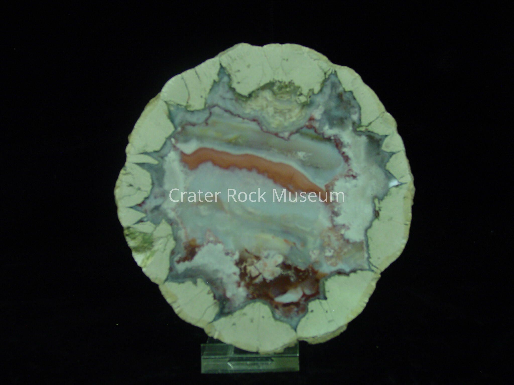 Description: Rounded back with polished face. Beige chambered outer area with translucent blue-gray, white, magenta, and dull pink with slight banding.Collection