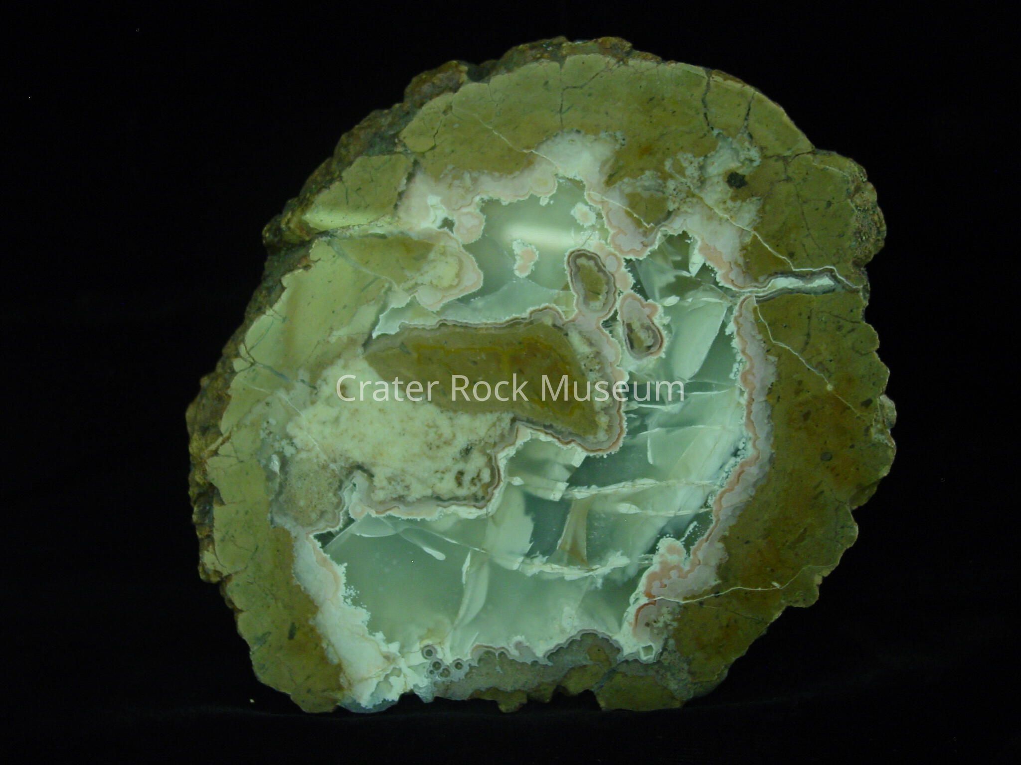 Description: Rough, rounded back with polished face. Spotted (black) beige outer area with a black and reddish band next to a white crystalline band surrounding a hollow cavity with blue-gray and white crystals in the center.Collection