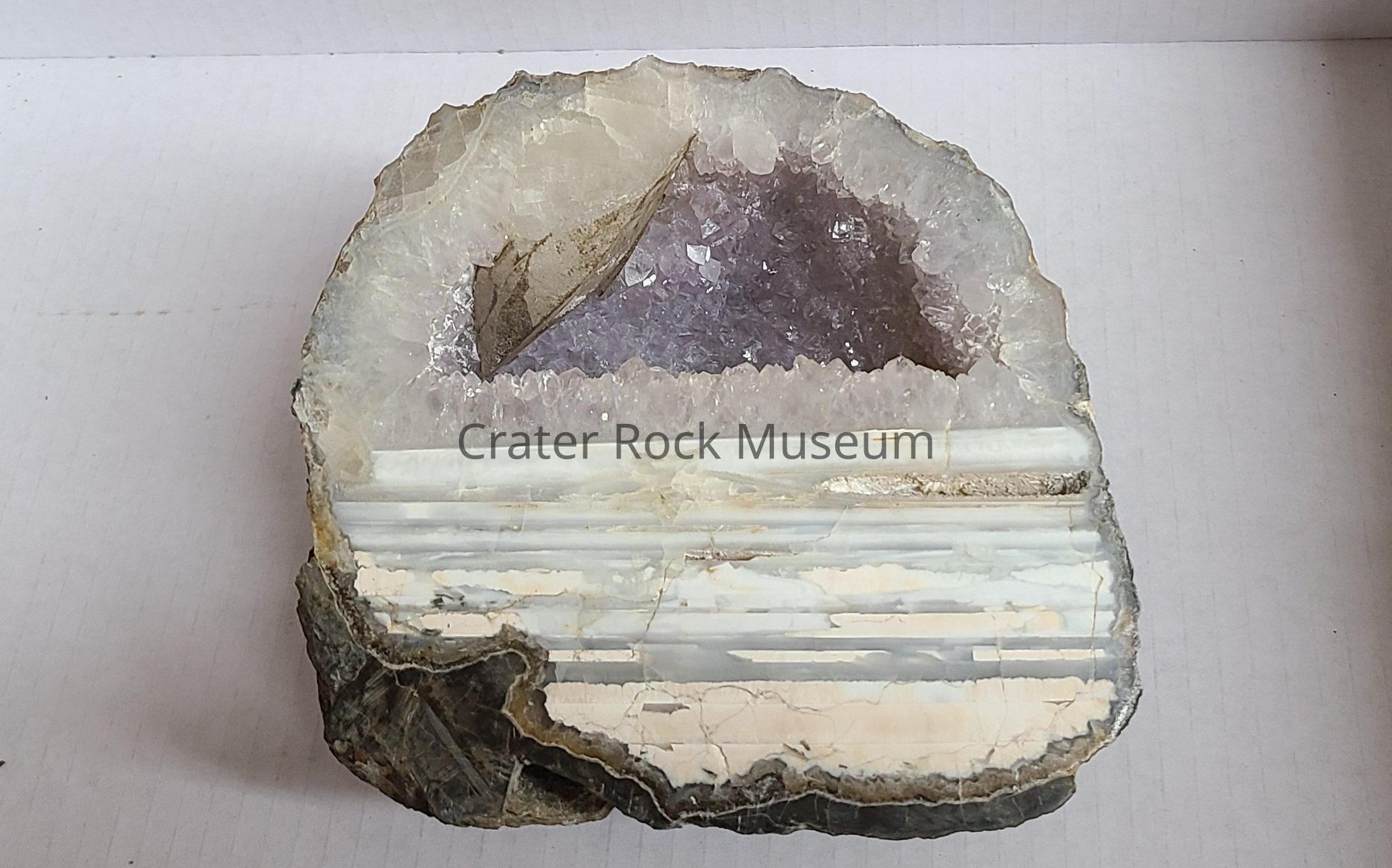 An Agate Nodule from Eastern OR. Polished side shows a large open Crystalline area with some faint Amethyst coloring and White. A large Calcite Crystal is embedded in this area. Next to Crystalline area is an area of bedding lines in Opaque rock in White, Blues and Greys. Some lines are cracked and are Crystalline, two are open. Surrounding rock is in Dark Greys.Dimensions