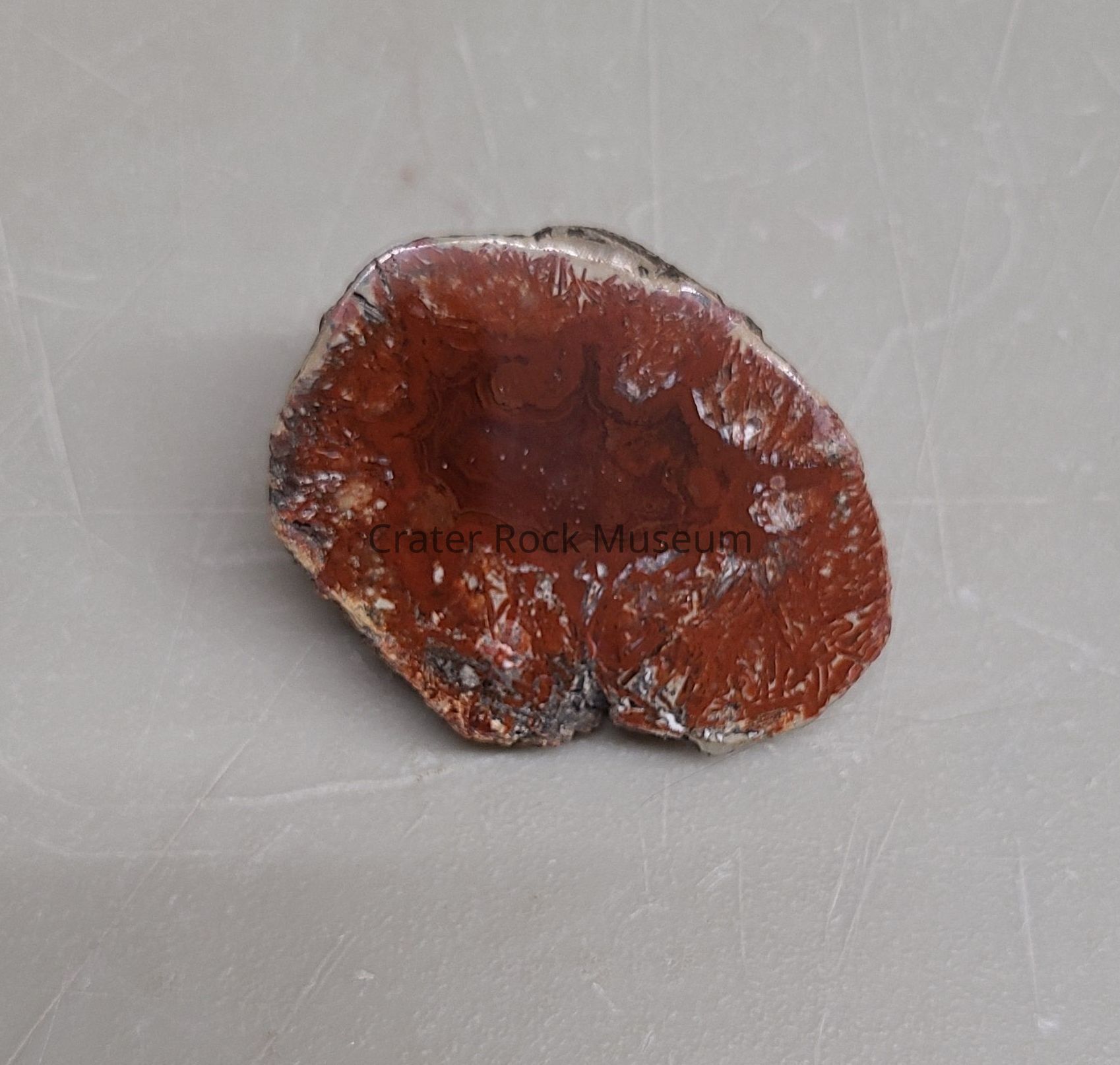 Description: Small, thick rounded back with polished face. Outer region is reddish brown with some tan spotting and a solid brownish-red center.Collection